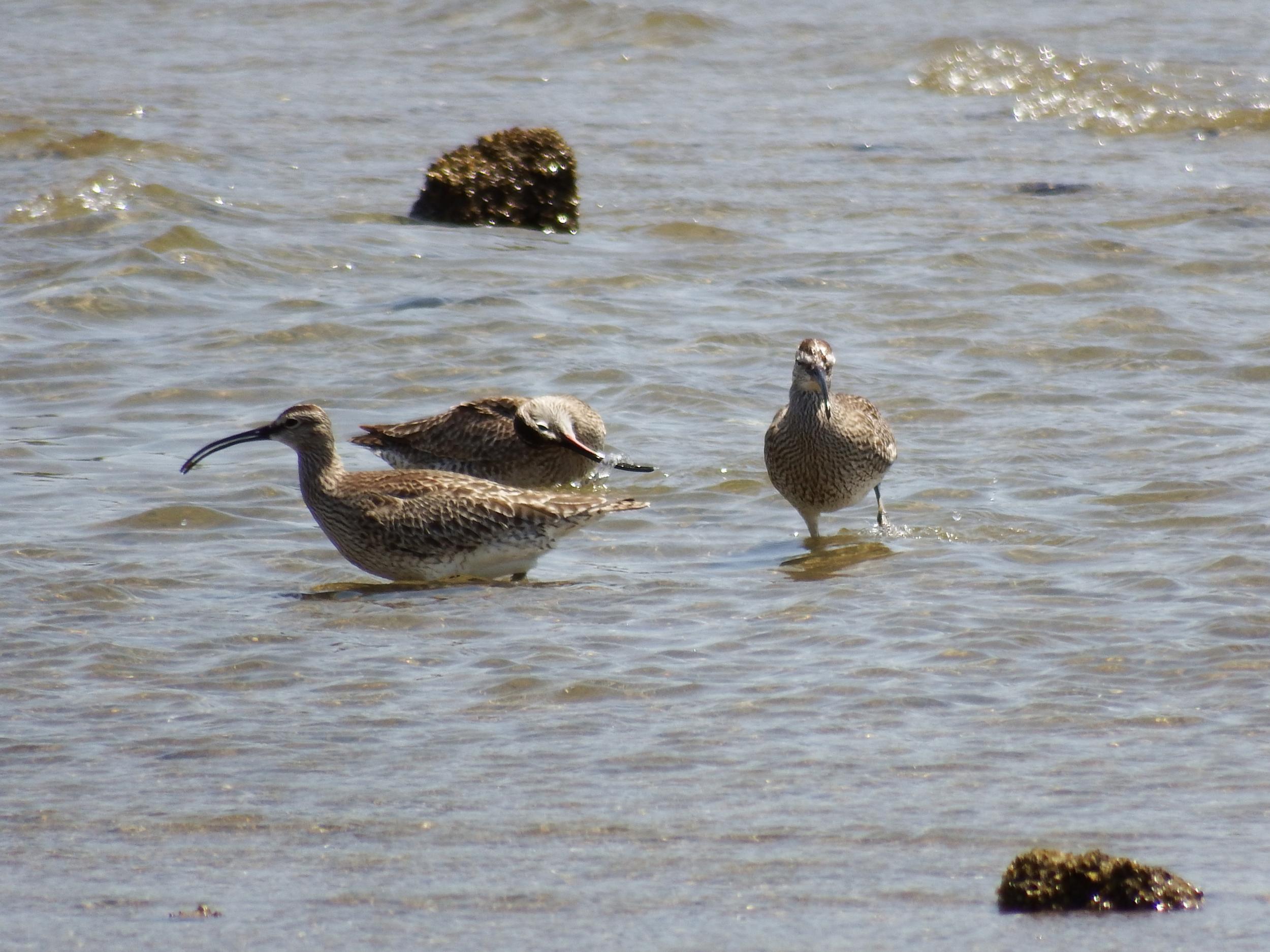 春の渡りで多数やってくるチュウシャクシギですが、なぜか秋の渡りで見かけることはまれで、北行きと南行きでルートが異なるようです。キアシシギとコアジサシは仲良くお寛ぎ中。