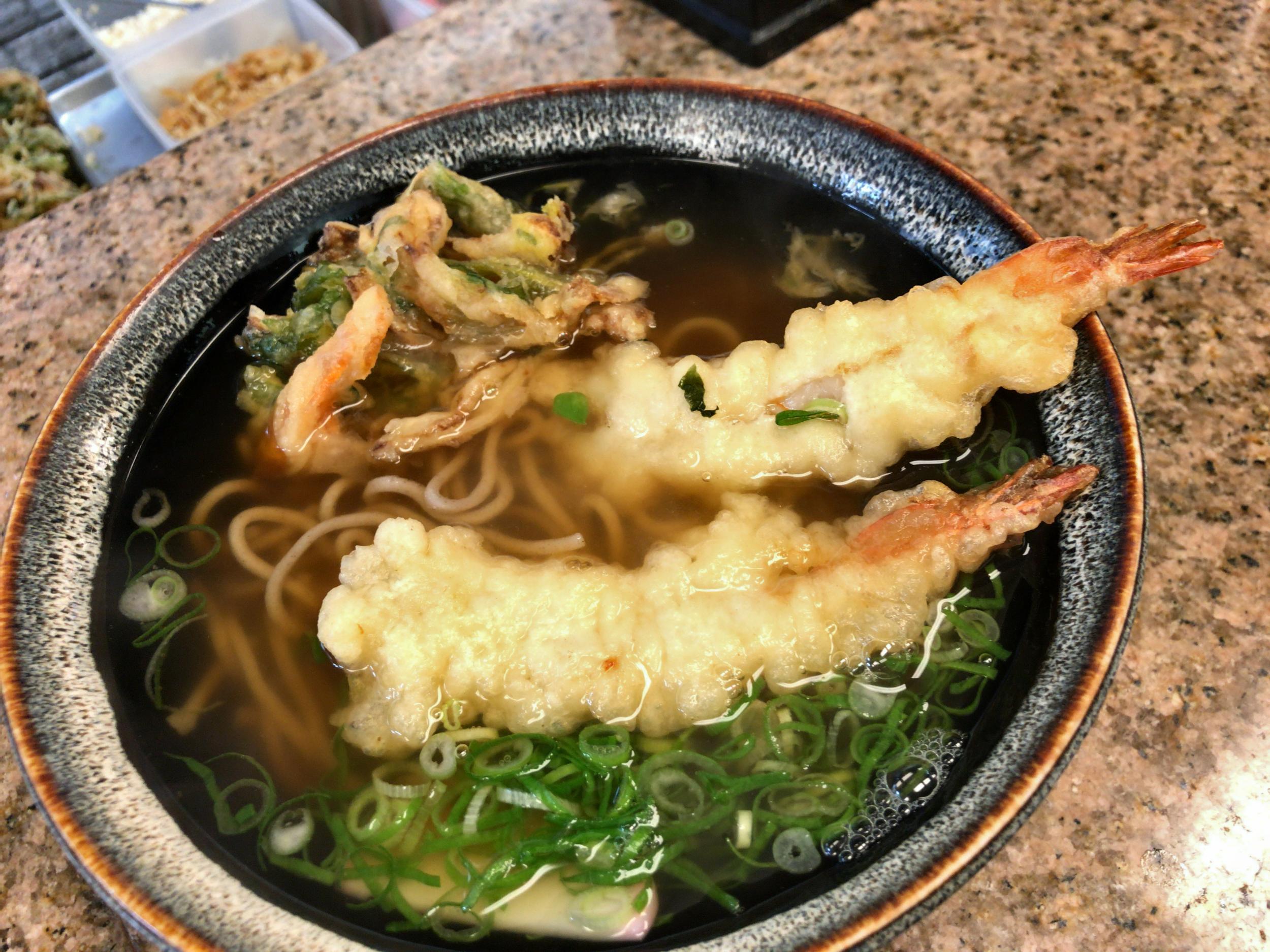 海老天が2本入ってますが厚いコロモを剥くと直径約1cmのぶにょっとしたエビ、カラッと揚がったハーフカットのかき揚げは香ばしくて美味しく、ふつうにかき揚げそばにしておけば良かったです。香櫨園に到着。