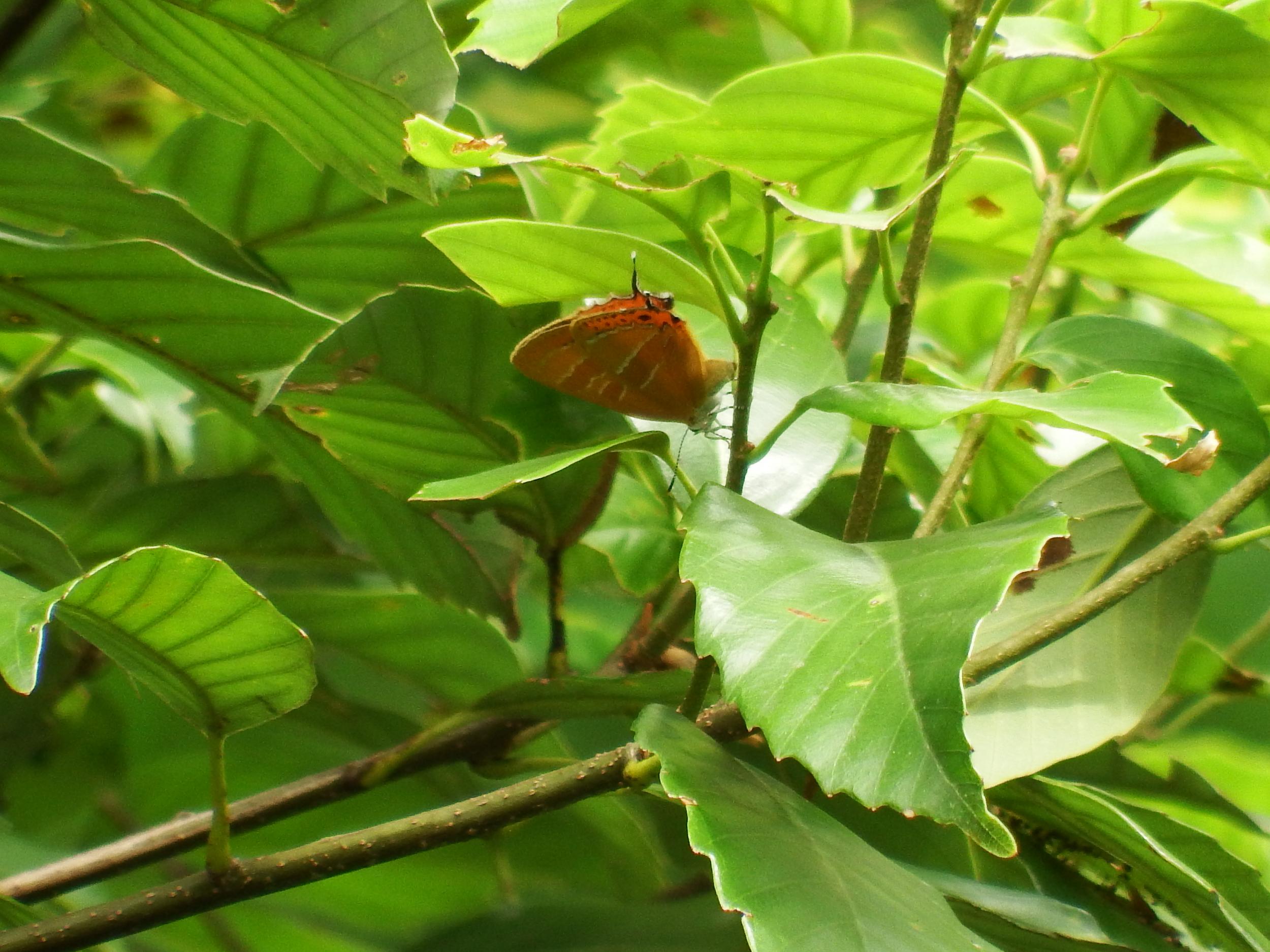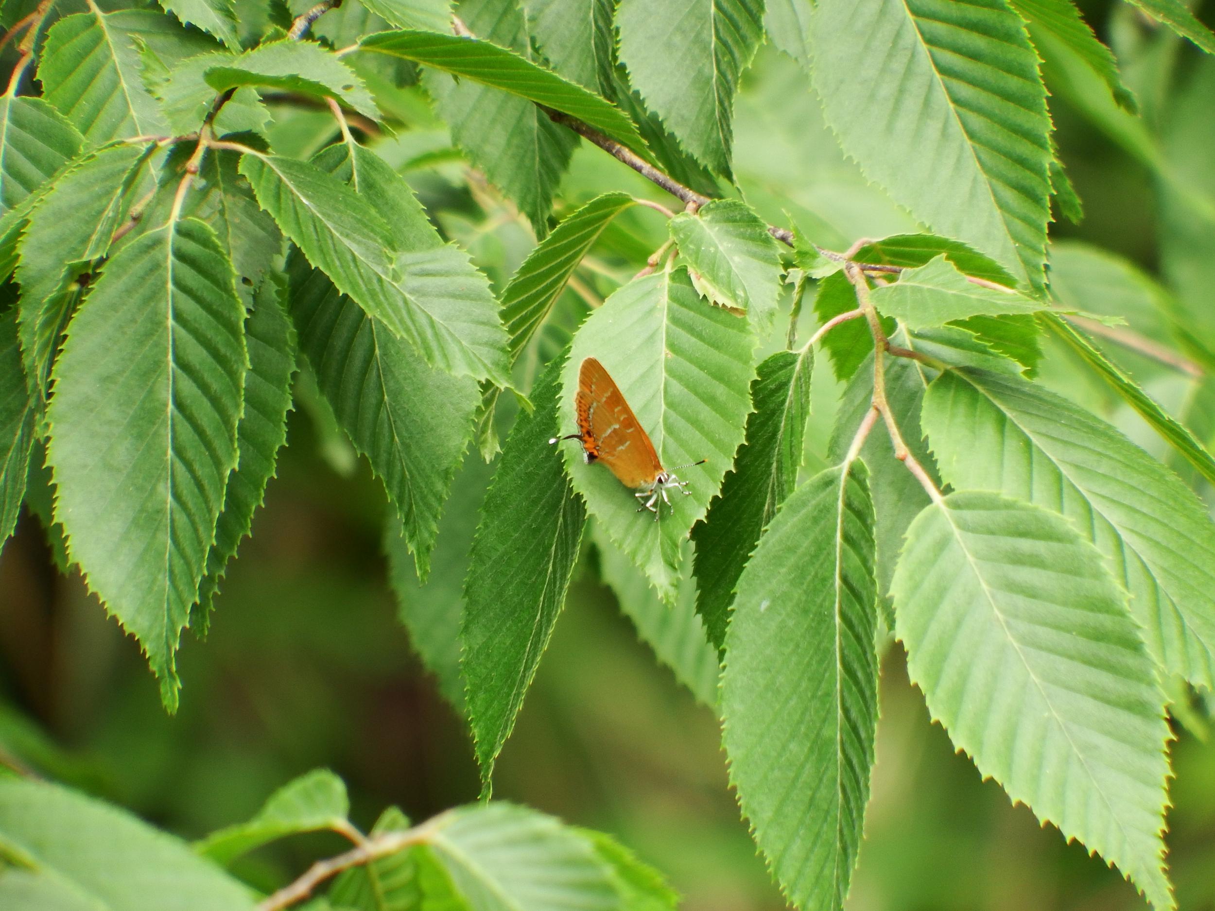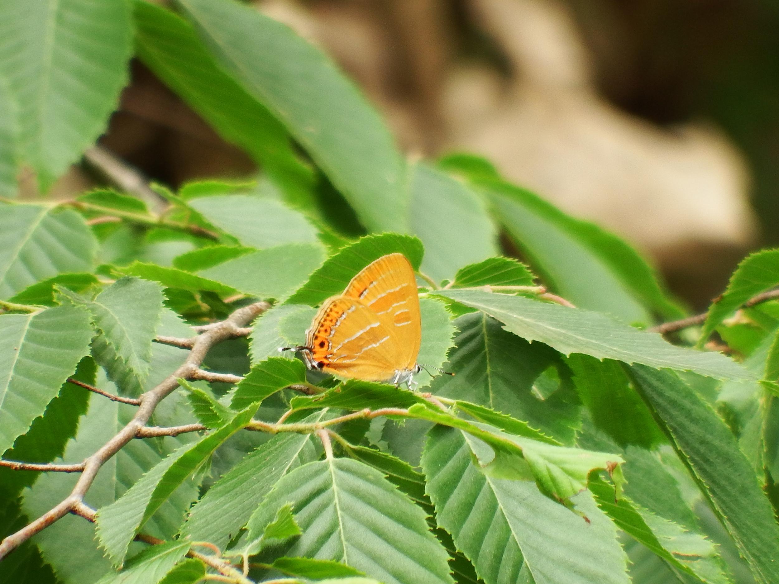 豊浦橋の上を見覚えのあるオレンジ色の蝶が舞ってます。しばらく見てると葉っぱに止まってくれました。ゼフィルスのアカシジミ。
