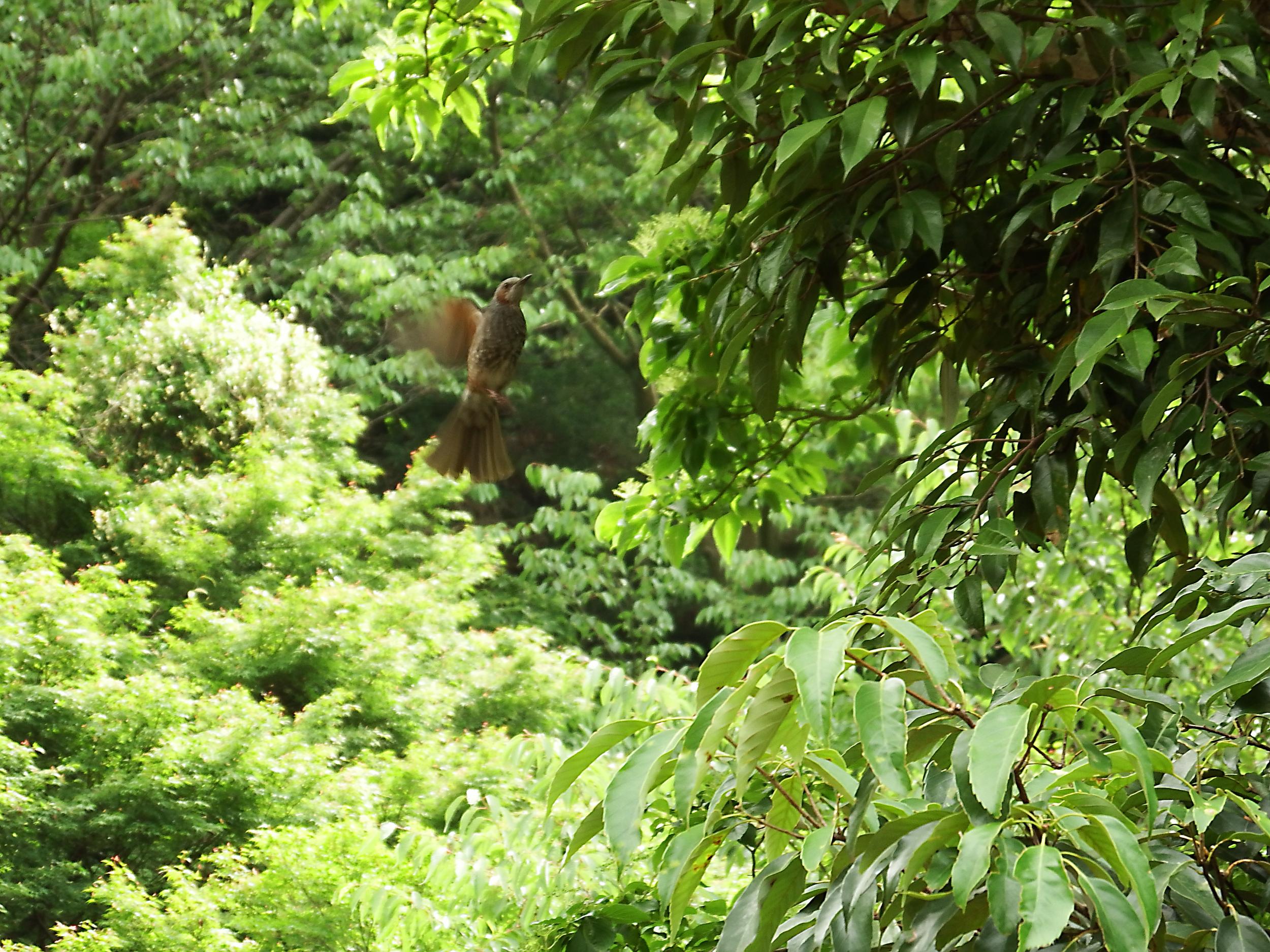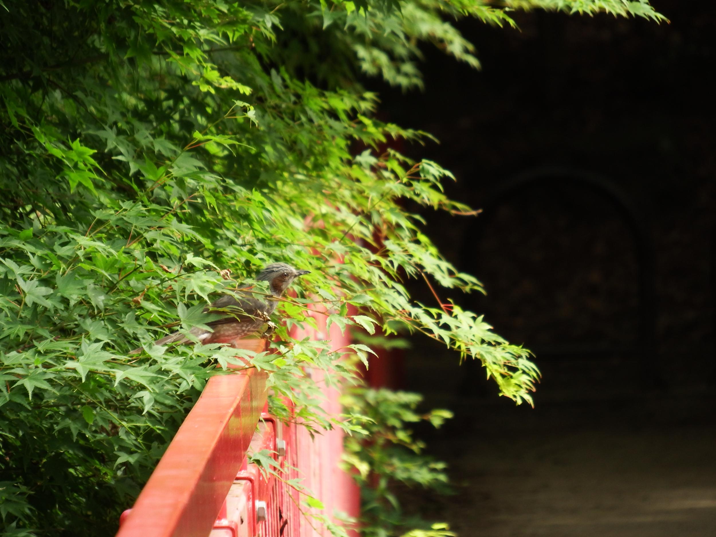 豊浦橋まで下りてきました。葉陰に隠れていたヒヨドリが飛び出してはホバリングして何かの蜜を吸っています。下りてきて欄干に止まりました。