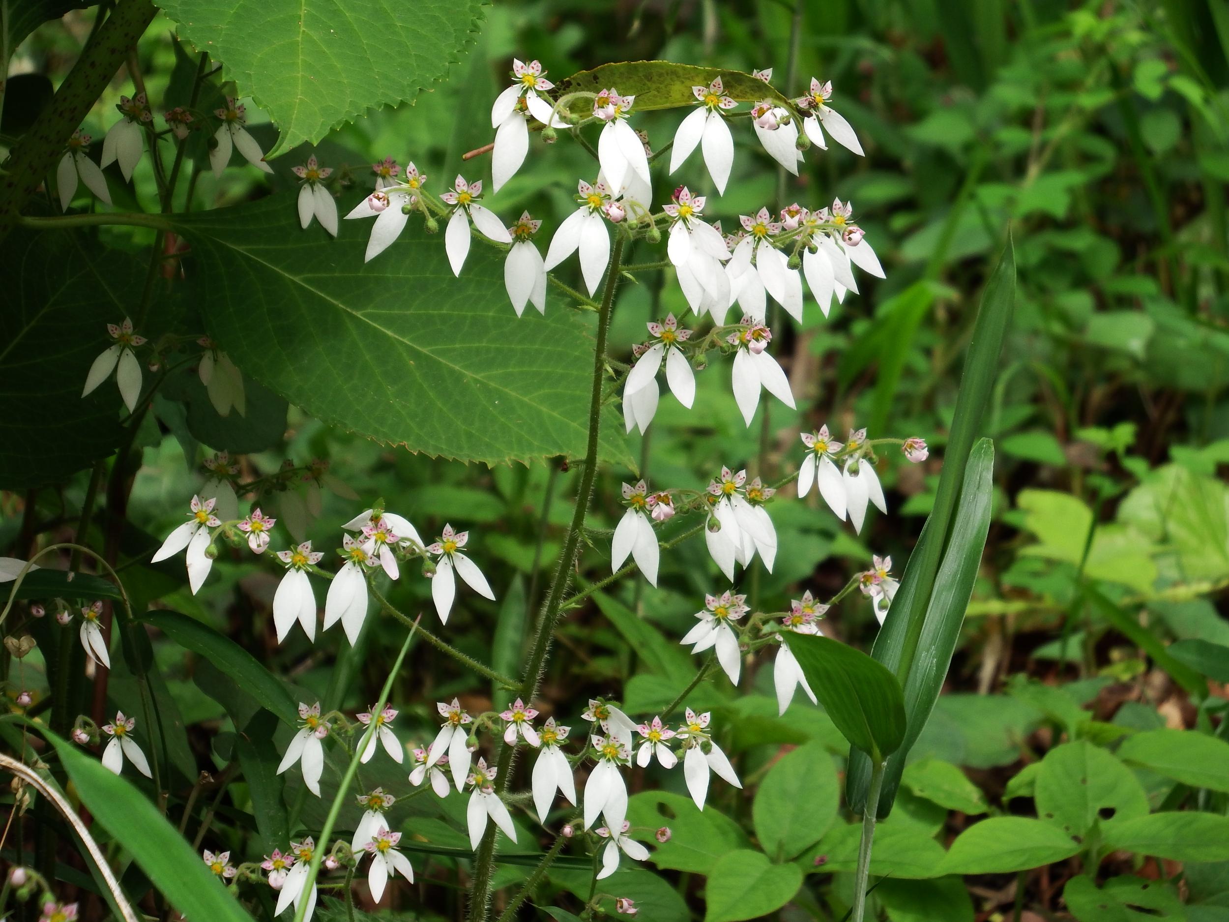 不思議な花を見つけました。5枚の花びらの内、下向きの2枚だけ大きくて真っ白、上向きの3枚はうすいピンクに紅い斑点、「大きな白い花びらが2枚、ピンクの小さな花びらが3枚」をキーワードに漸く判明しました。ユキノシタです。真ん中から、おしべやめしべがむき出しになっています。黄色い部分は花盤というそうです。夏の初めに咲く花なのに、なぜか雪の下、かなり気に入りました。