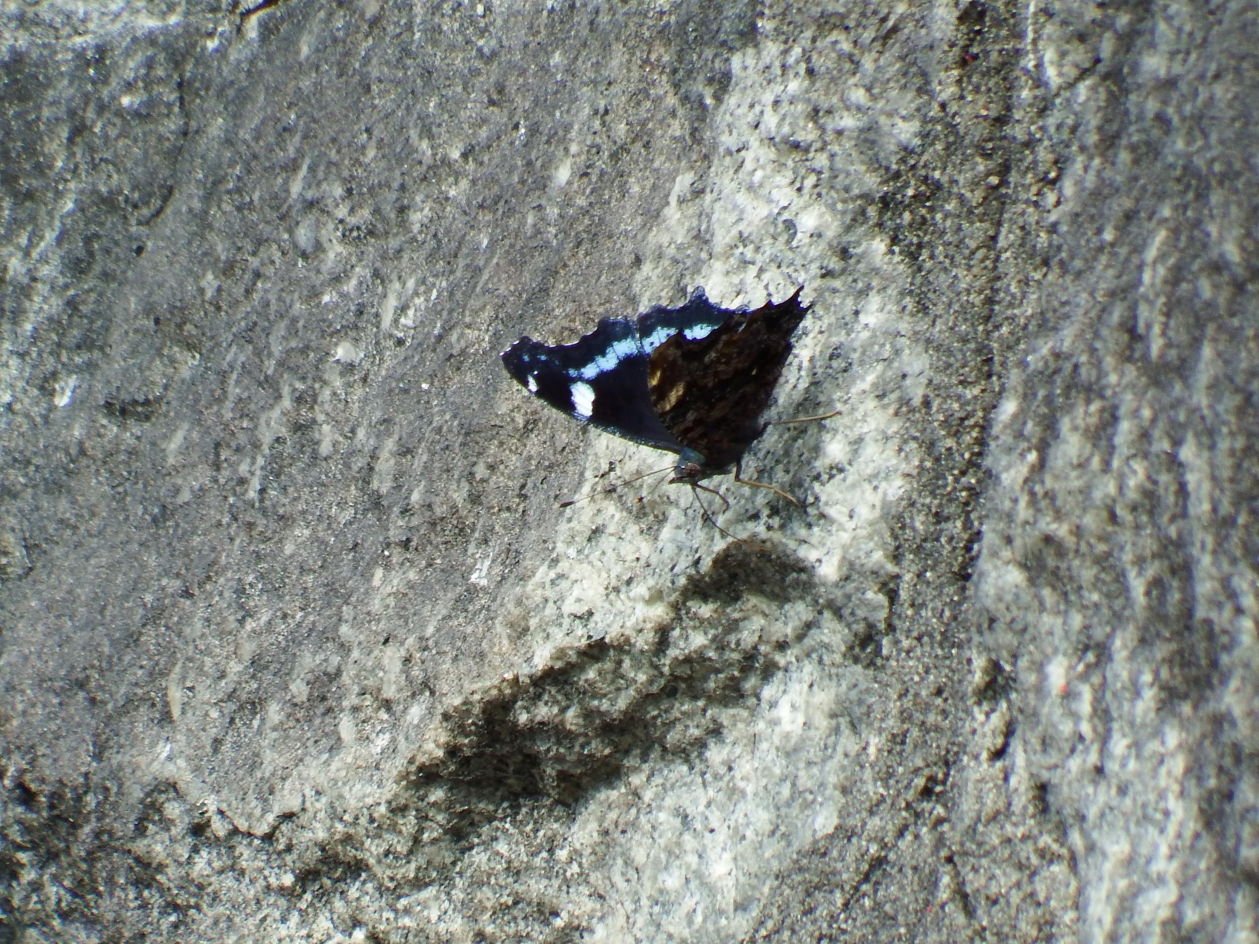 公園を出た住宅街に水色の一本線の黒い蝶、ルリタテハです。