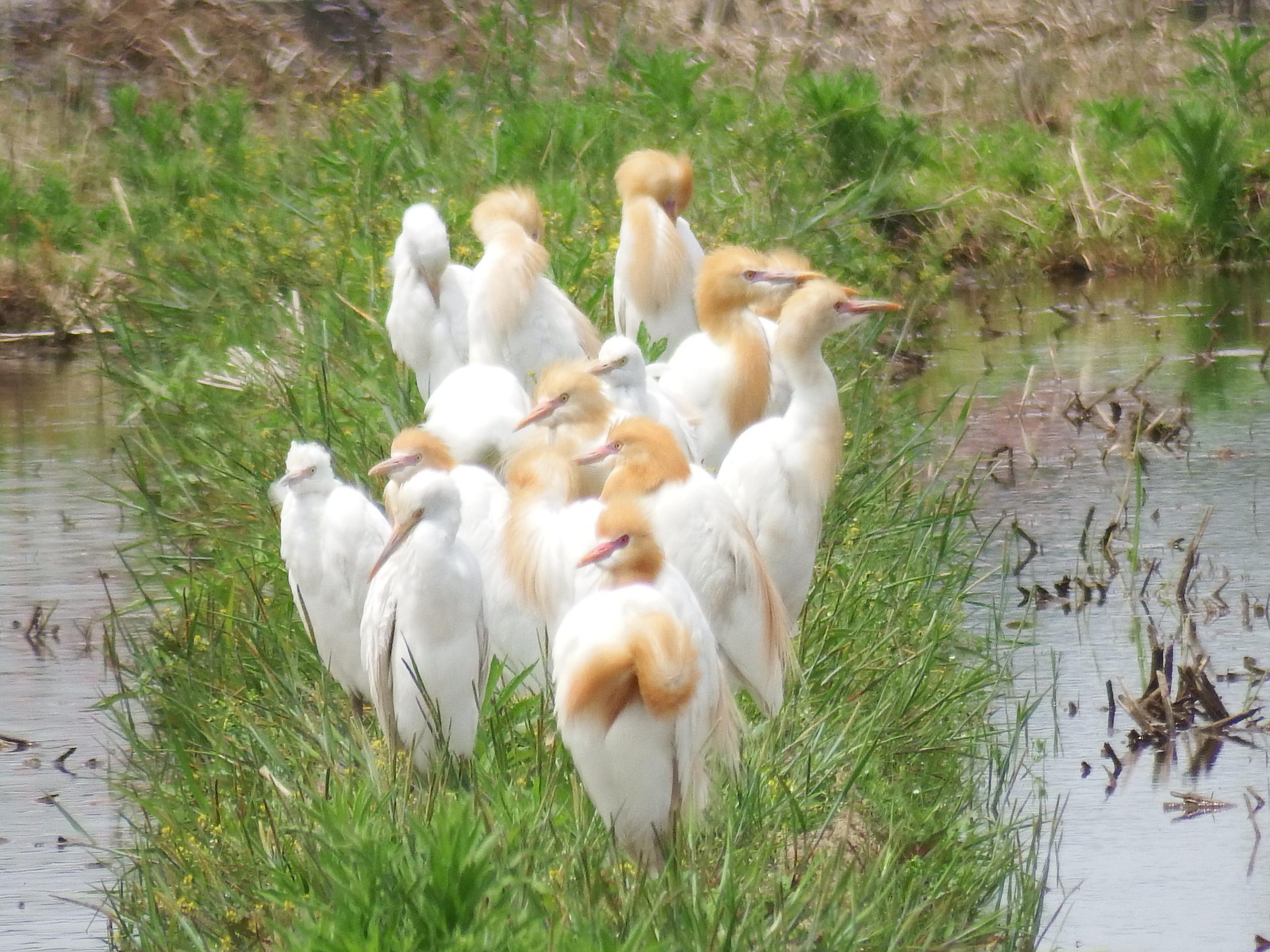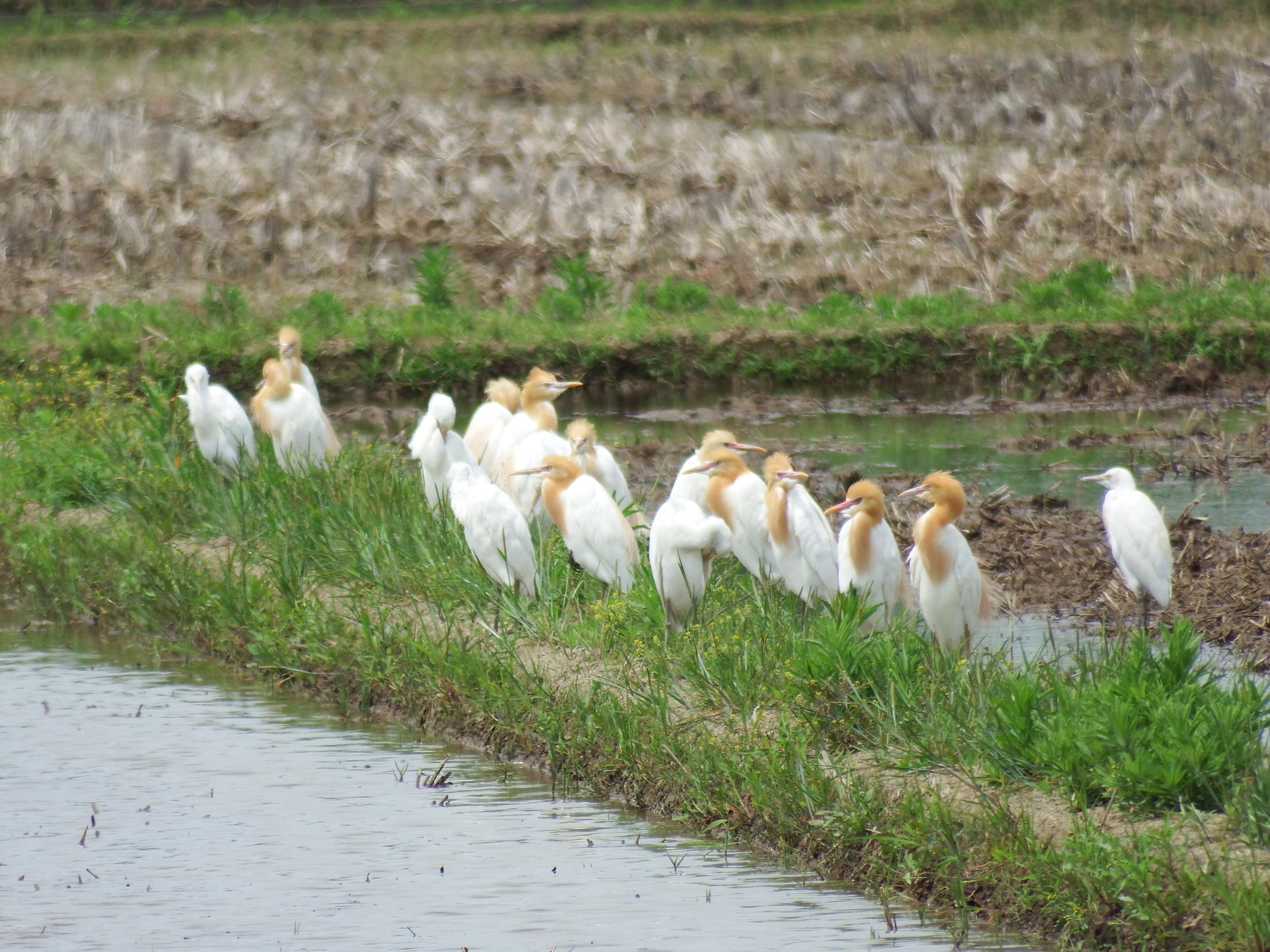 アマサギたちが田んぼの畦道に並んでいます。角度を変えるとかなり密集して見えます。