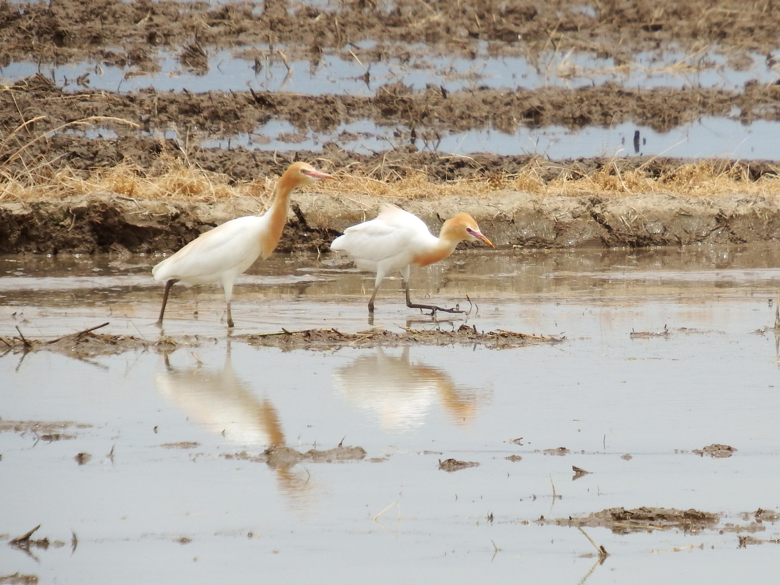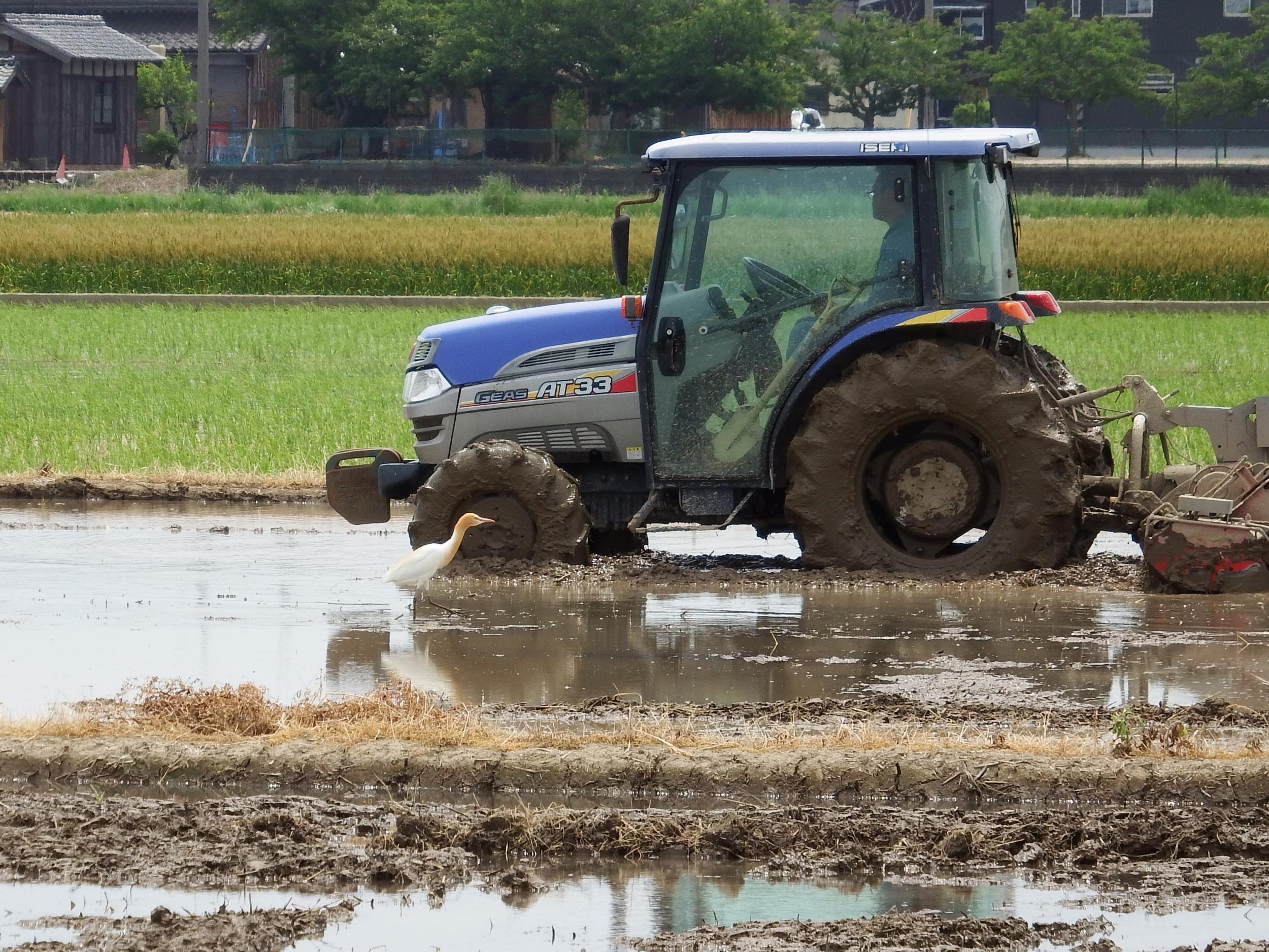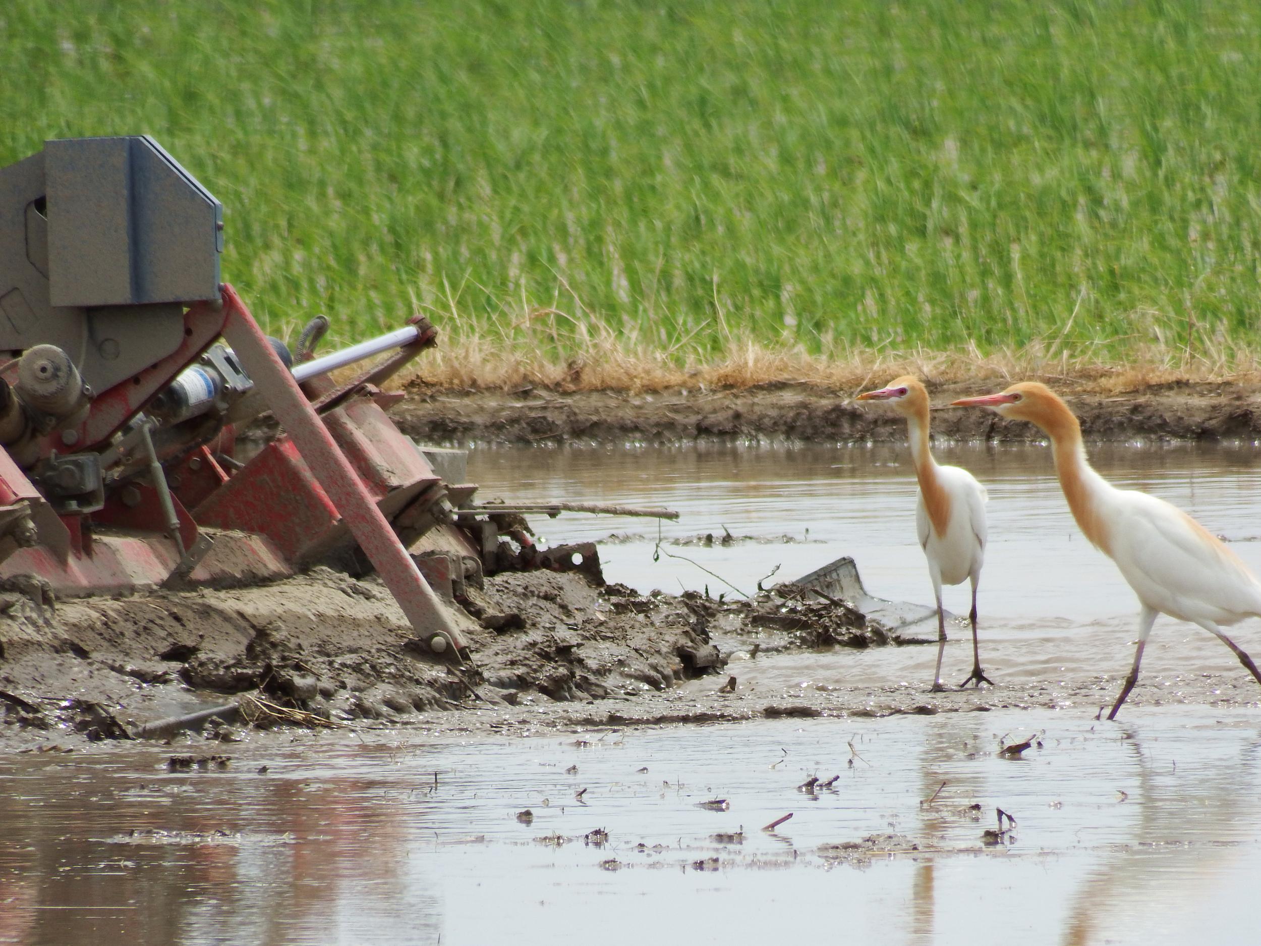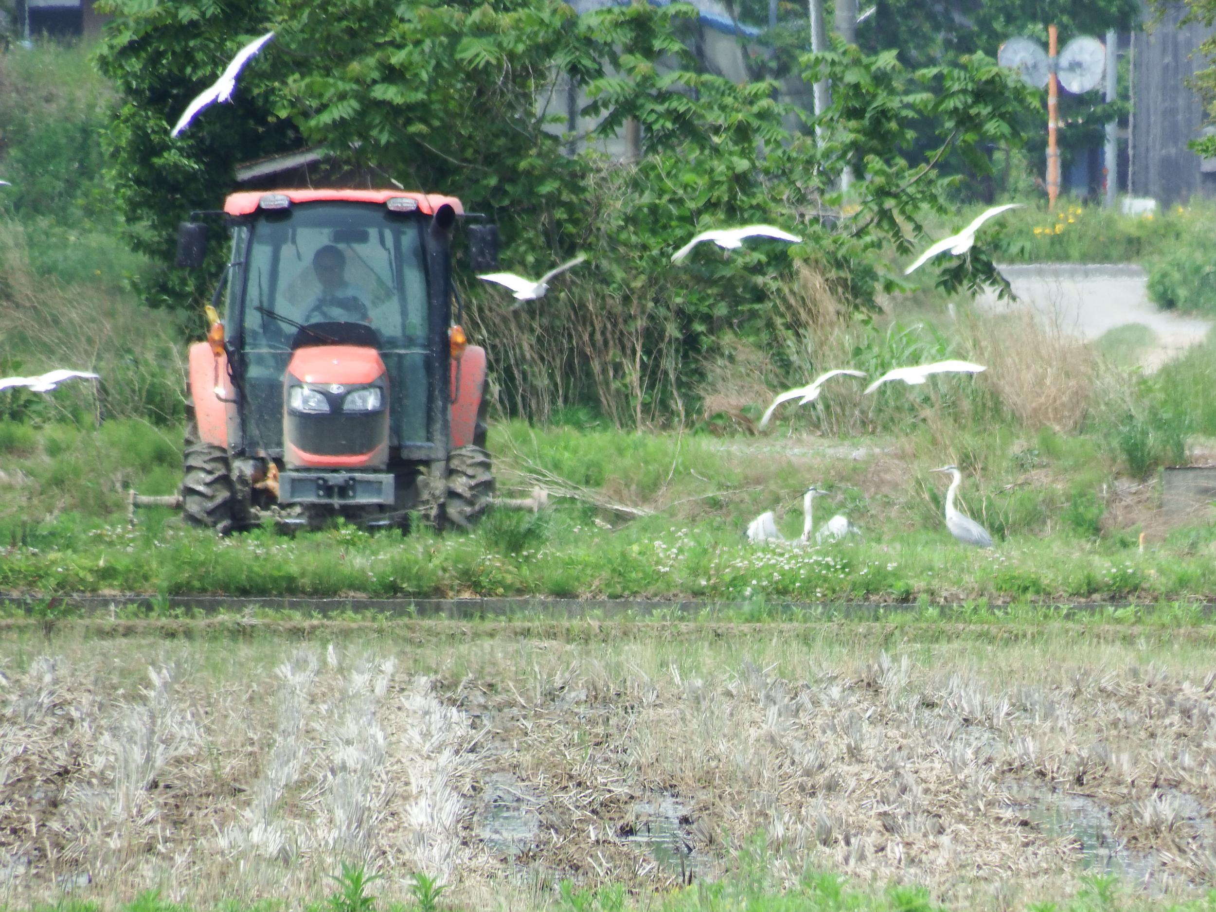 赤いトラクターのところに戻ってくるとまだアマサギたちがいます。遠くからみるとトラクターが耕したばかりところに集まっていて、合点がいきました。トラクターが土を掘り返してくれるので労せずミミズを食べられる、ということです。留鳥のアオサギやダイサギより、渡り鳥のアマサギの方がそのことをよく知っているというのが不思議です。