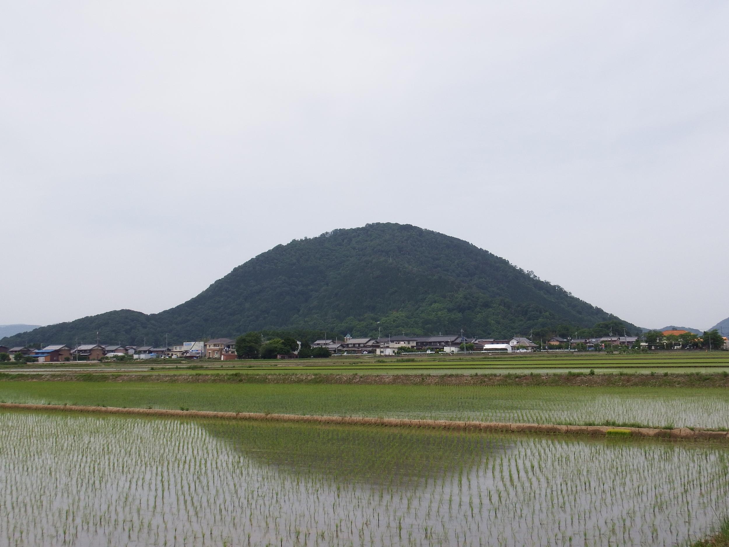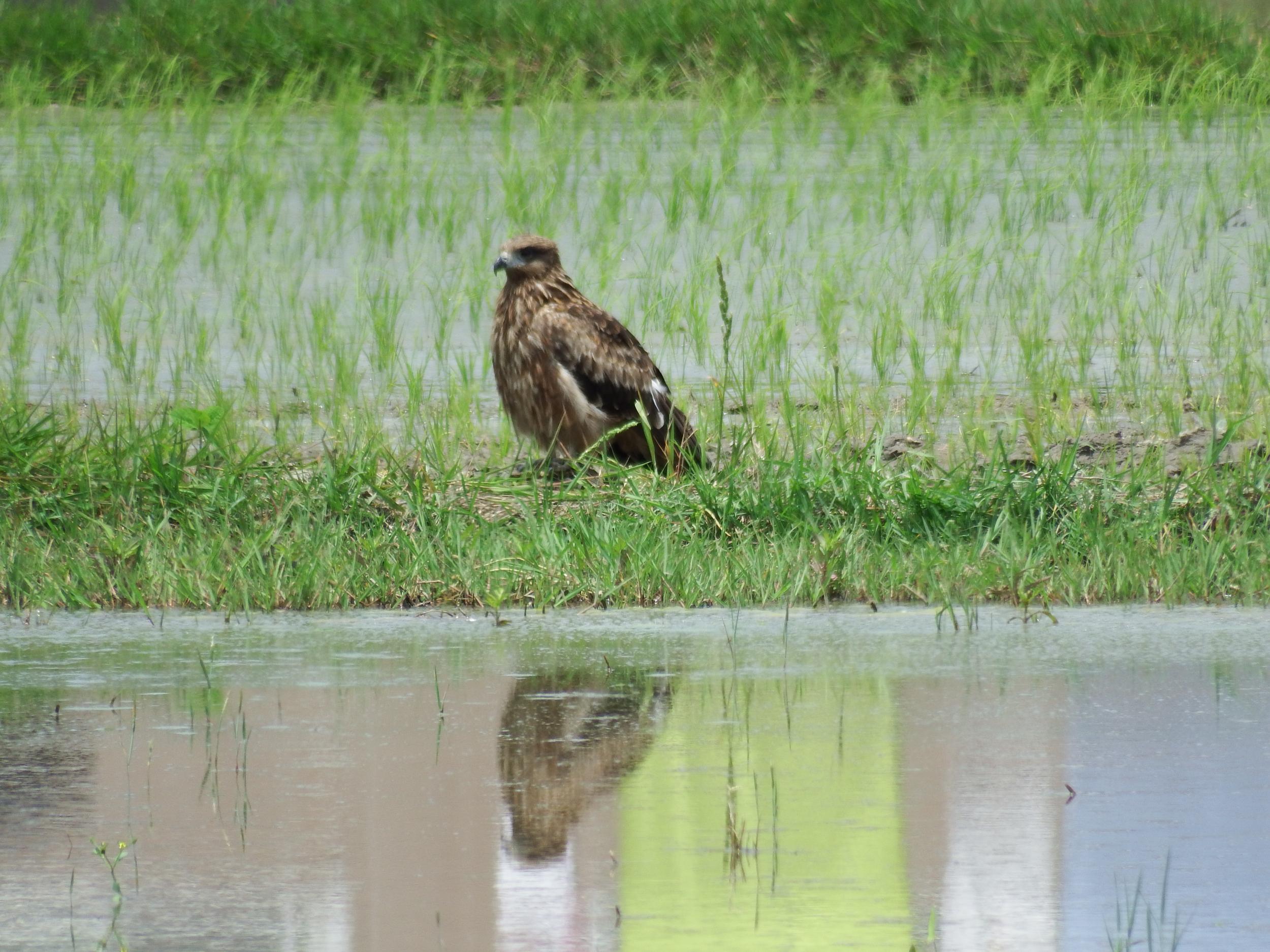 こちらも水鏡の山本山。トンビは田んぼに下りて一休み中。