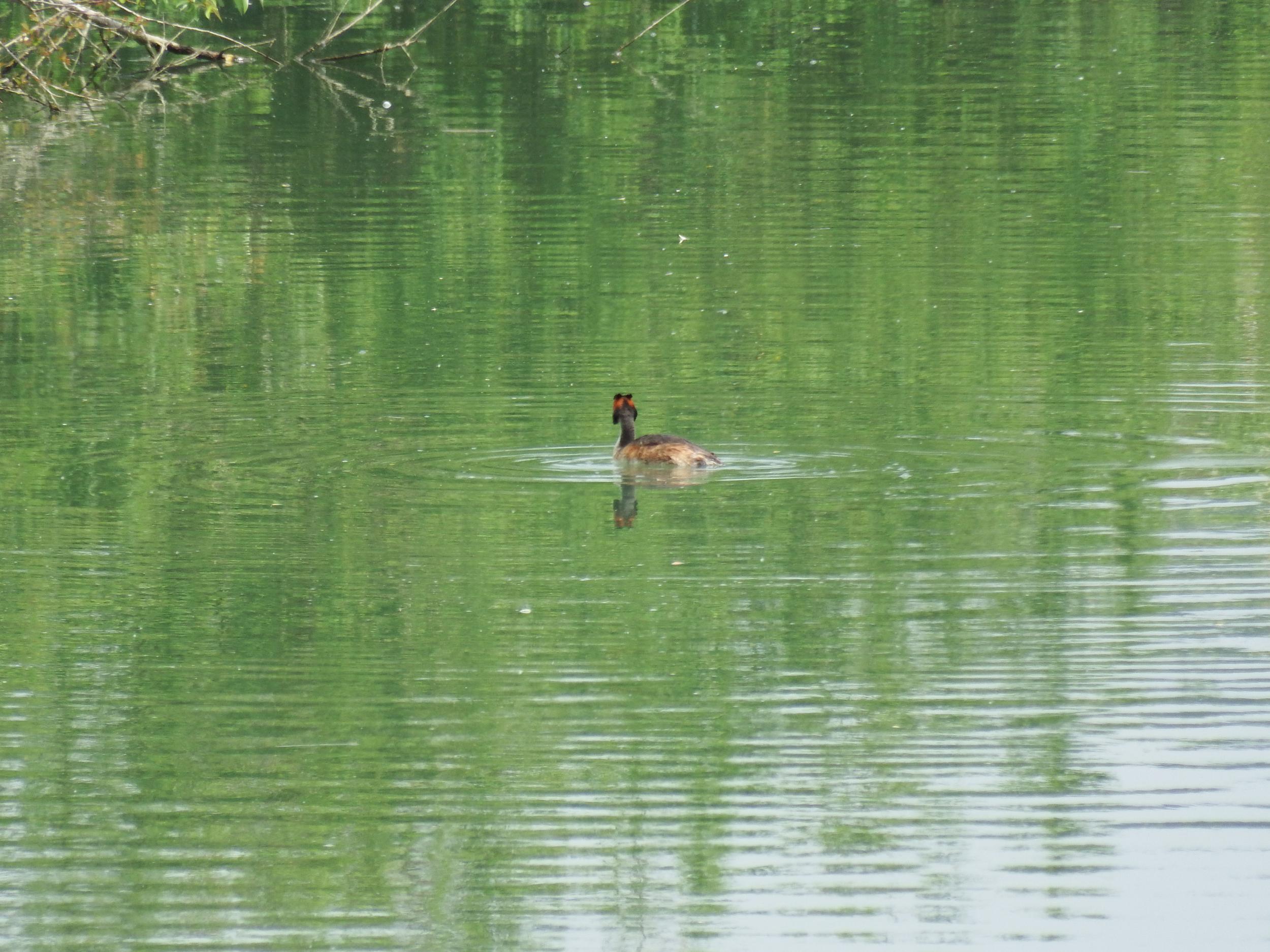 水路に浮かんでいるのは…、カンムリカイツブリの後ろ姿です。
