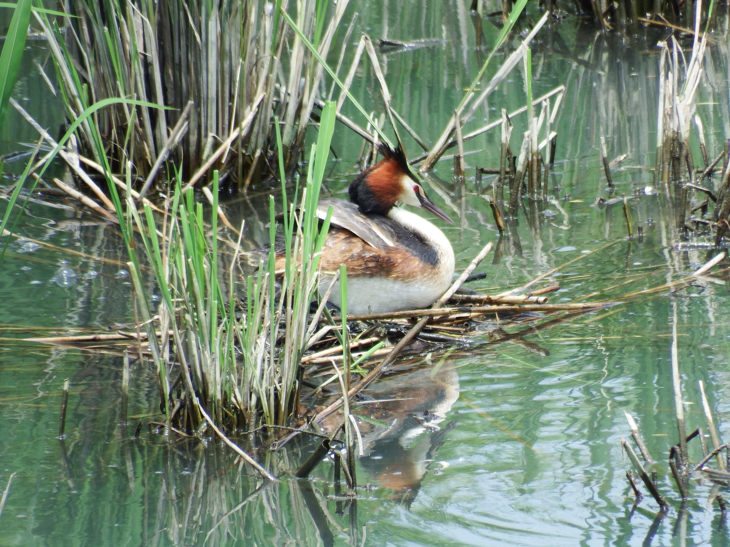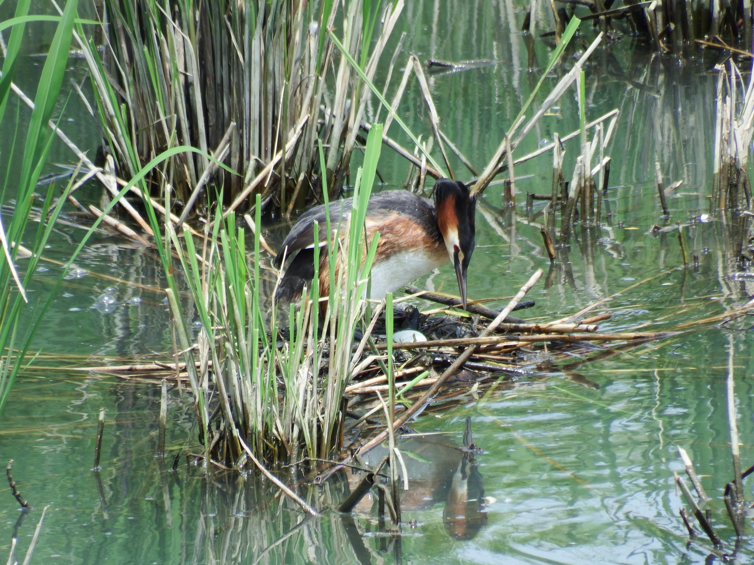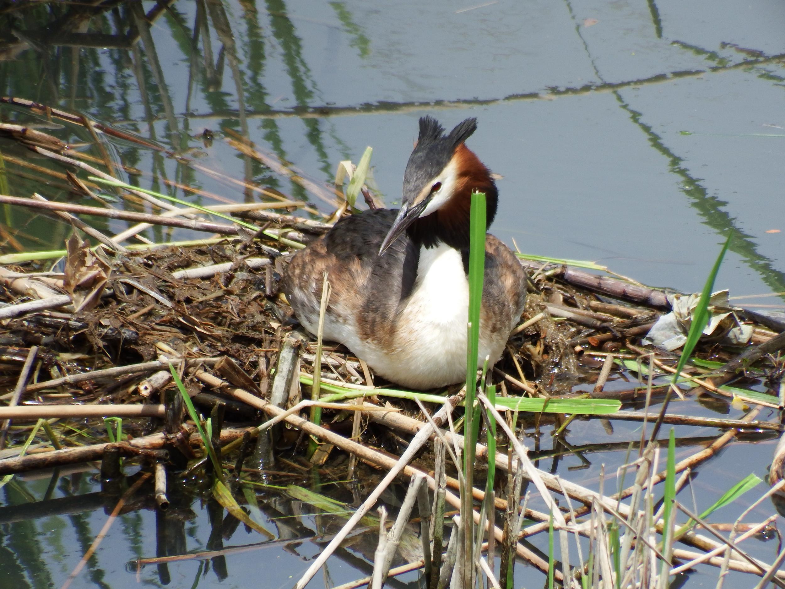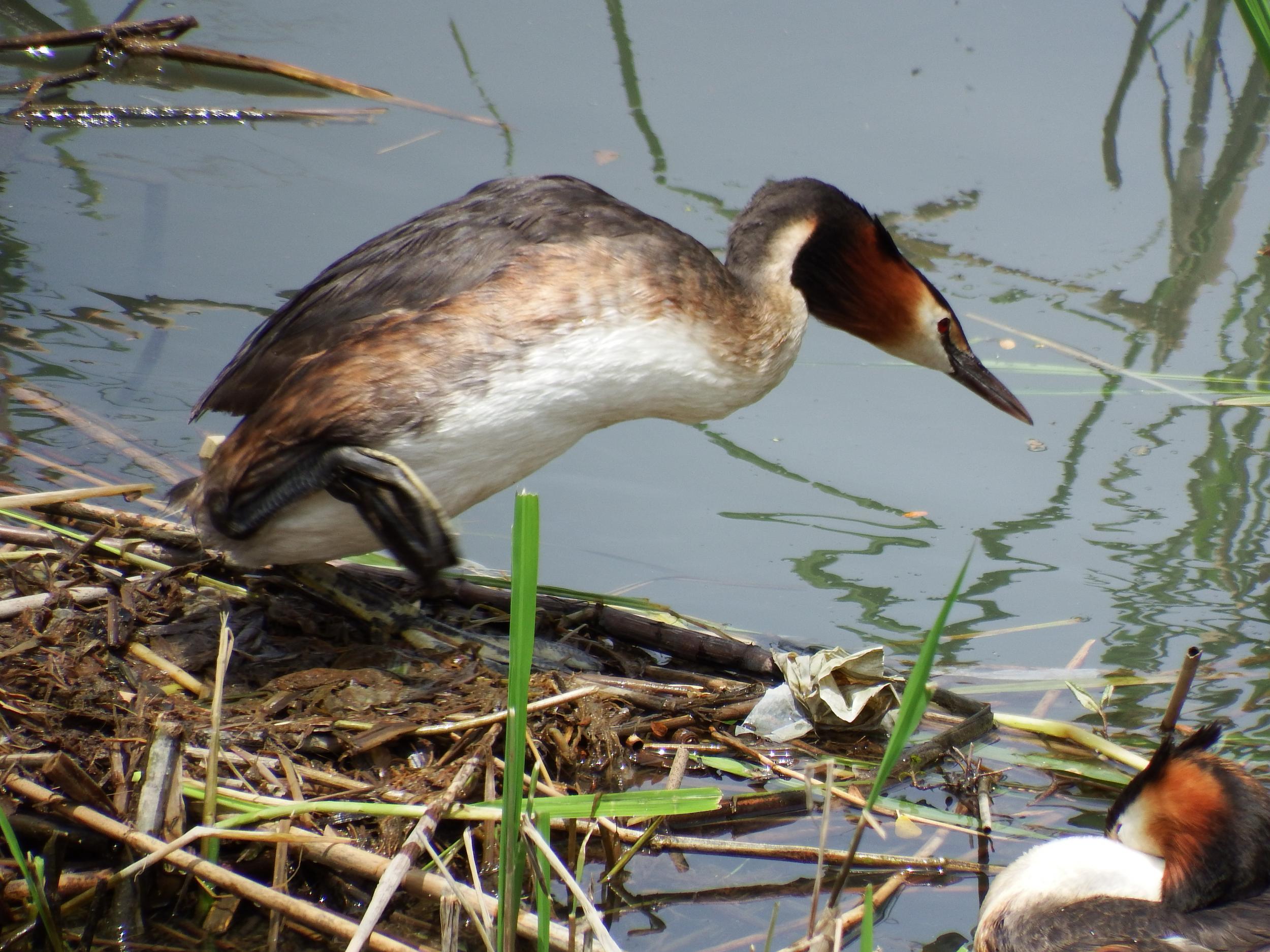 別のカンムリカイツブリの巣ではパートナーが帰ってきて抱卵を交代すべく腰を上げたものの、卵らしきものは見当たりません。