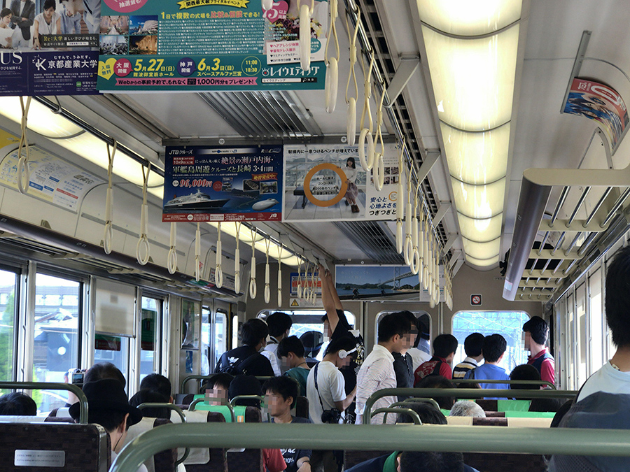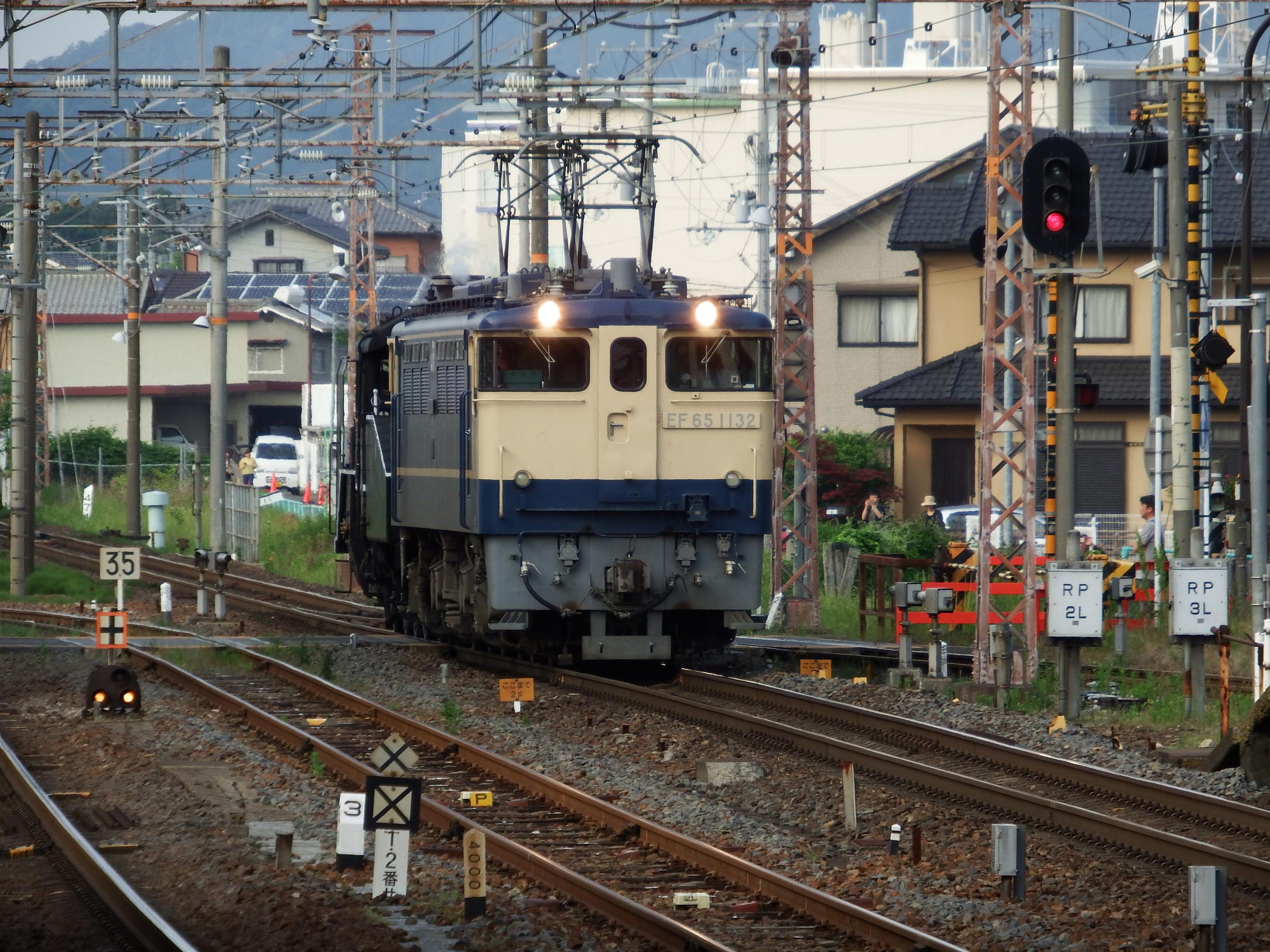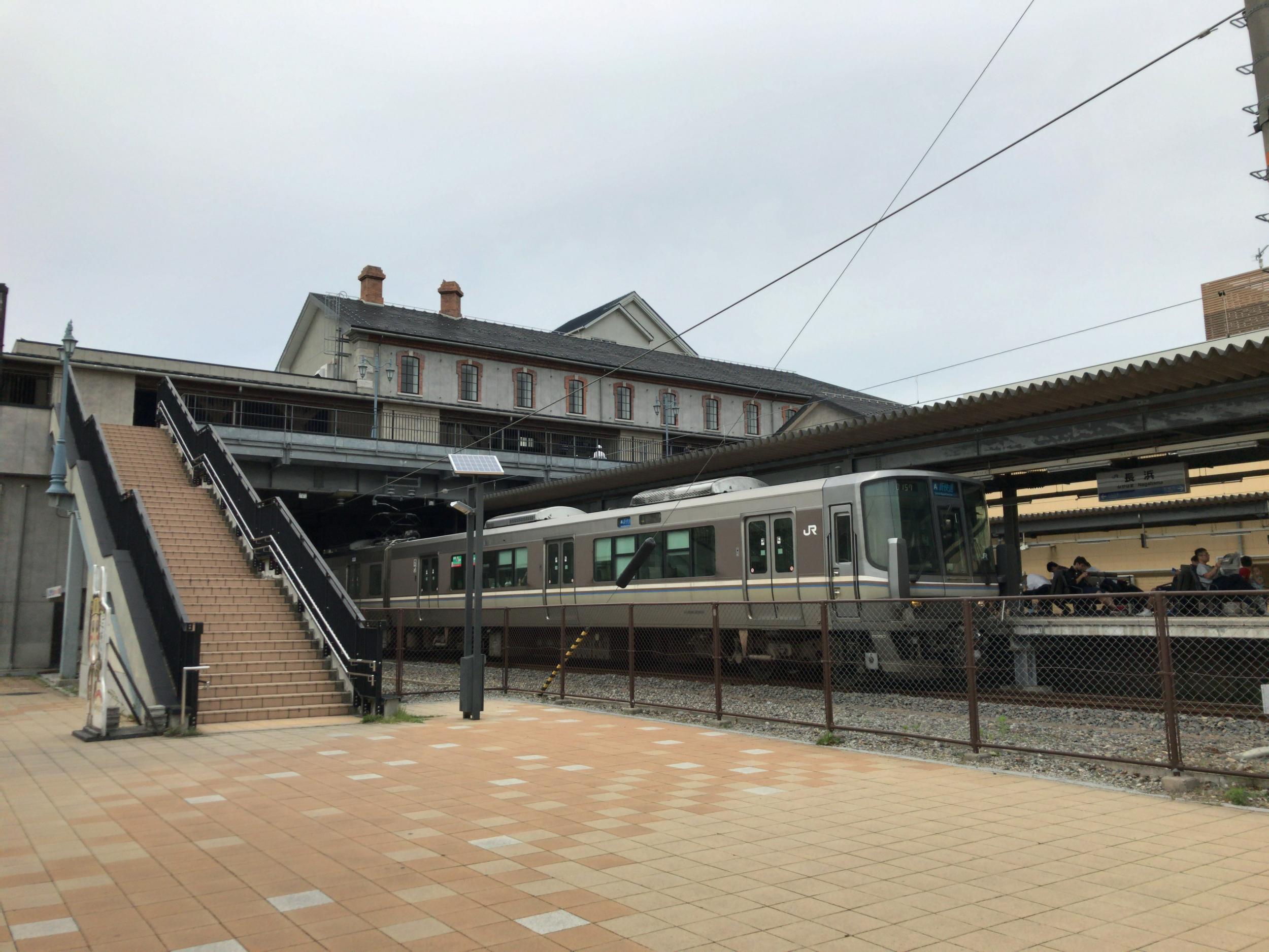 続く上りは高槻から快速の普通姫路行。普通列車でも最高速度130km/h、C56は75km/h、京都までのどこかで追い抜くはずです。ひと駅ずつチェックしていくと、草津駅ホームの京都寄りに人垣。