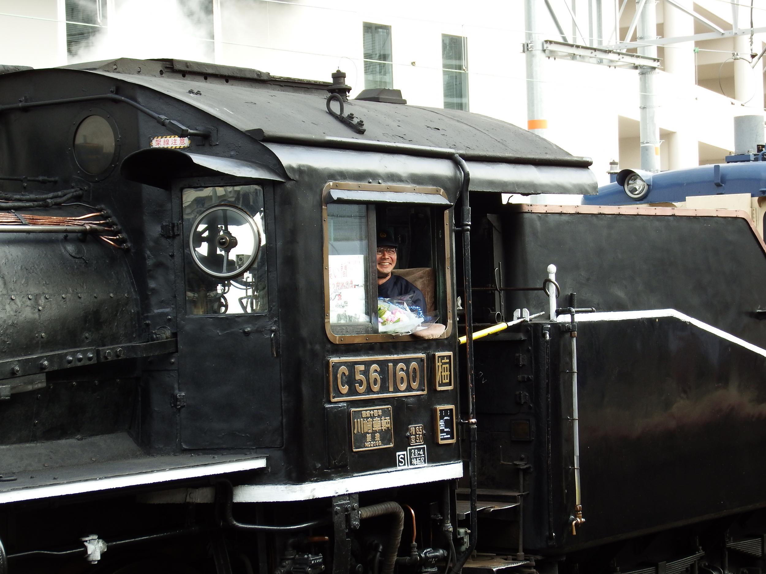 C56 160号機は製造銘板にもあるように昭和14年製、C56のラストナンバー機です。昭和39年に上諏訪機関区へ転籍、小海線や飯山線、七尾線で活躍、昭和47年に梅小路蒸気機関車館の動態保存機となり、昭和55年頃から全国のイベント列車に引っ張り出されるようになり、平成7年から北びわこ号の本務機を務めてきました。