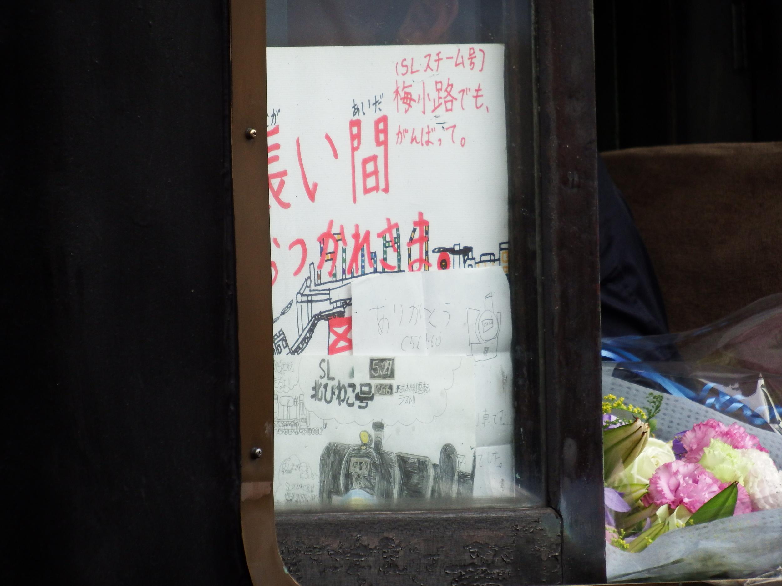 ホームのない2番線で待避していました。間に3番線があるので、人垣からでもみんながよく見える位置です。笑顔がカッコいい機関士さんの手元には花束が置かれています。