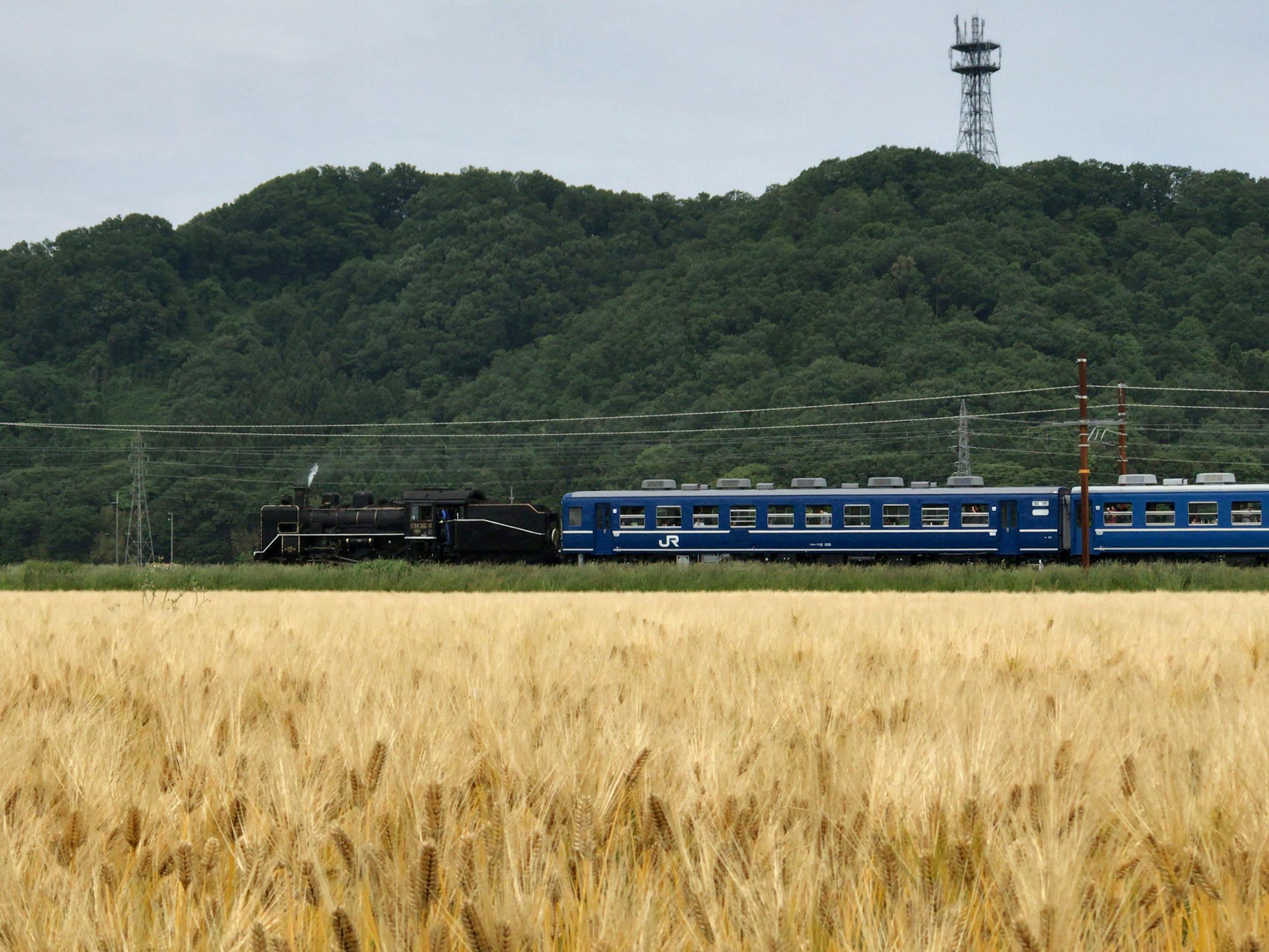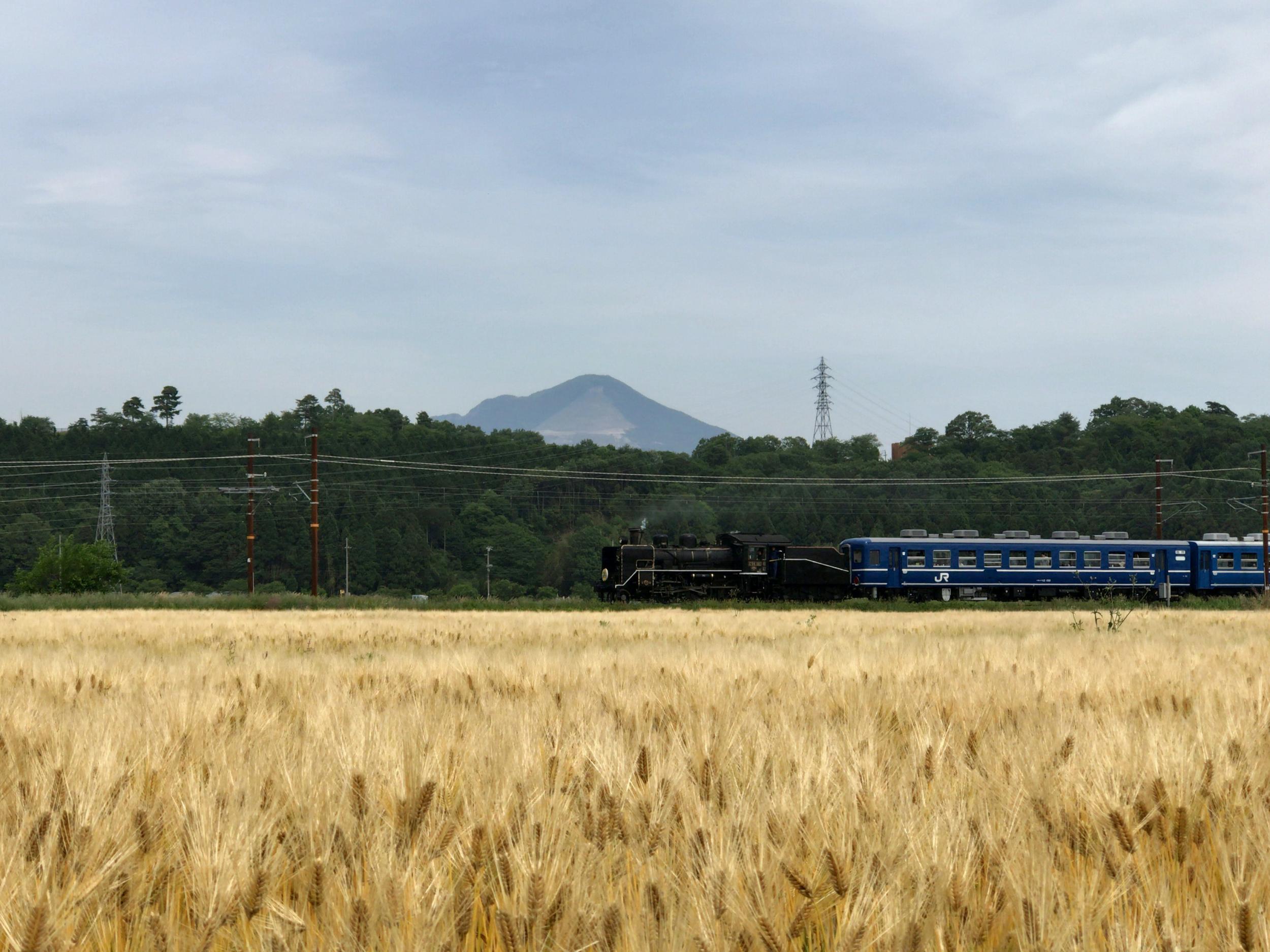 漸く頭上からヘリが離れたタイミングで北びわこ3号がやってきました。大麦と伊吹山とC56。鉄塔は虎御前山、北びわこ号俯瞰撮影ポイントのひとつですが、かなり木が茂っていて、登ってもポイントを探すのは難しそうです。それに3号だと逆光です。