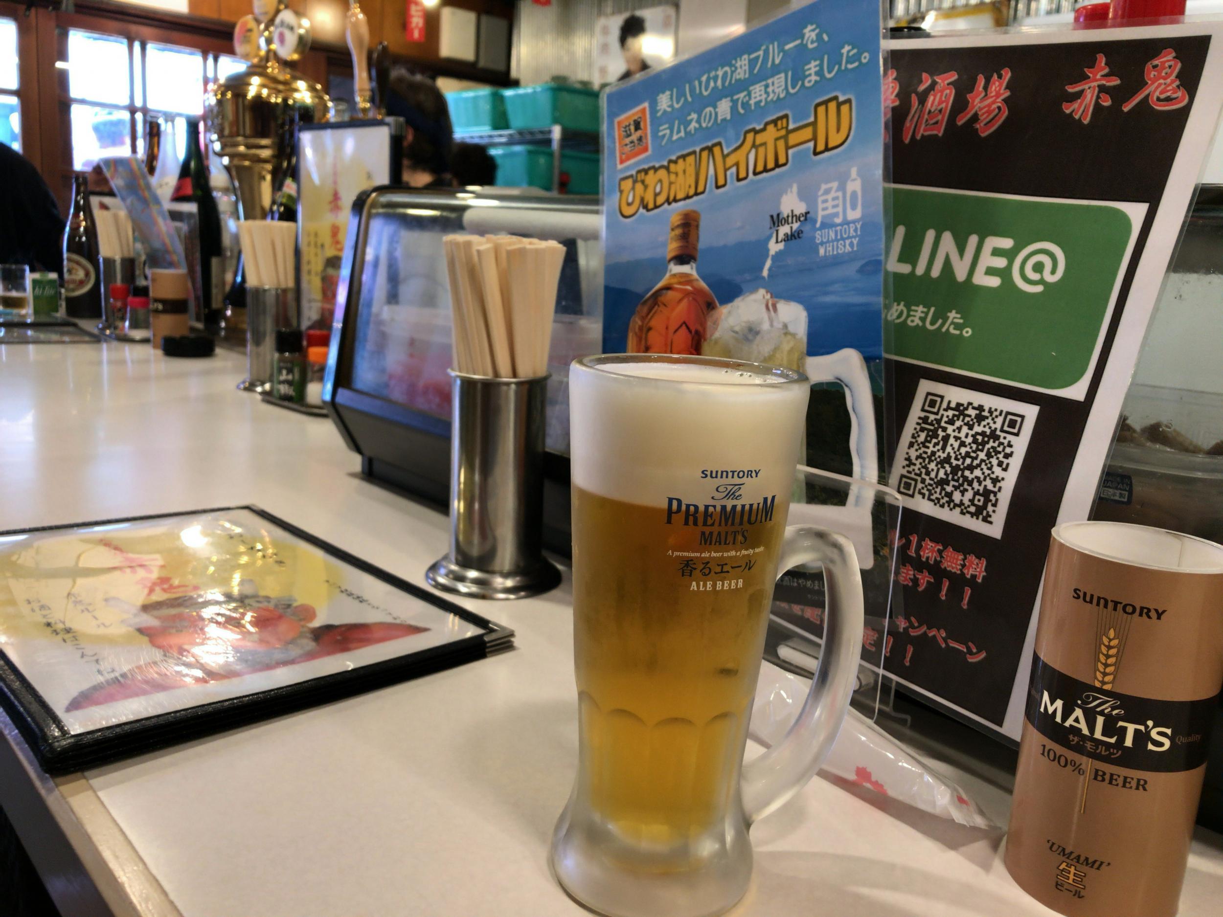 もう一度ホワイト餃子のお店の方に行ってみると、こじゃれたカフェばかりと思っていた黒壁スクエアの入口付近に、自分にも違和感のないラーメン屋兼飲み屋を発見。この生中のプファーは最高でした。