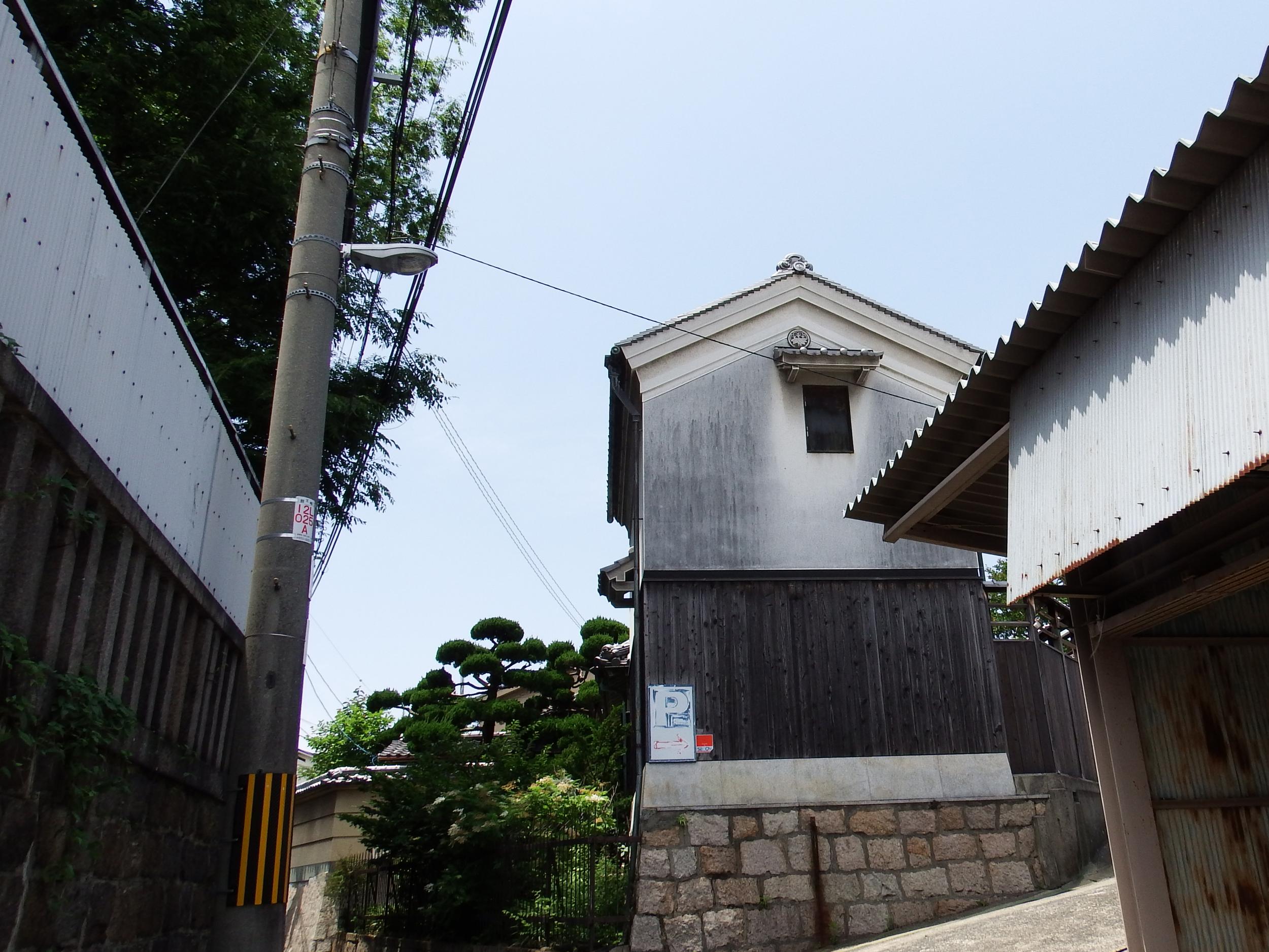 鍼灸院、理髪店、銭湯、昭和感がたっぷり残る狭い街道です。弥栄神社の裏手には立派な蔵もあり、近くからだんじり囃子が聞こえてきます。岸和田とはリズムが全然違ってます。弥栄神社の夏祭りは7月14、15日で、稽古が始まっているようです。