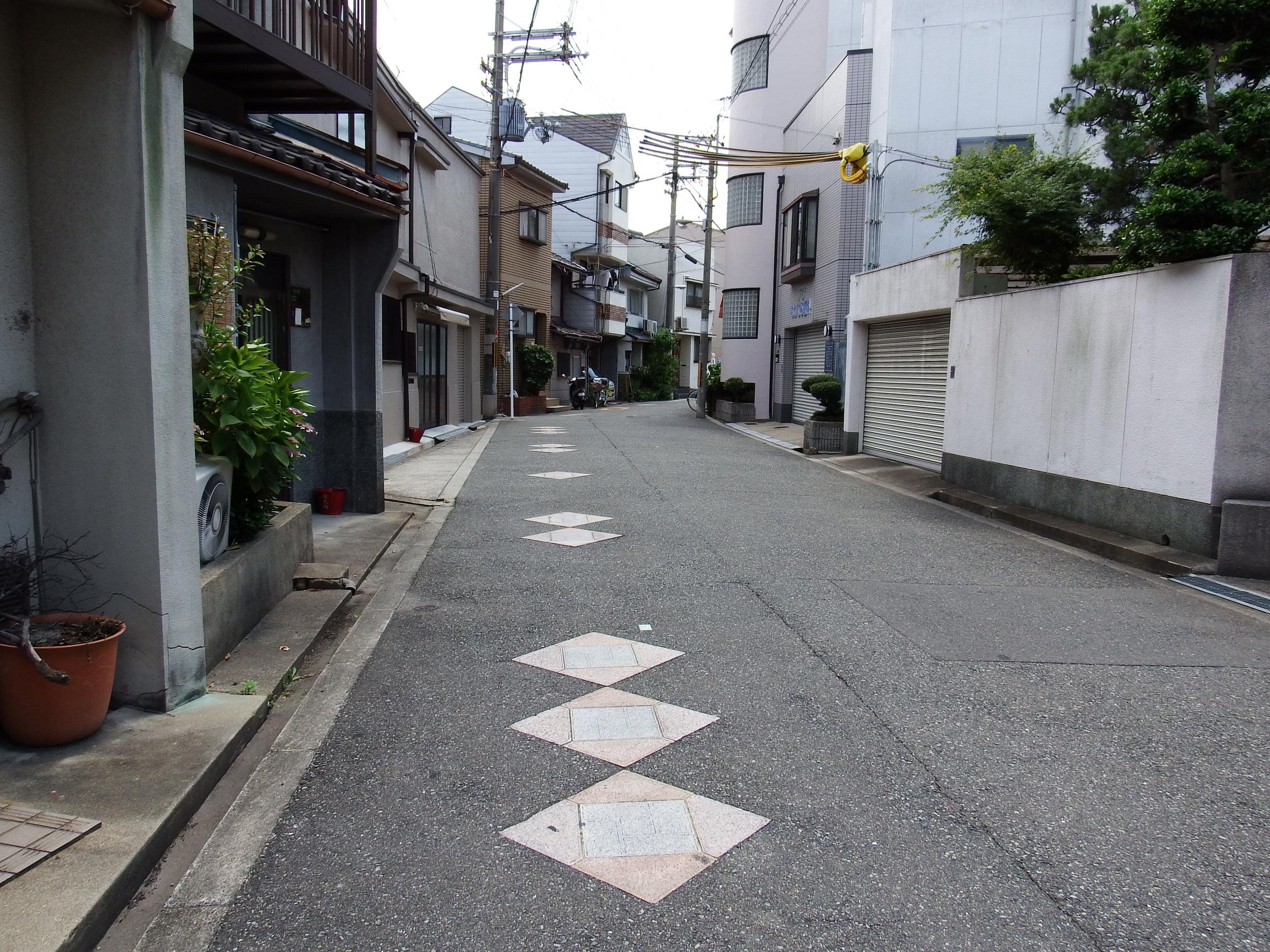 疎開道路と呼ばれる広い道路を斜めに越えると桑津街道の舗装に菱形の石板が3つずつ埋め込まれています。大阪市内にはこういう装飾が施された古い道路をところどころで見かけます。いつ頃、何のために設置されたたのか、デザインは何を意味するのか、調べてみたいと思います。