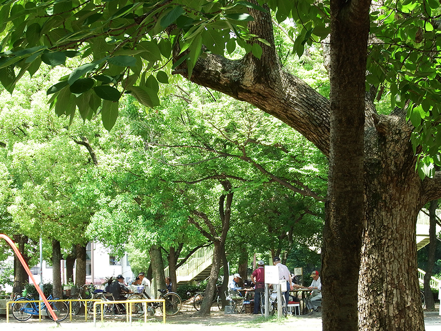 御勝山古墳に出てきました。勝山通を渡ると公園でおっちゃんたちが木陰で麻雀卓を囲んでいます。この公園は御勝山公園の前方後円墳の前方の部分が切り崩されて公園に造成されたそうです。冬ノ陣で徳川秀忠本陣があった場所です。