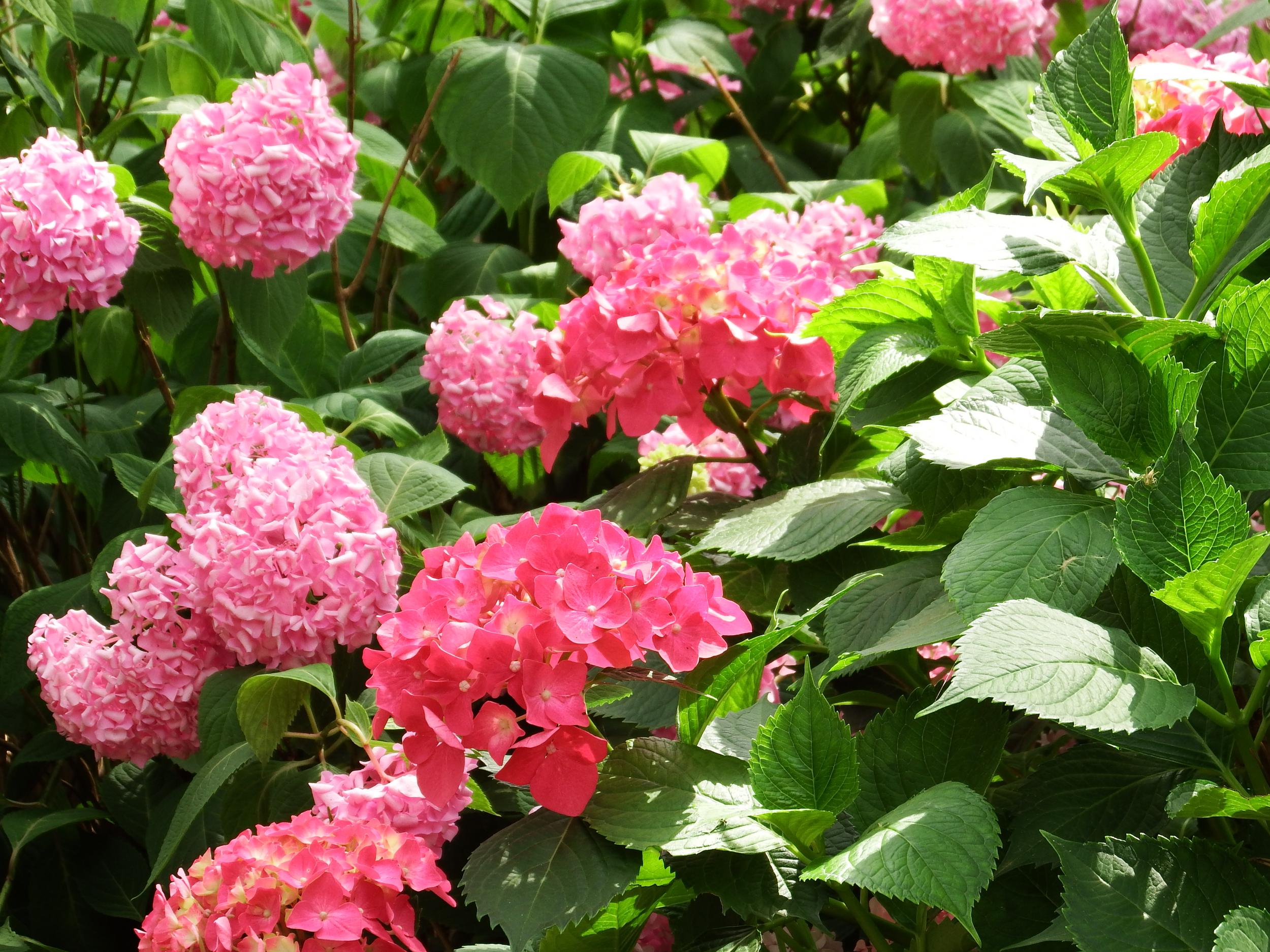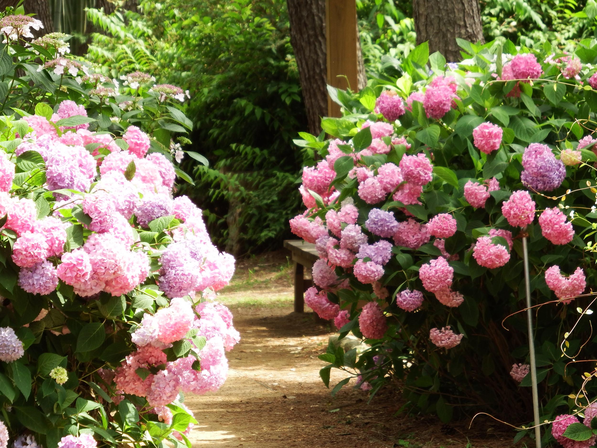 アジサイ園の他にも万葉の道にアジサイの群生、こっちは赤いアジサイが見事です。