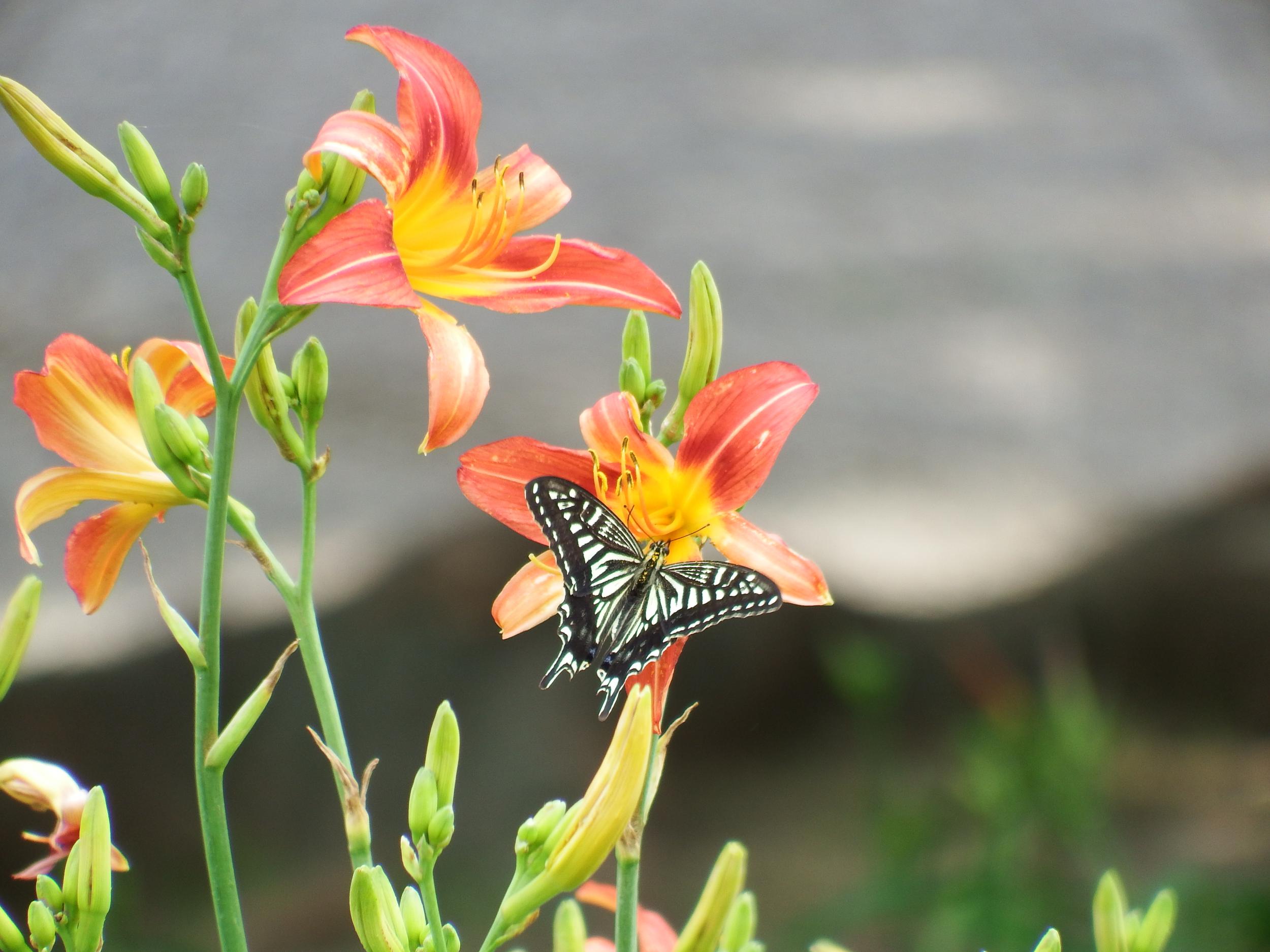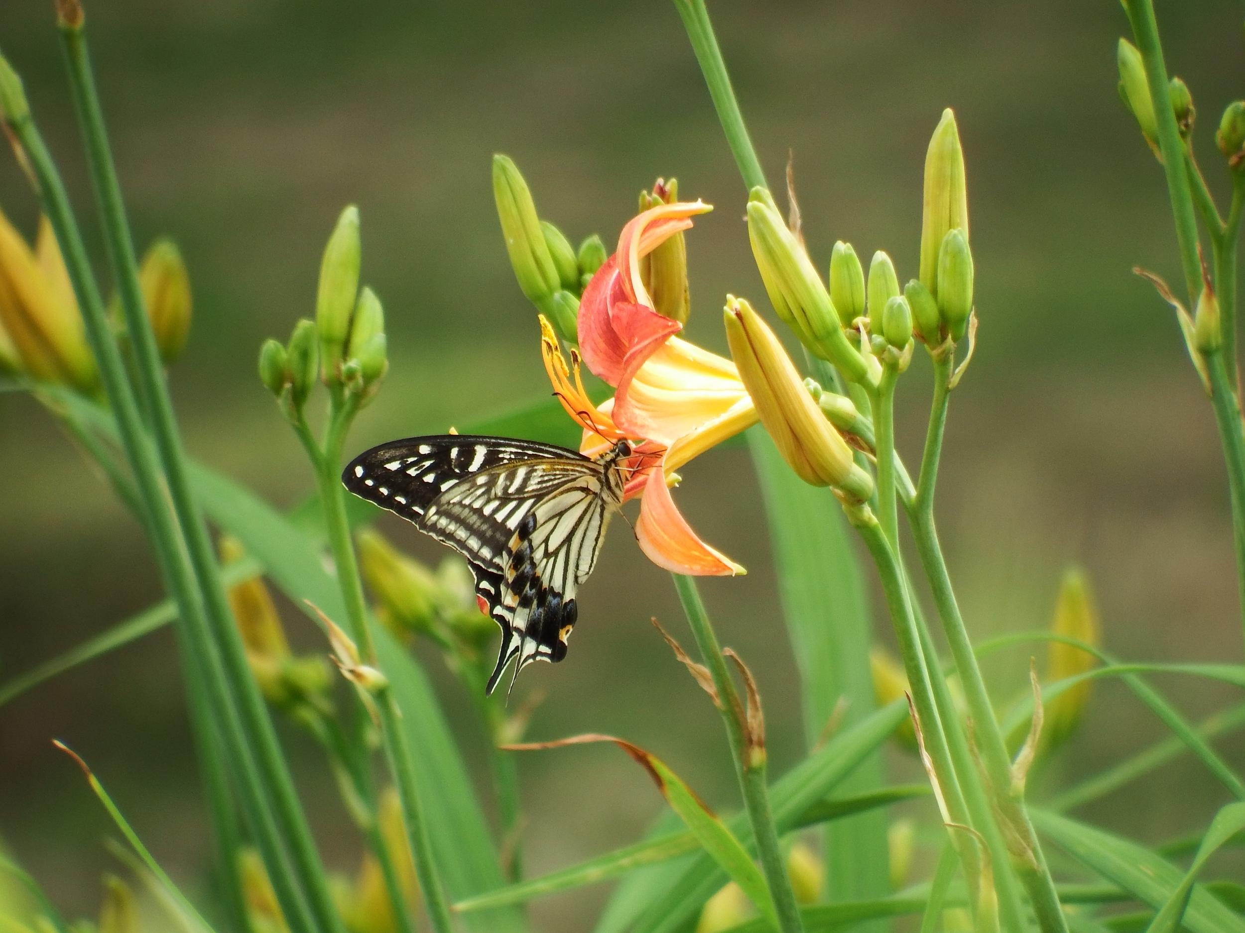 ヘメロカリス園のヘメロカリス、ボニー・バーバラ・アレンにナミアゲハ。