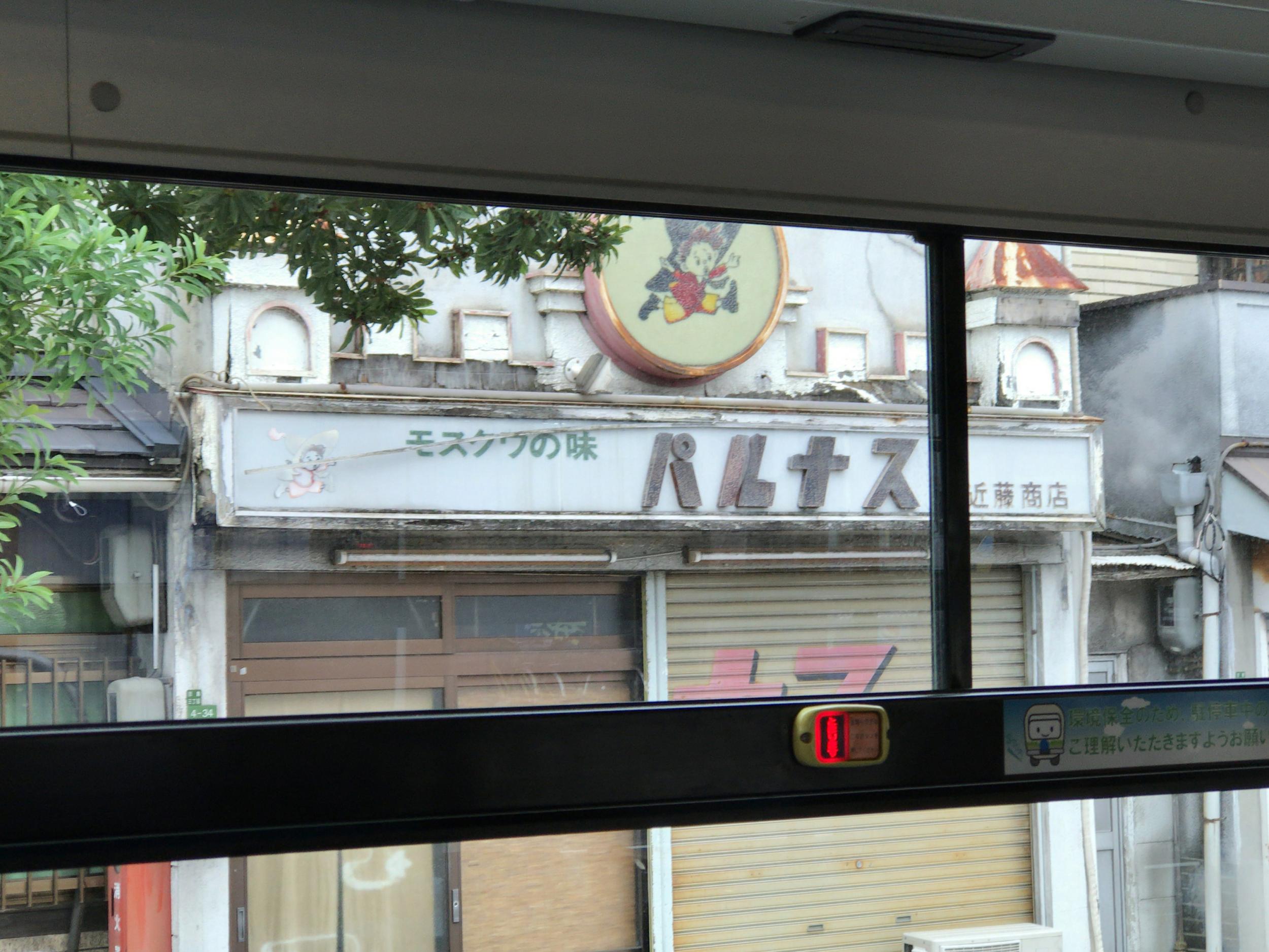 自宅近くを通るものの初乗車の73系統、千日前通、玉造筋、勝山通、今里筋と階段状に走ります。田島四丁目バス停付近で車窓に「モスクワの味、パルナス」を見つけて慌ててパチリ、城壁のようなレリーフもそのまま。Google Mapには「史跡・旧パルナス 近藤商店」と記されています。一見の価値あり、ということでしょうね。ピロシキが食べたくなります。