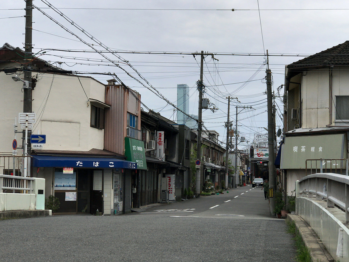 趣ある長屋が並んでいます。昭和初期の建物かと。平野川を渡ると向こうにハルカス。