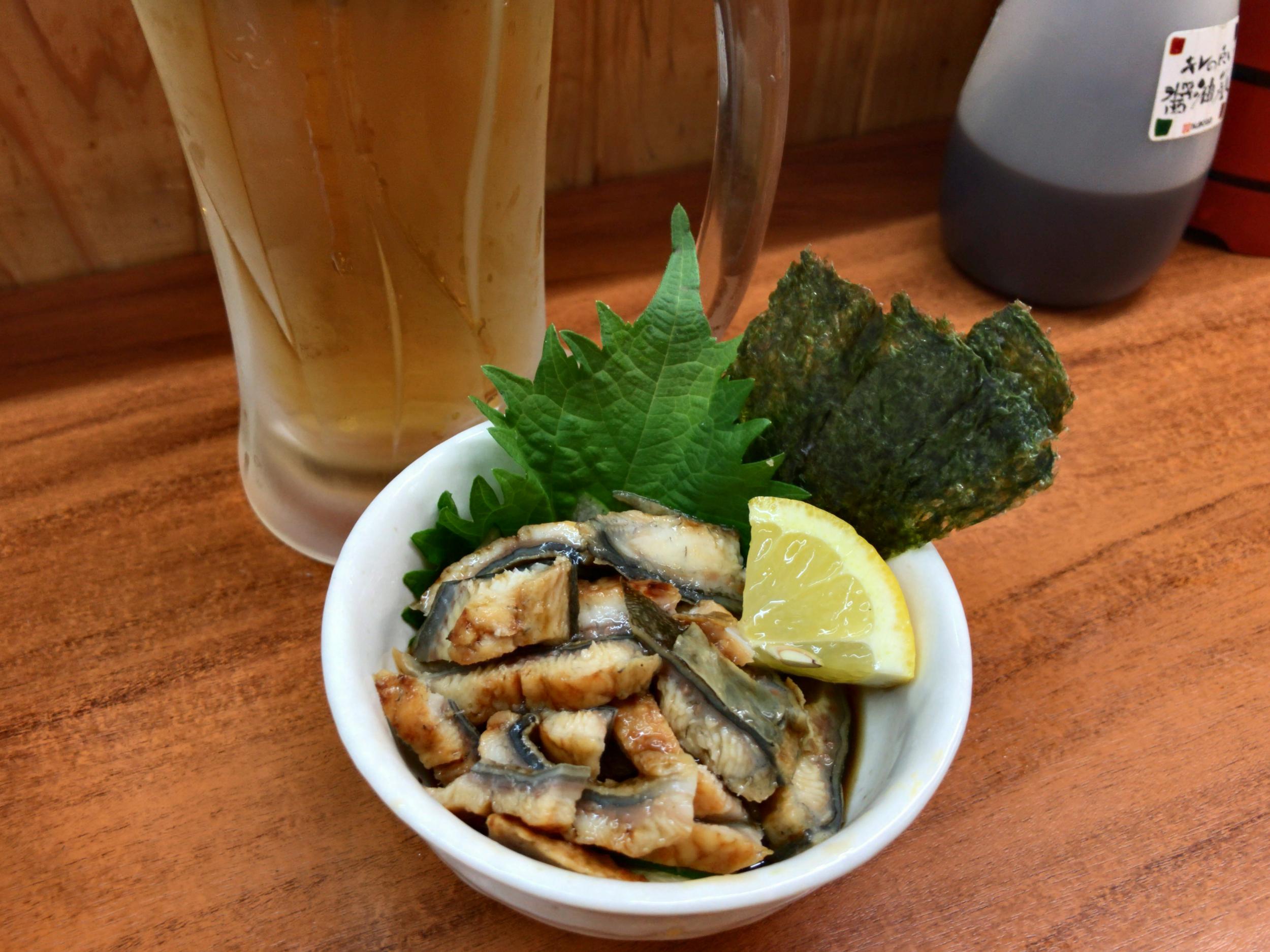 まずは生中とうざく。うざくってうなぎとキュウリの酢の物だったはずですが、キュウリの姿が見えません。食べ進めると底の方からキュウリがでてきました。これでなんと300円!テレビで新婚さんいらっしゃいをやっていて、日曜午後っぽい雰囲気が漂っています。