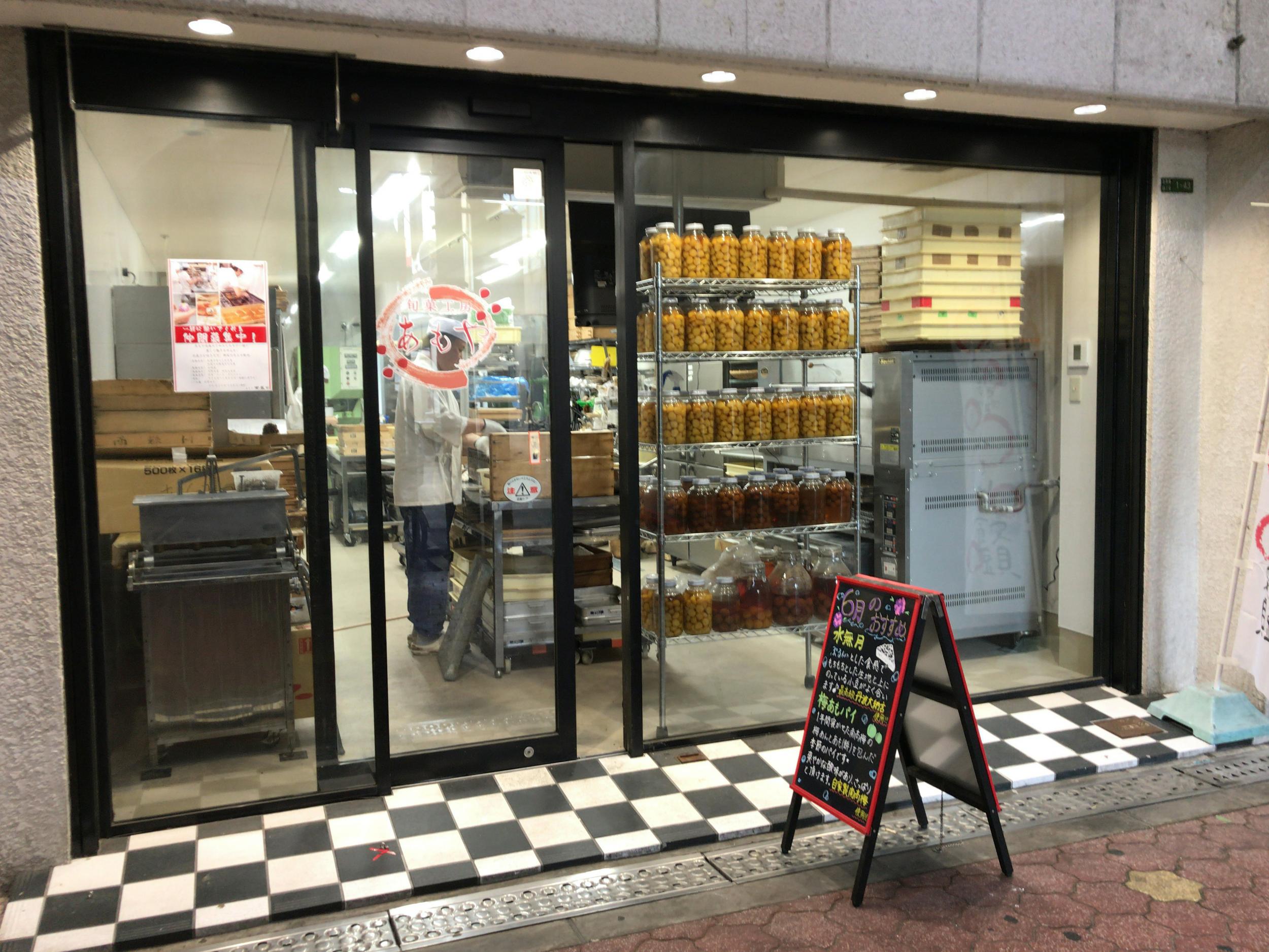 美味しそうなぬか漬けが色々と、スイカや青果も売ってる漬物屋さん、その先にあるのは和菓子屋さんの工房のようです。