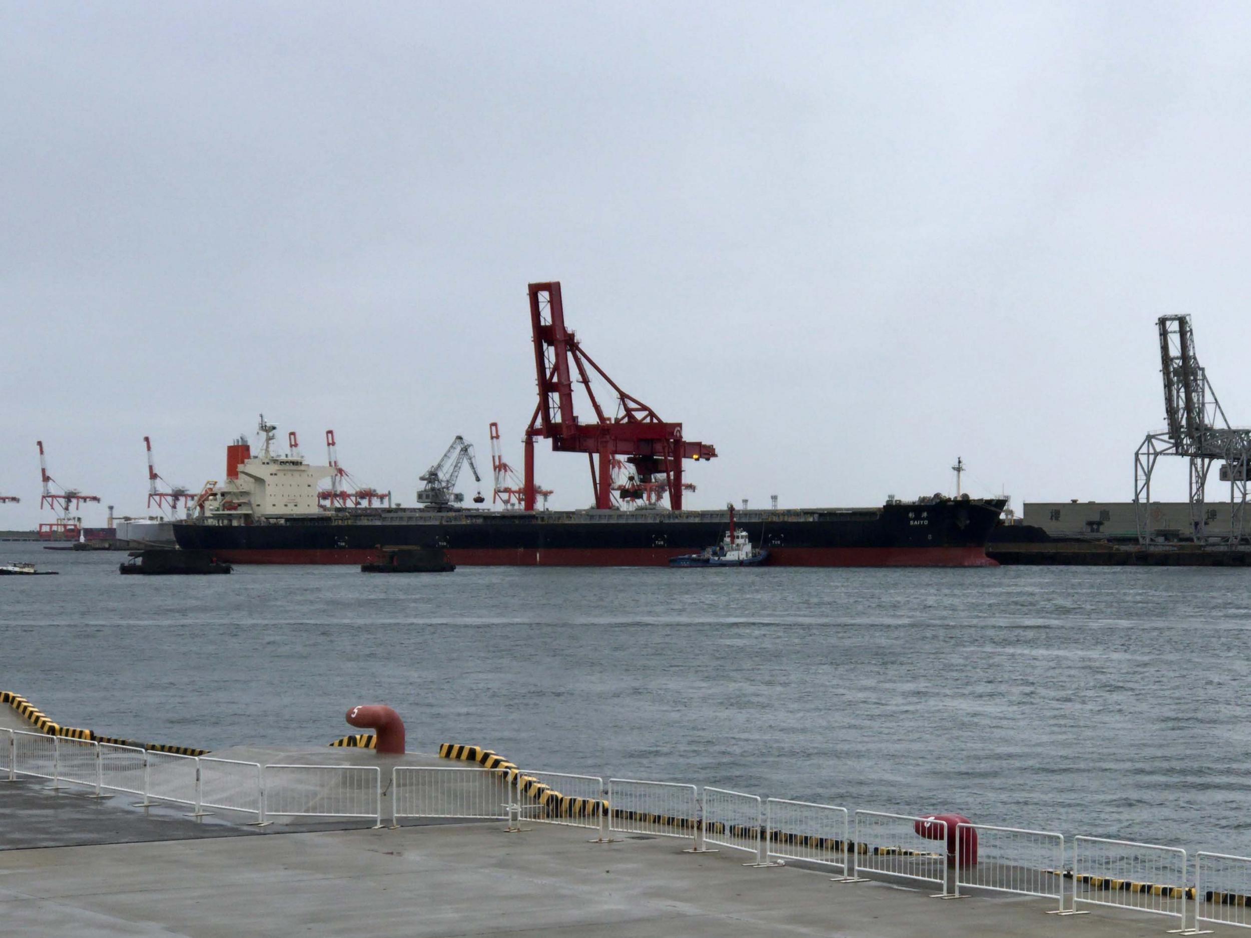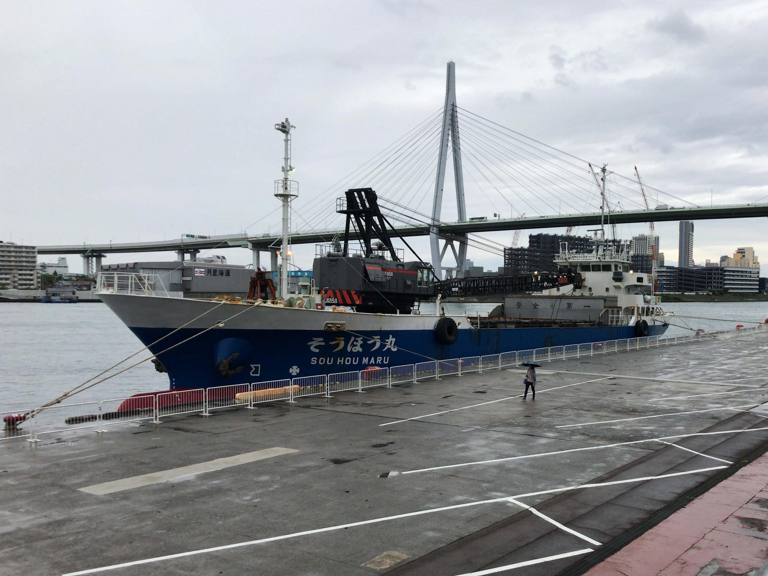 向こう側の大きな船は商船三井の石炭運搬船、彩洋、89,995総トンもあります。オレンジ色のクレーンは向こう岸にあるのではなく、甲板に設置されたものです。天保山埠頭に着岸しているのは、そうほう丸、ガット船と呼ばれるクレーン付の砂利運搬船です。
