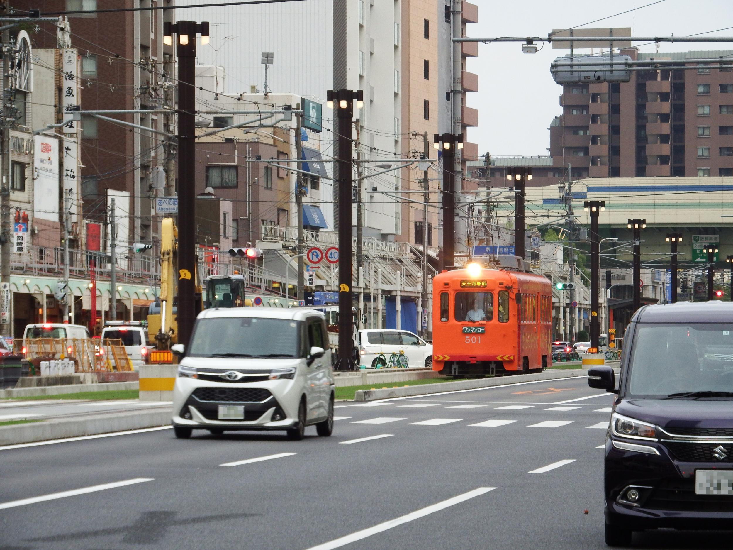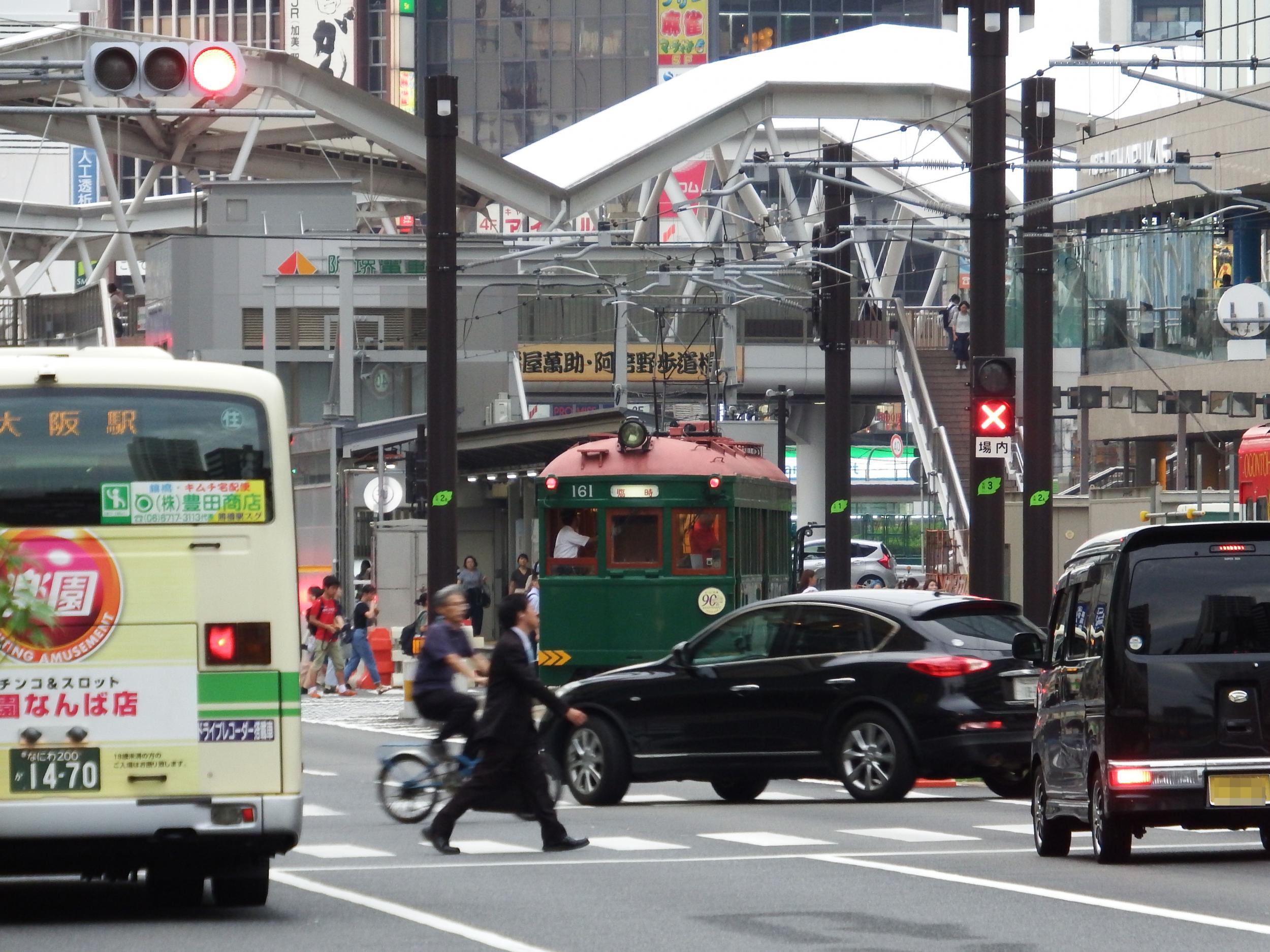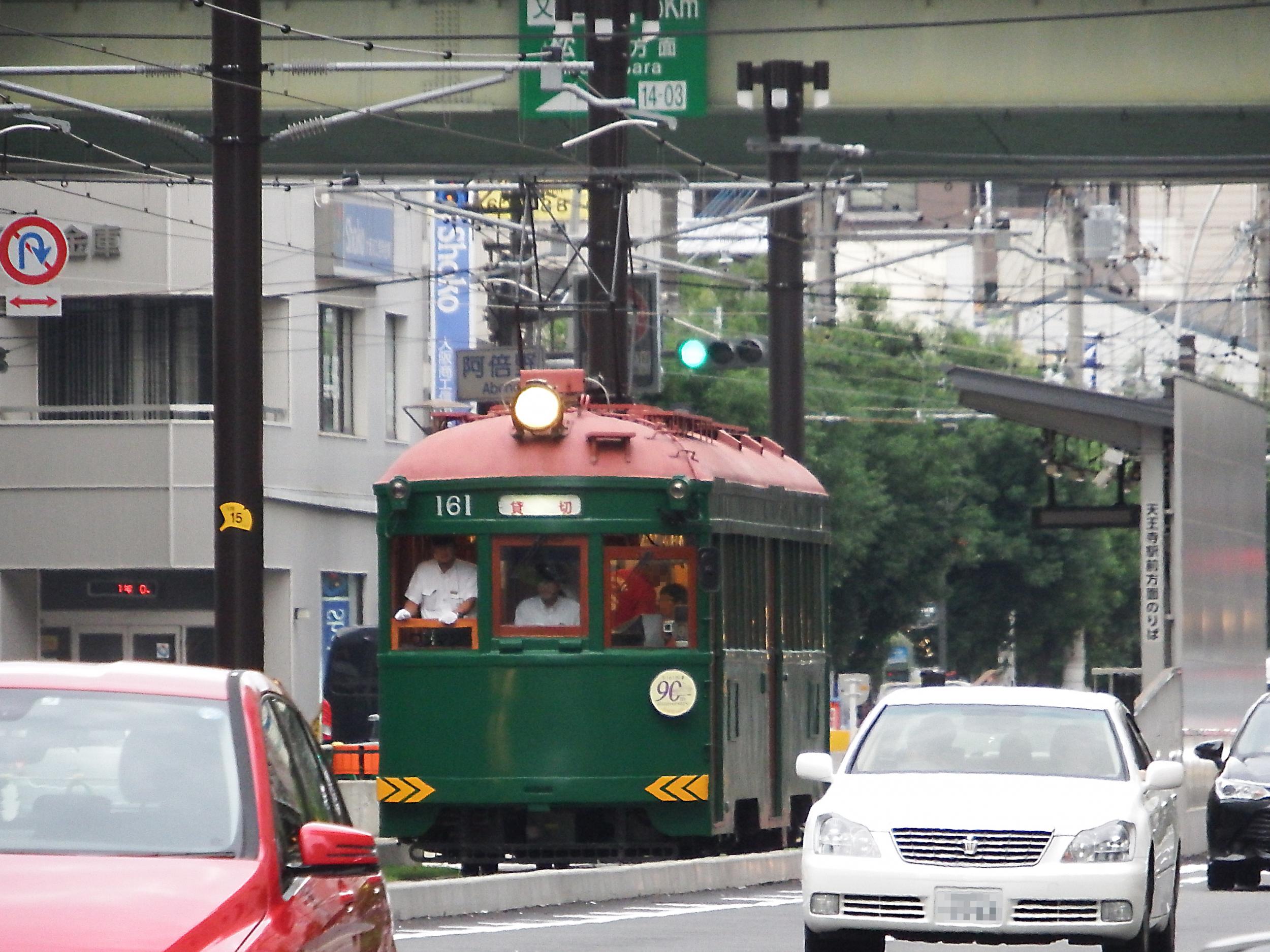 Q'sモール前で張っていた自分の前を通り過ぎて天王寺駅前停留所へ。真夏にセーター着ているような電車です。
