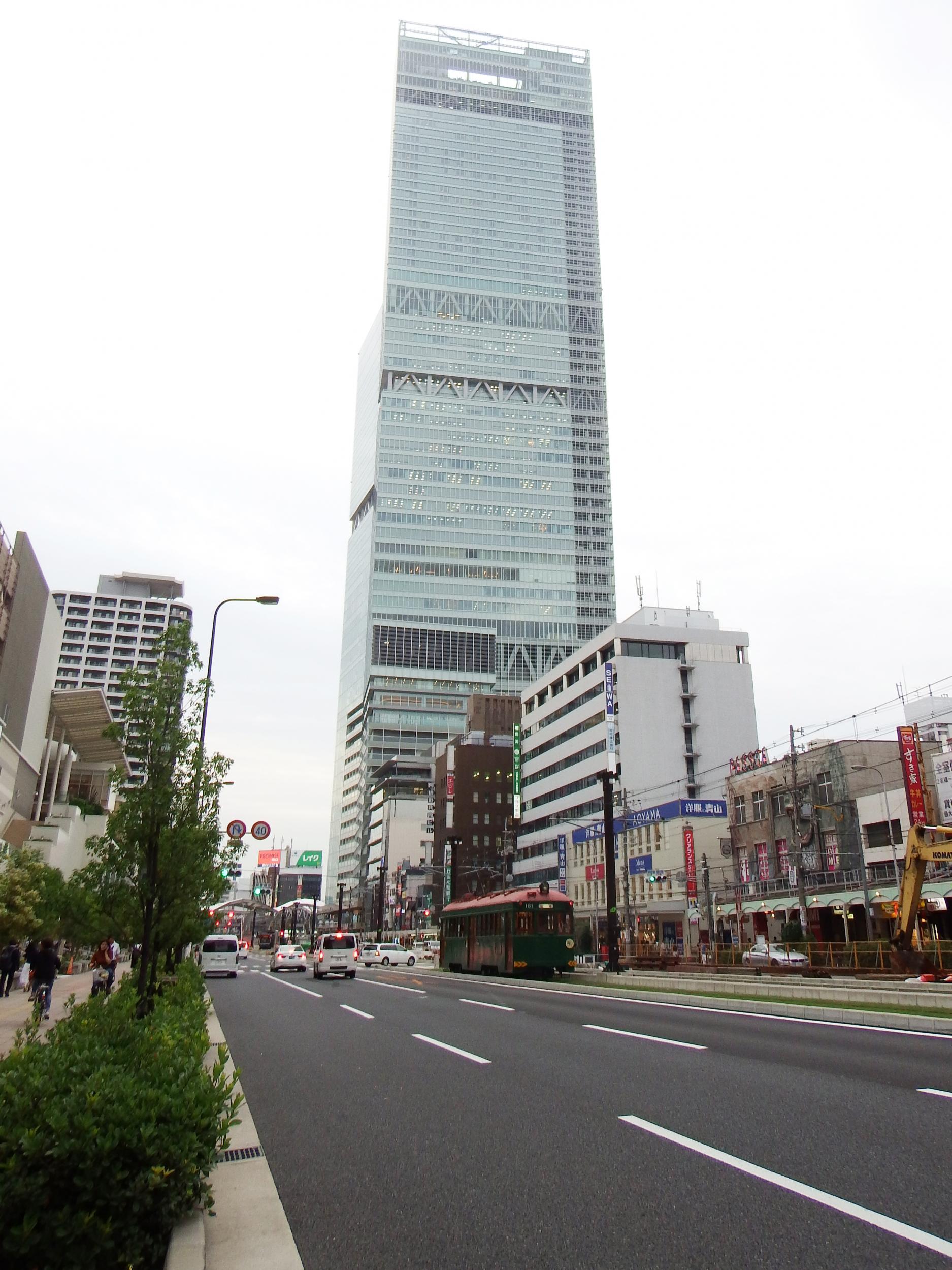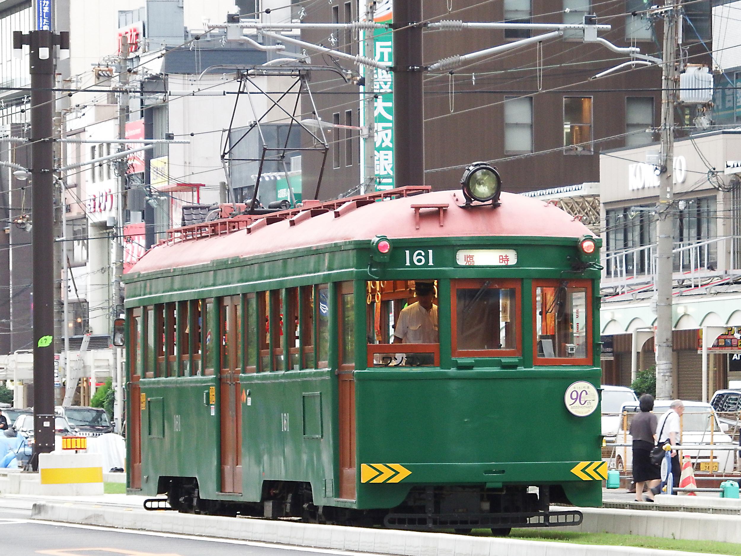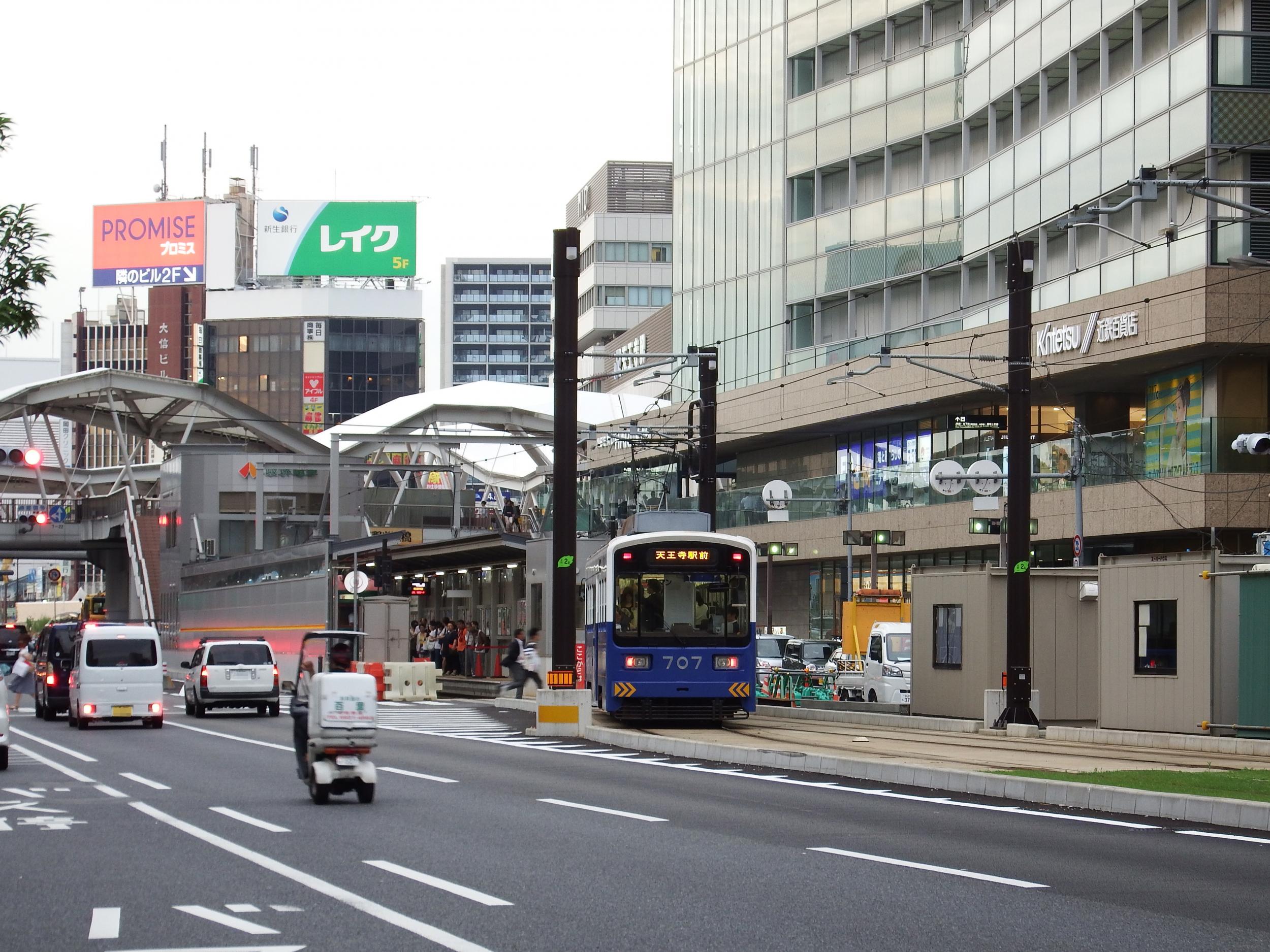 Q'sモール前で張っていた自分の前を通り過ぎて天王寺駅前停留所へ。真夏にセーター着ているような電車です。