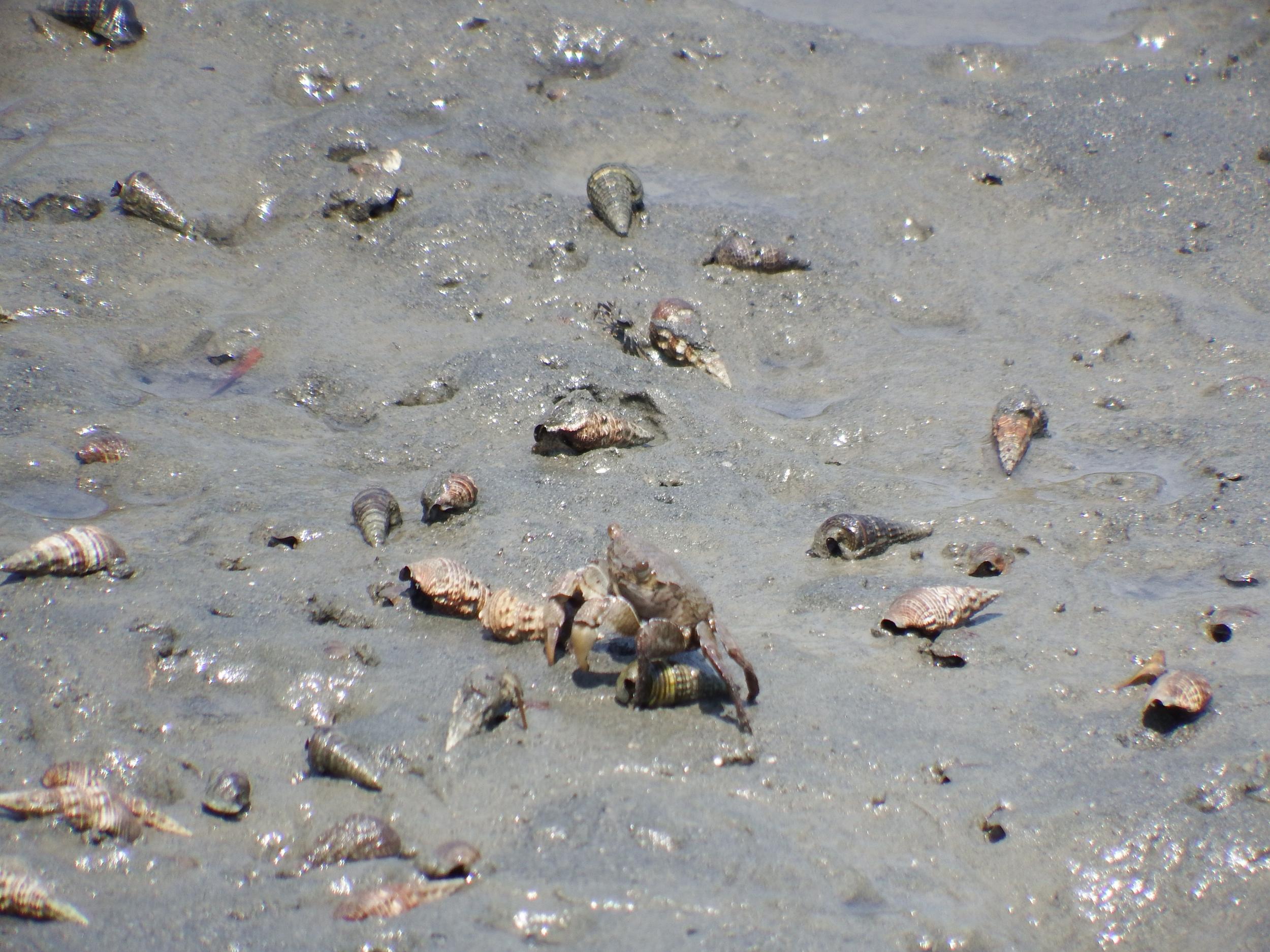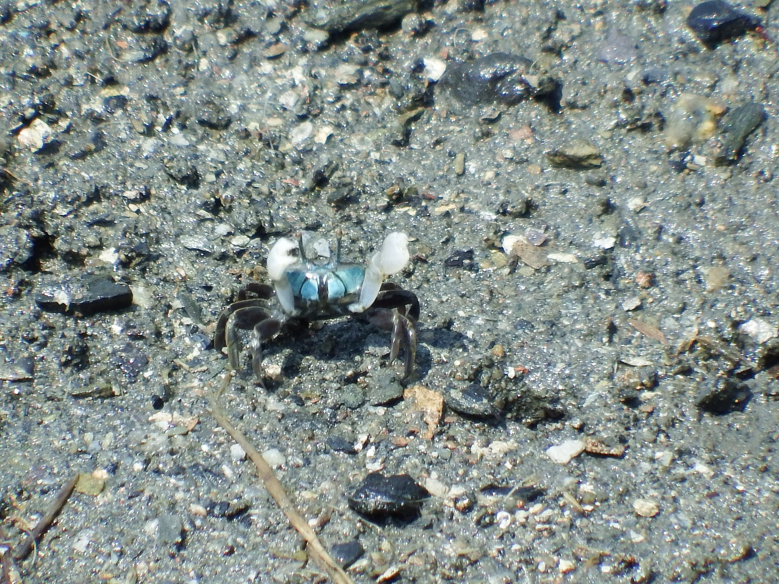 水色の小さなカニはチゴガニ、薄い水色と濃い水色がいます。