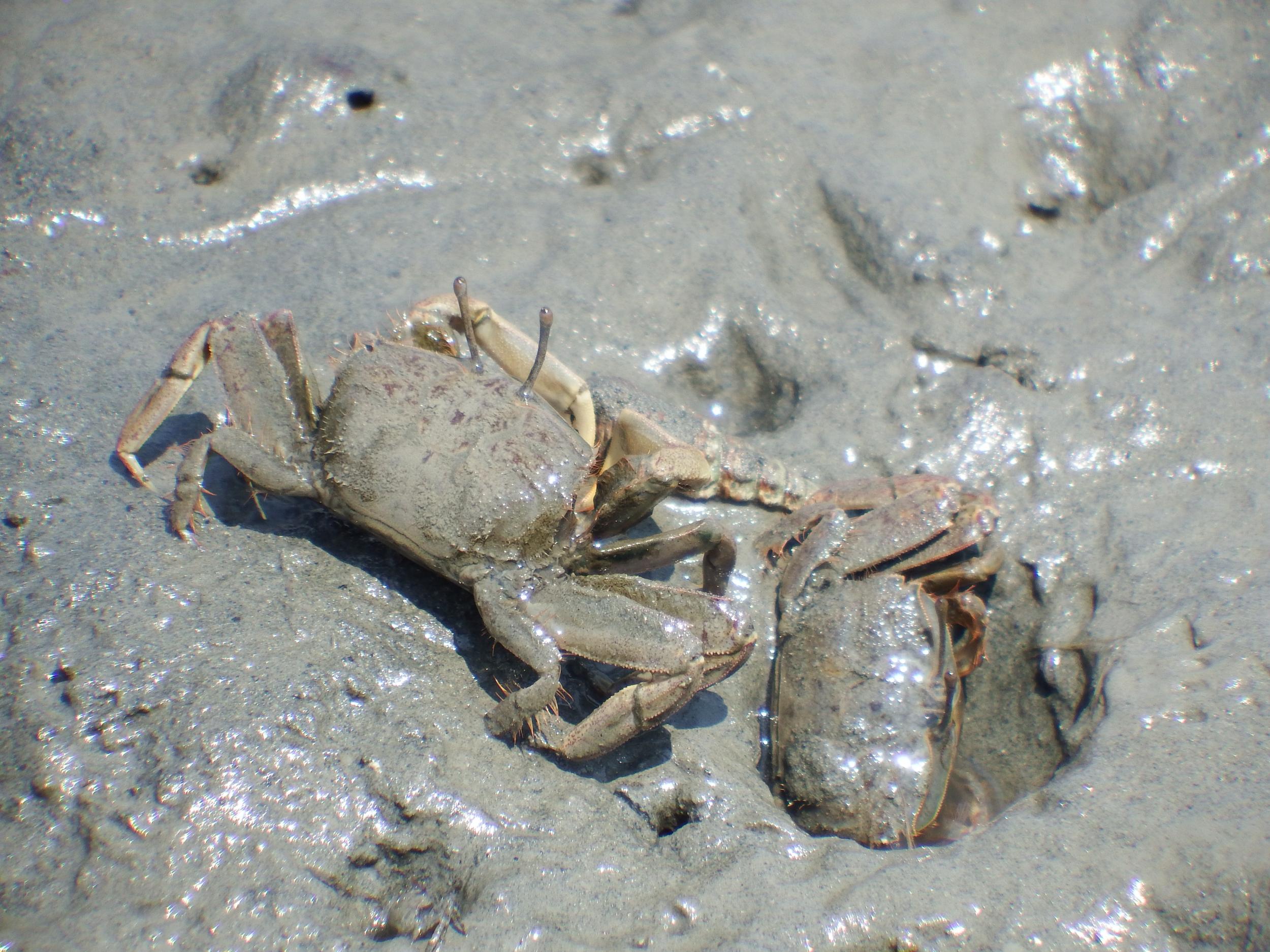 ハクセンシオマネキの大相撲、向こう側の白扇vs手前側の潮招の一番です。白扇が左側からこちら側に回り込んだところを潮招の投げで白扇がひっくり返されるものの、すぐさま白扇がハサミをつかまれたまま潮招をひっくり返し、潮招は空中でもがいています。しかし潮招はそれでもハサミを離さず立ち直ります。潮招は白扇を押し返し、しばらくにらみ合いが続いた後、白扇は逃げ去って行きました。