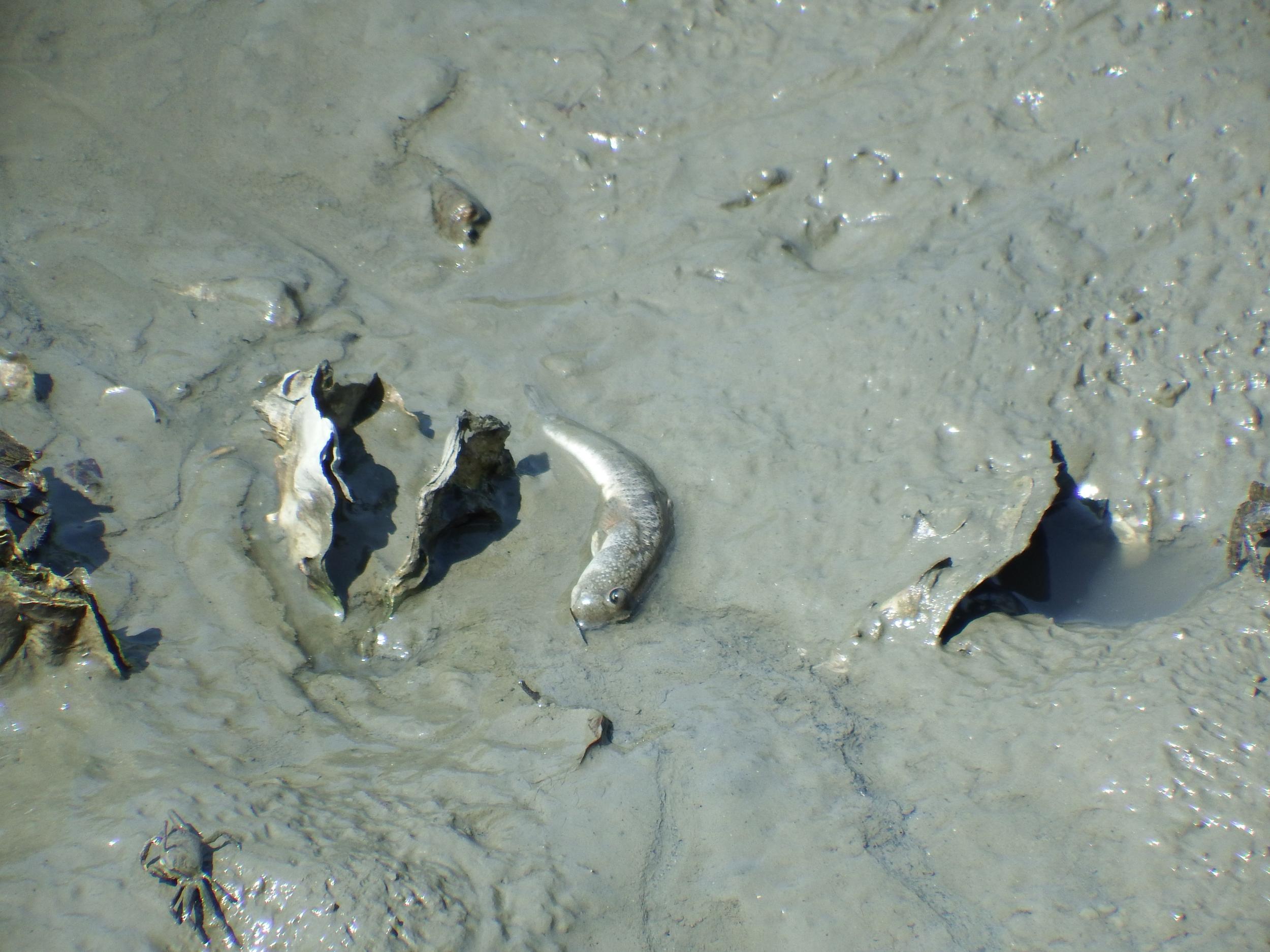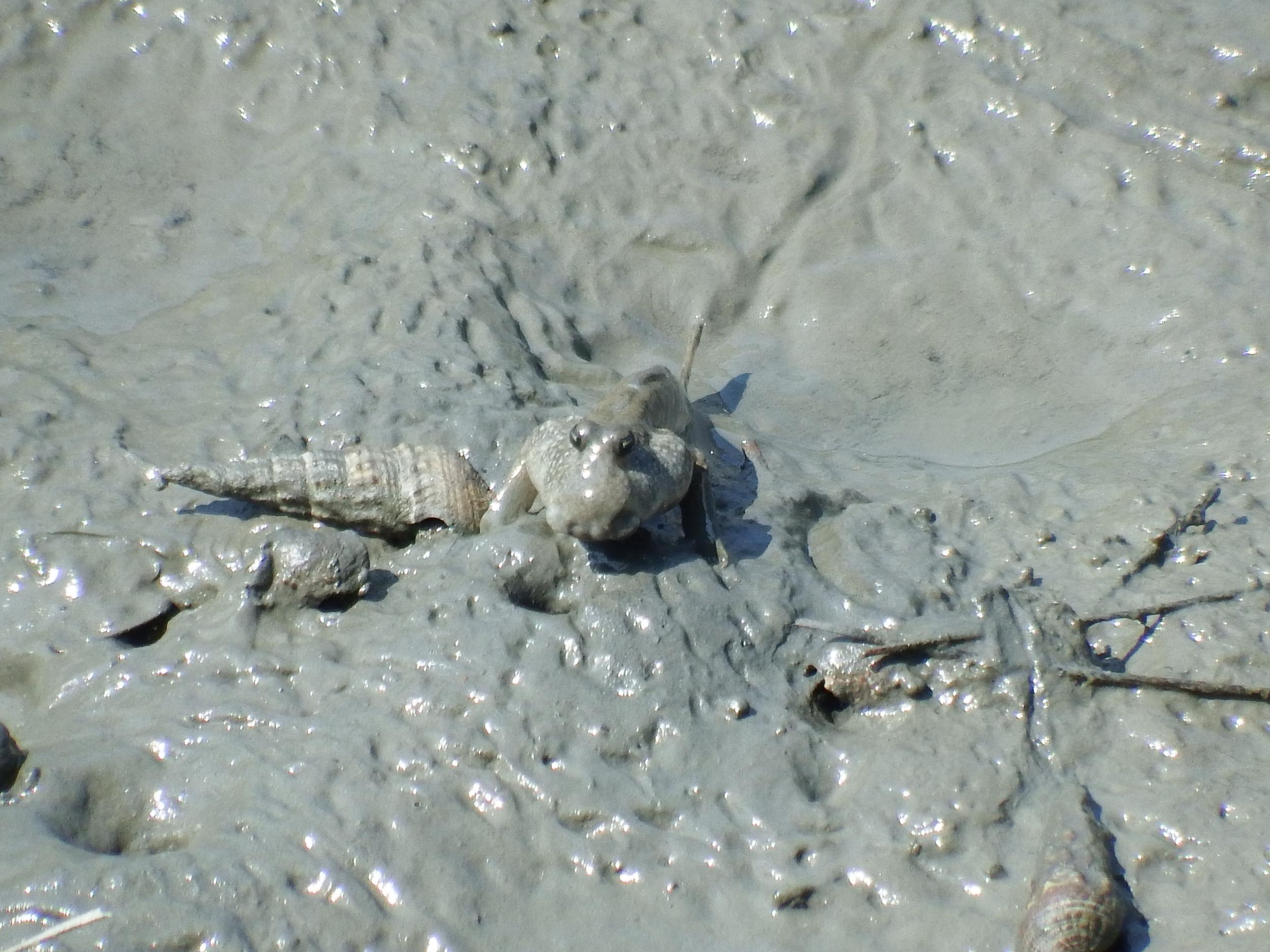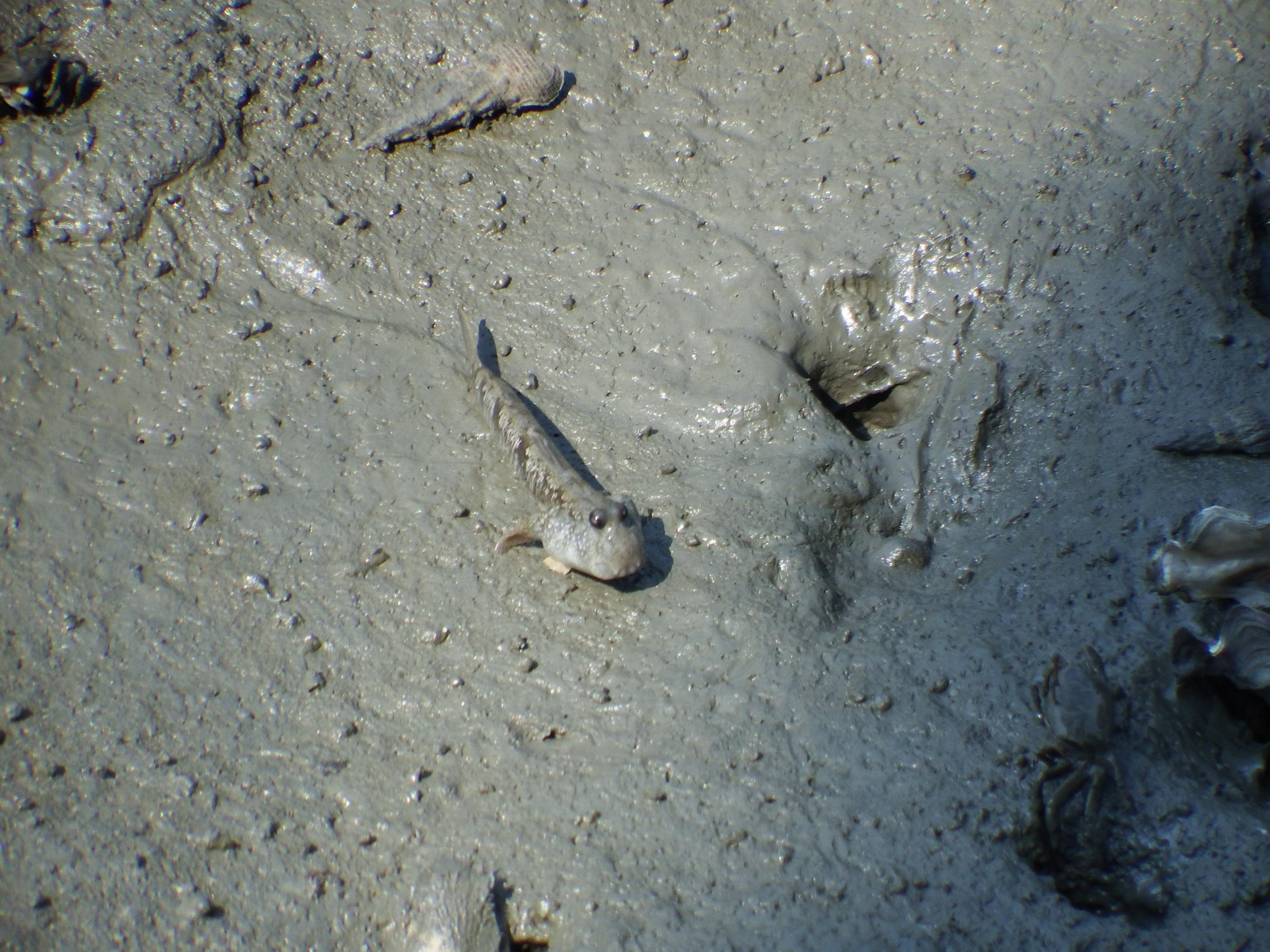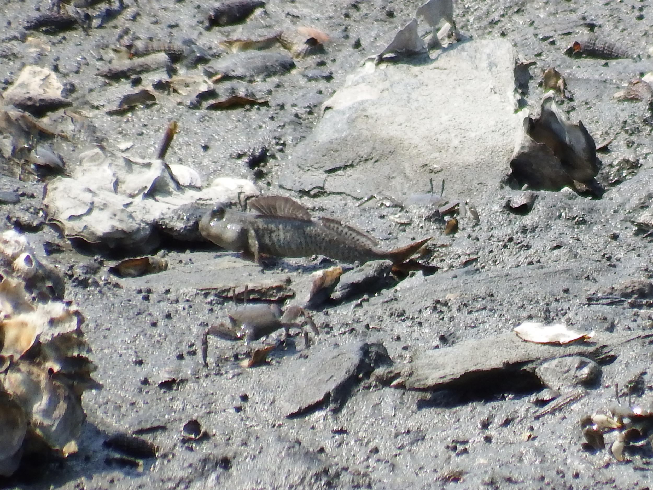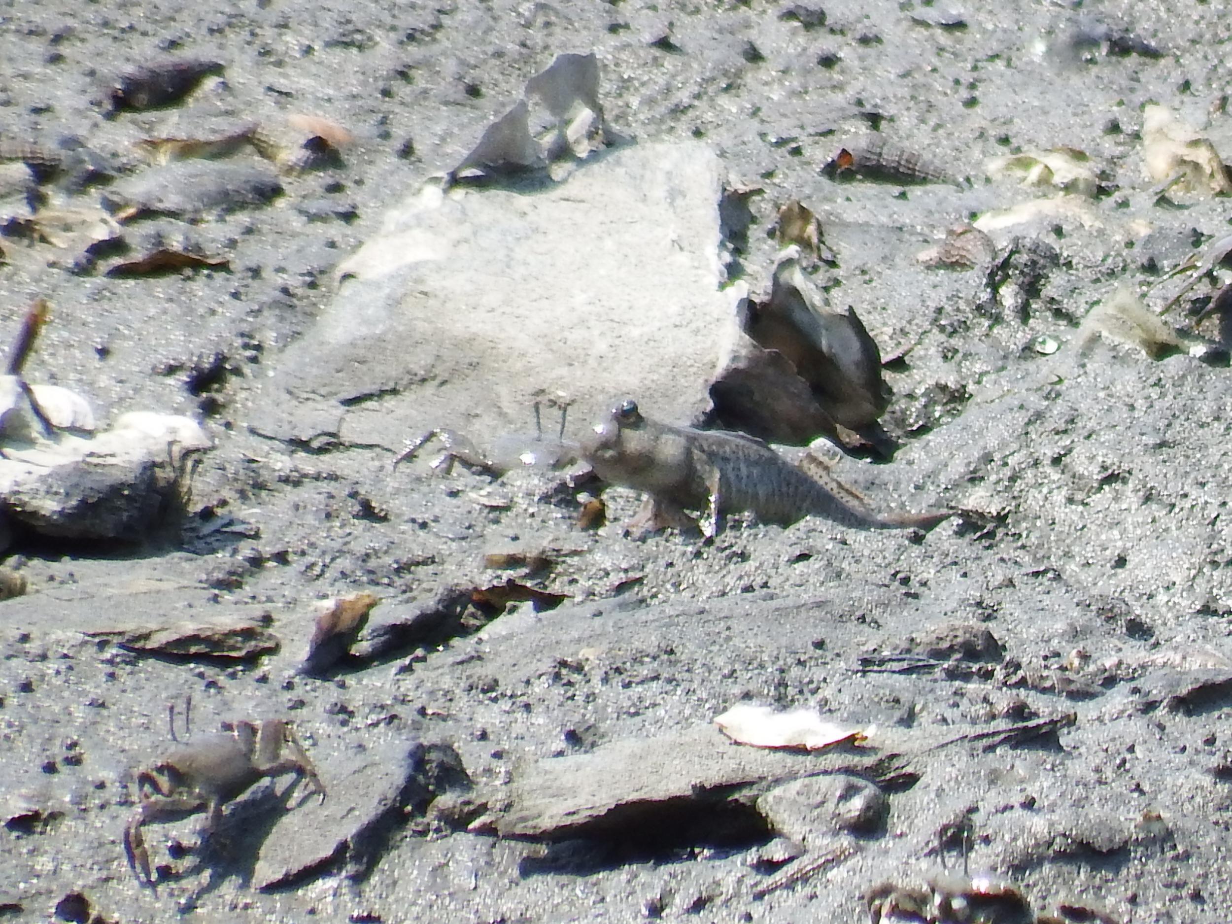 ようやくマッドスキッパー、トビハゼを発見。水辺ばかり探していたのですが、水辺から離れた泥の上にいました。背びれを立てるとカッコいい!