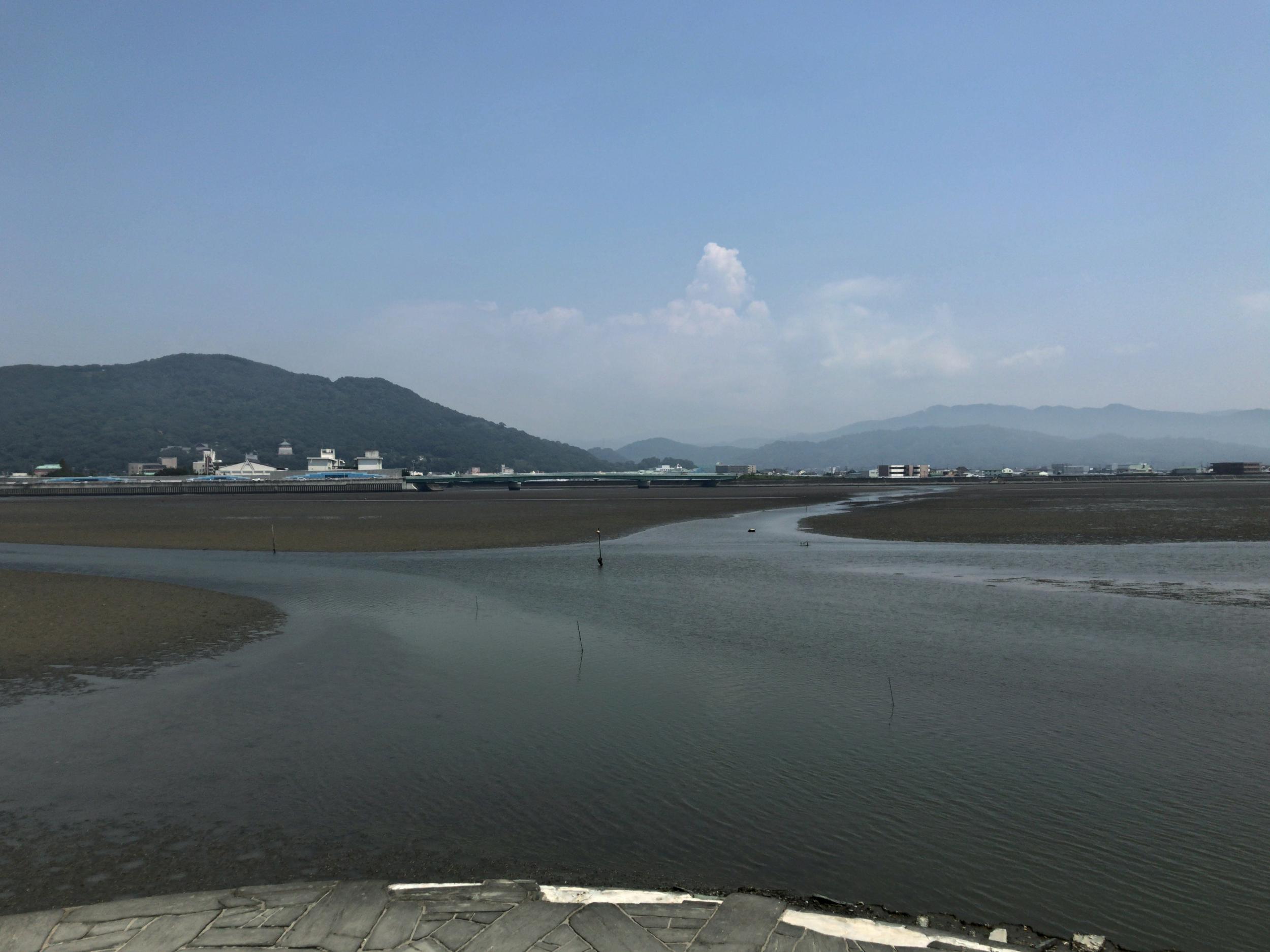 不老橋バス停で下車、和歌川河口干潟は大潮で干潮のピークです。