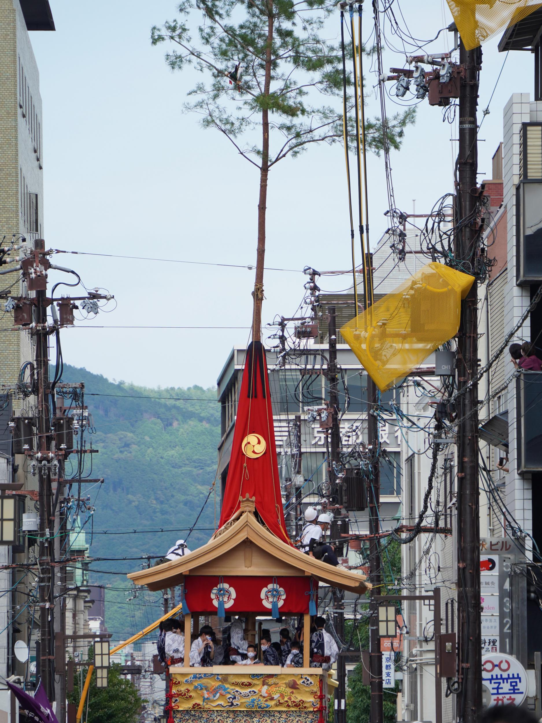 ちょっと斜めの角度で撮ると見目の好さが際立ちます。三条室町の交差点手前で止まって大拍手。この後どっちへ向かうのかと思いきや、引綱を反対側に付け替えて戻ってきました。山鉾には前後がなくどちらにも進めるとはビックリです。
