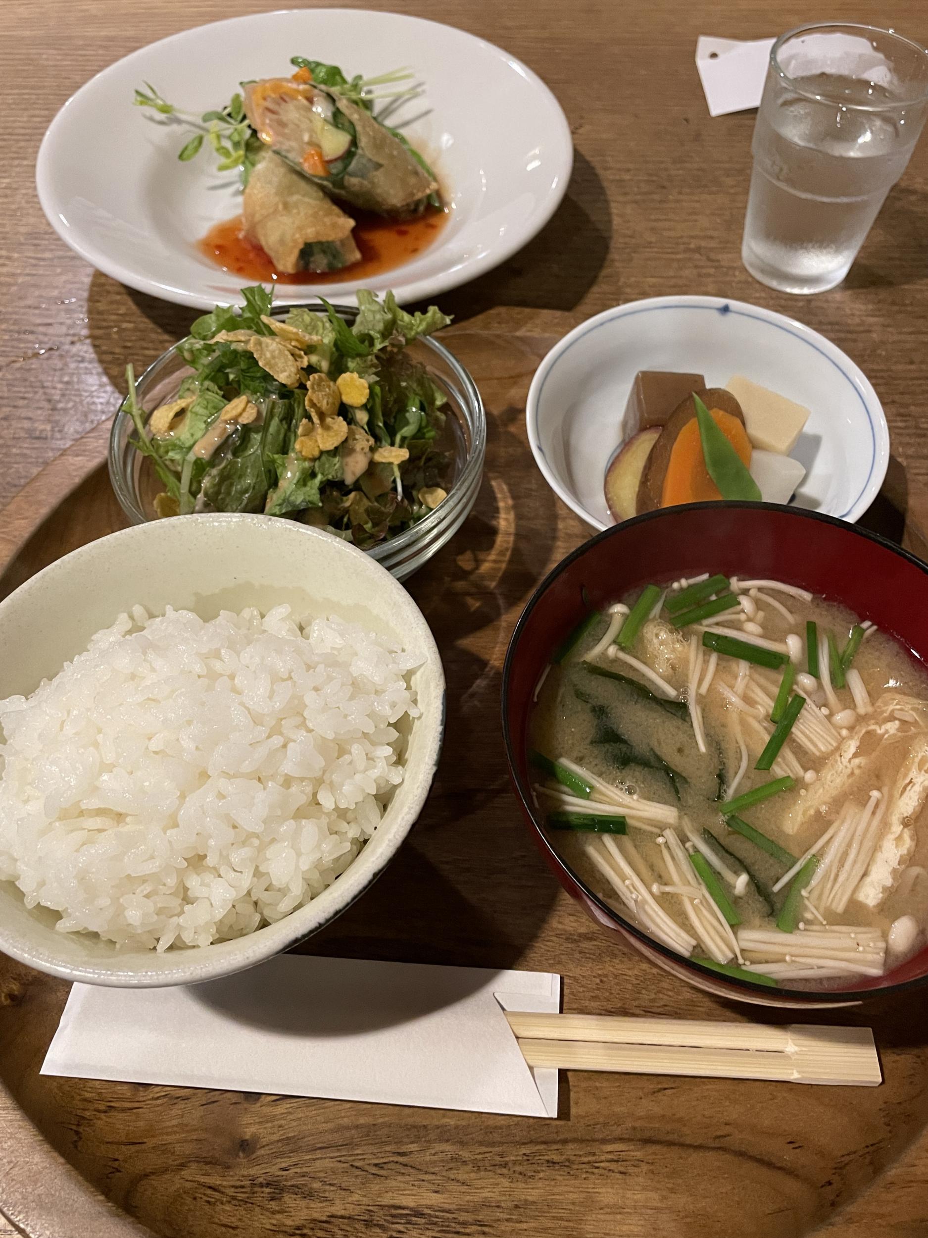 東向商店街はかなりの人出、とんかつがんこでガッツリ食べて行こうと思ったのですが、10人ほどが順番待ちで諦め、もう何度も通っている東向北商店街のお店にしました。今日は天ぷらか春巻きのチョイスで、この店の天ぷら盛り合わせは動物性タンパク質がエビだけのはずなので、春巻きにしました。いつものように野菜の煮物、えのきの味噌汁、コンフレークのかかったサラダ、特に煮物の高野豆腐はあんじょう炊いてあってかなり美味。何かお肉が入っていることを期待していた春巻きは野菜ばかり、よく味わっているとどうやらチーズが入っていた(よーくみるとサーモンも入っていたかも)ので完全ではないものの、ほぼ99%精進料理です。