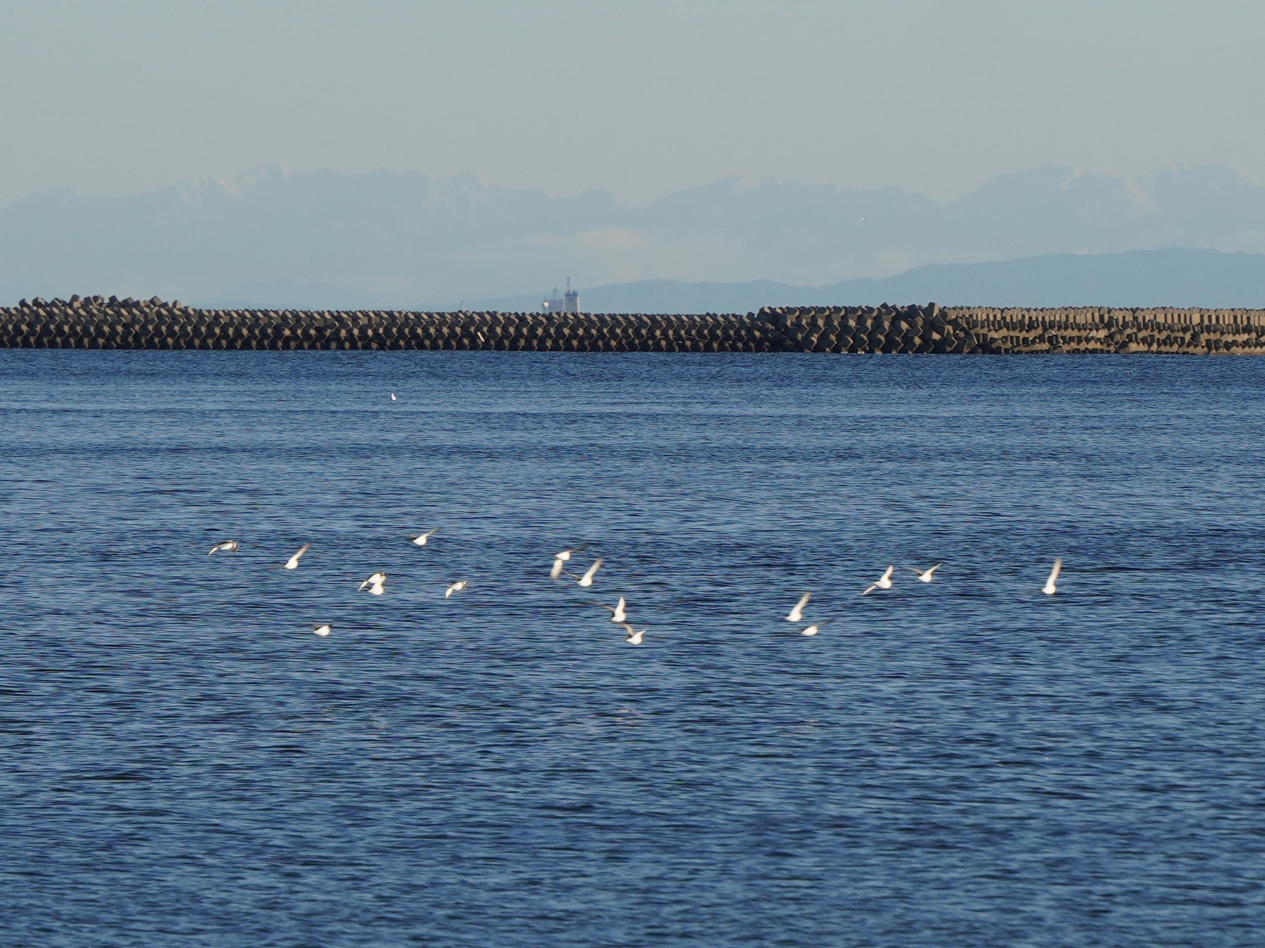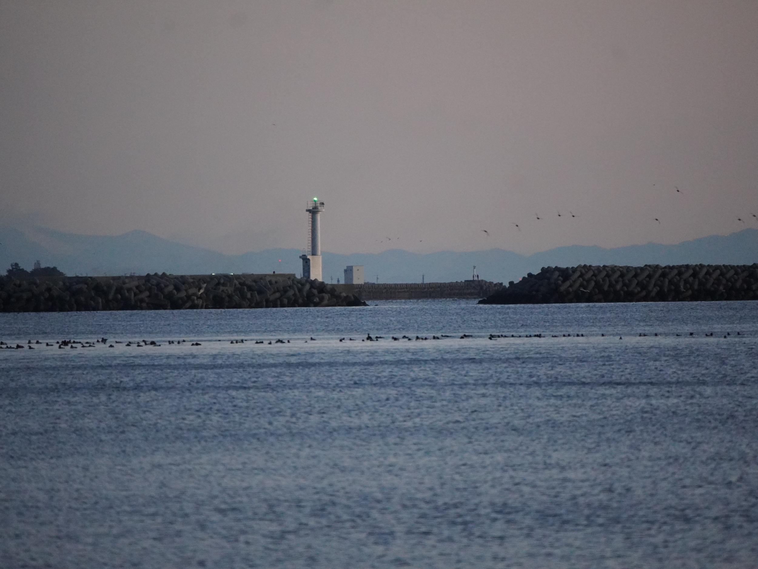 左手河芸漁港の灯台を撮ってみると海上に黒い点々、たぶんスズガモたちです。