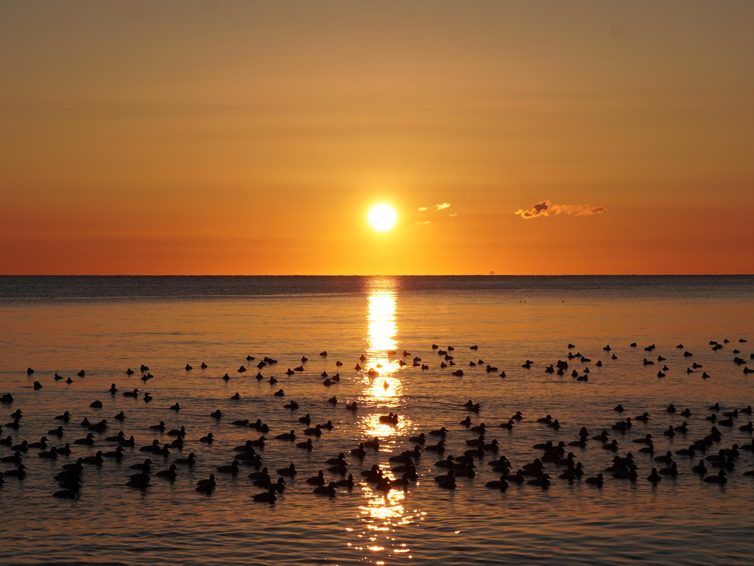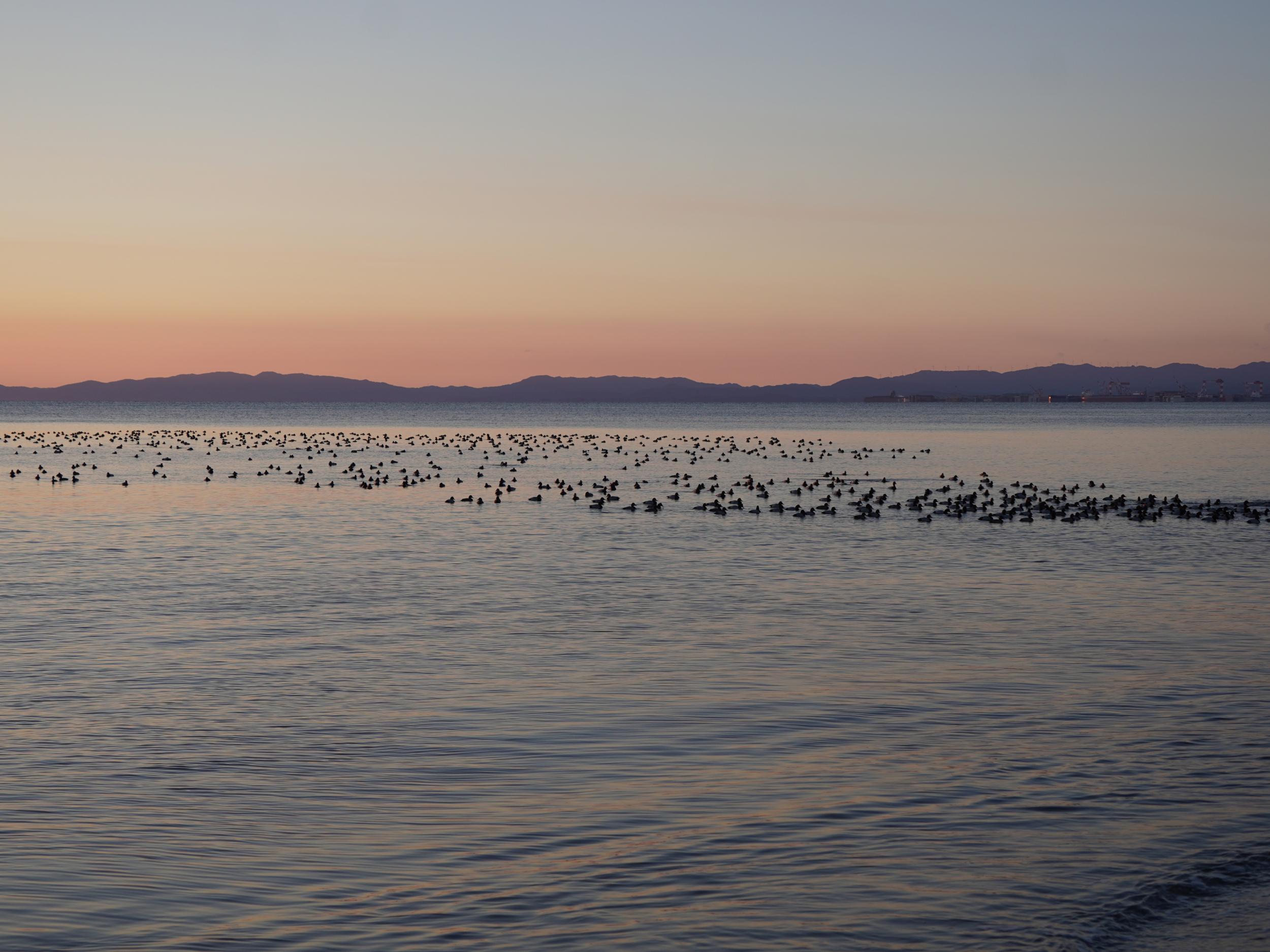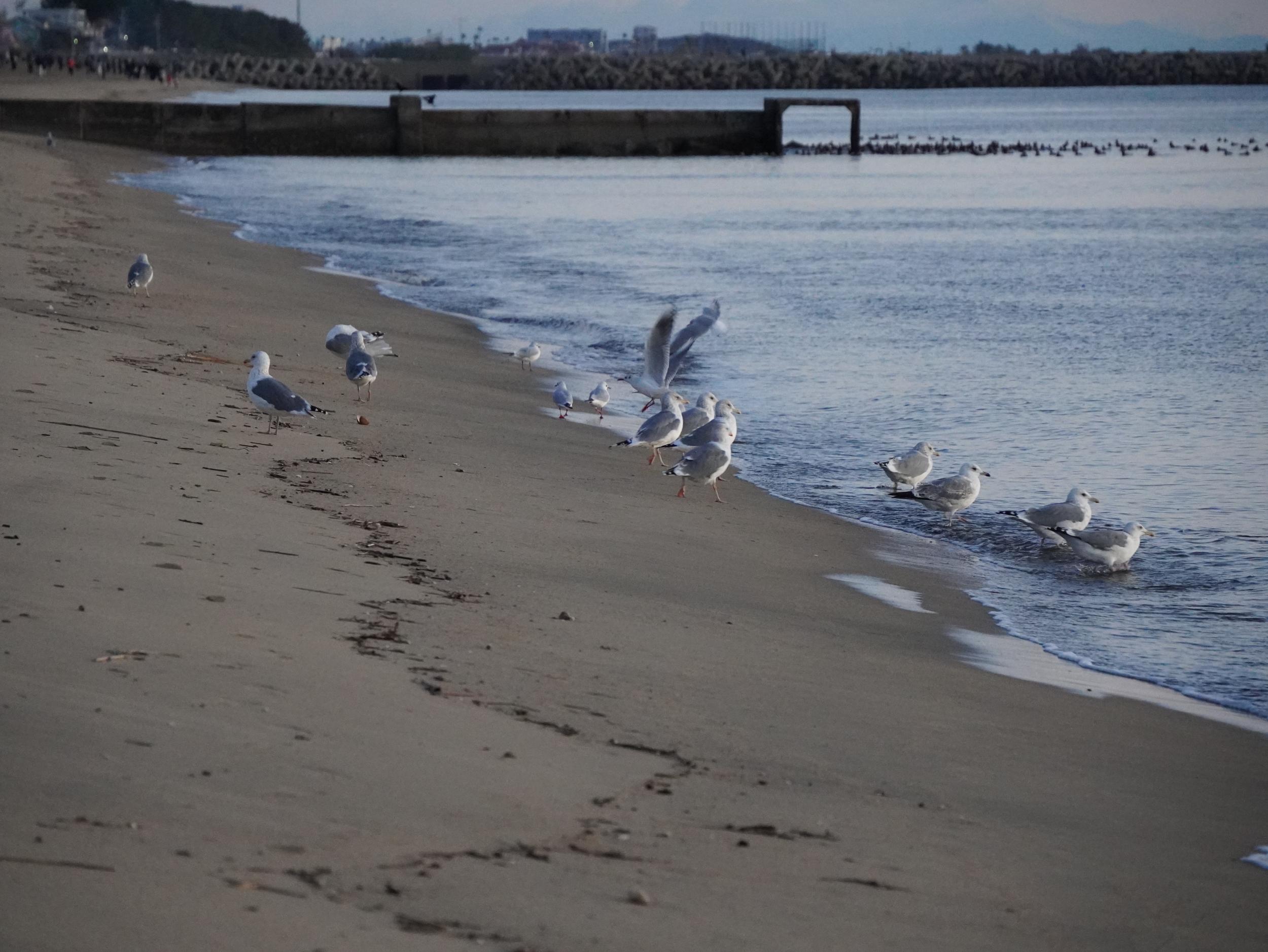 浜辺には朝日を受けたユリカモメたち。ミユビシギはやってきません。