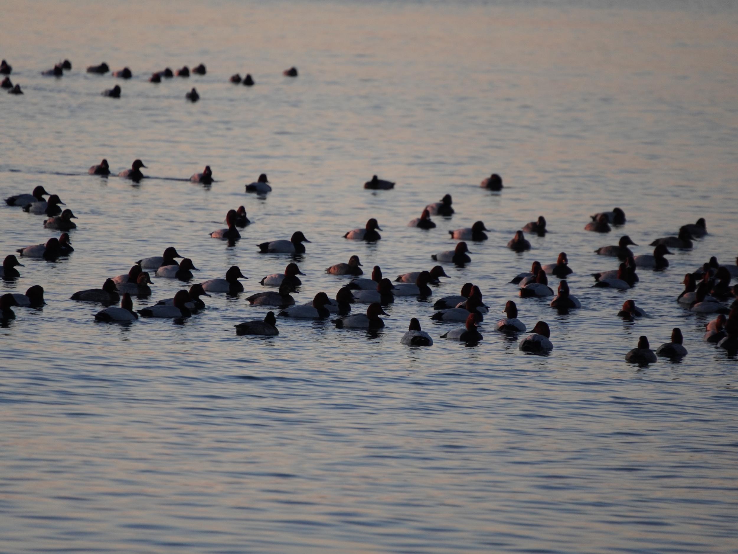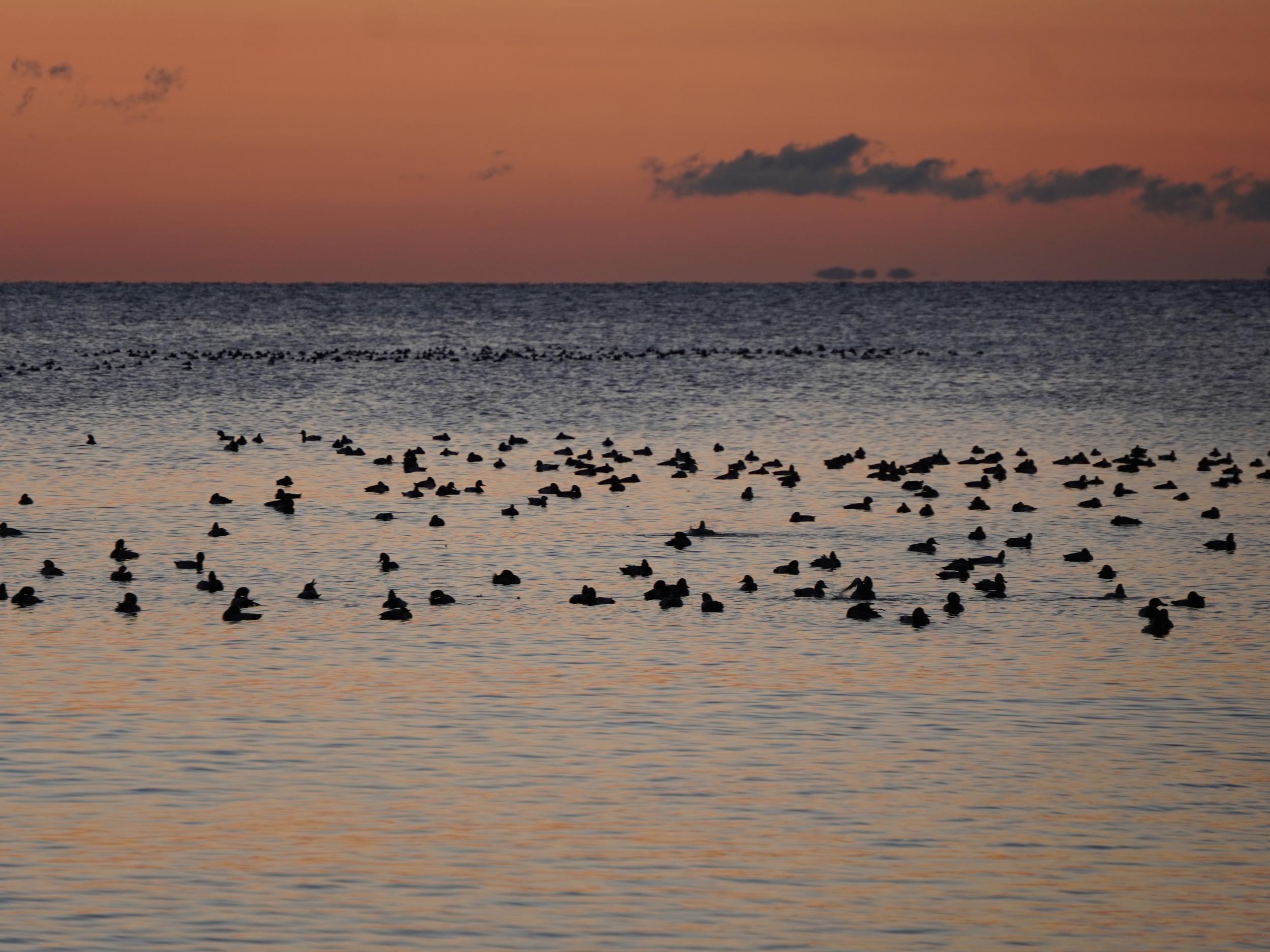 浜の真ん中の石積み堤防のスズガモたち、ちょっと近づきすぎて沖へ逃げていきます。