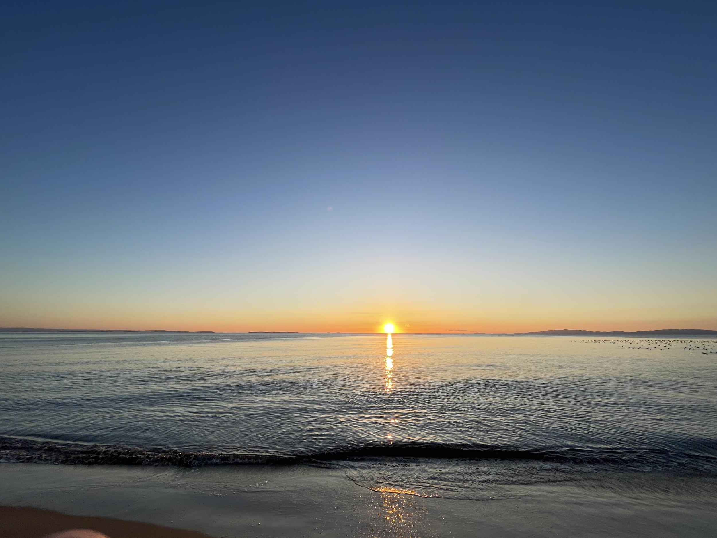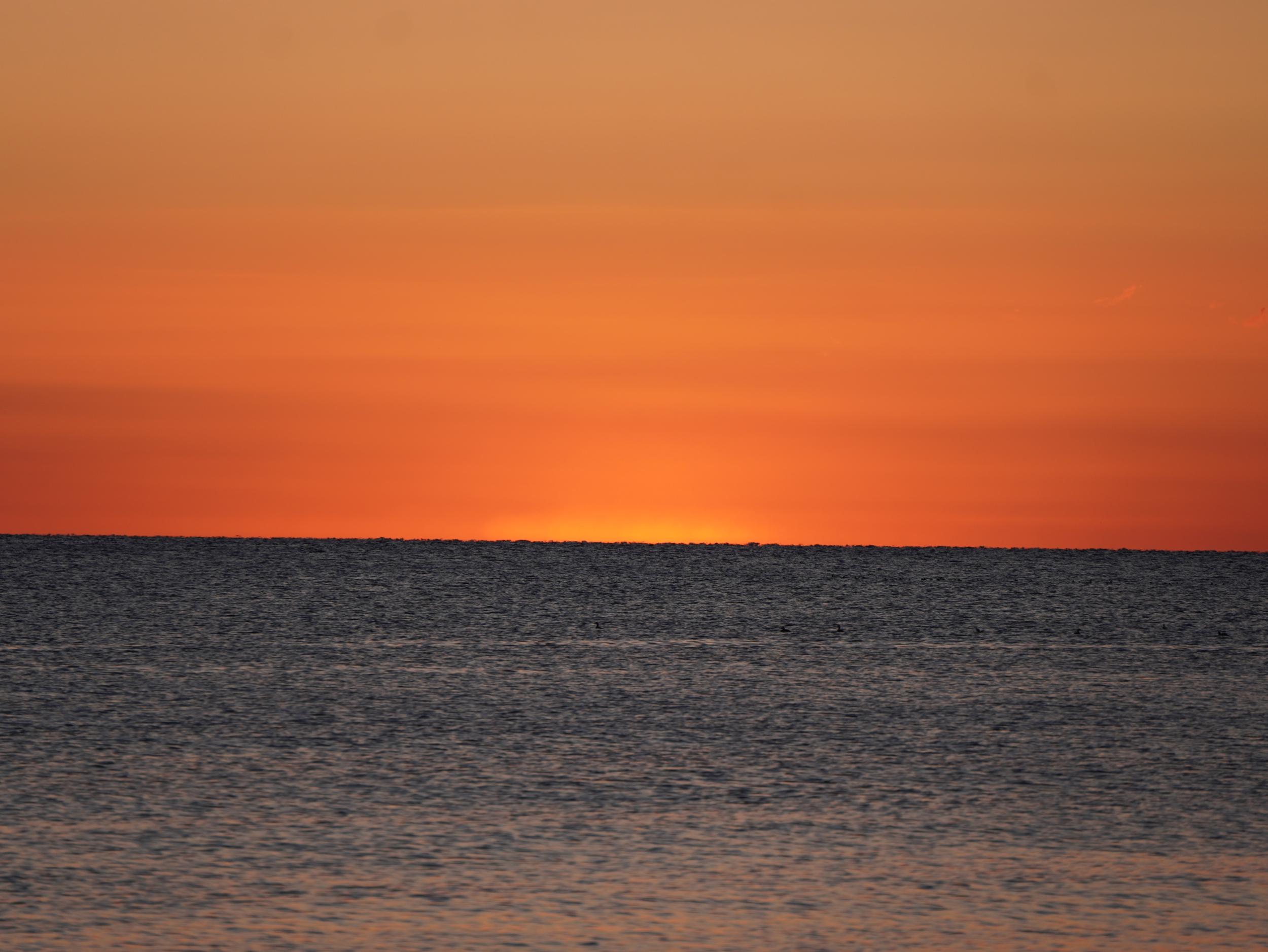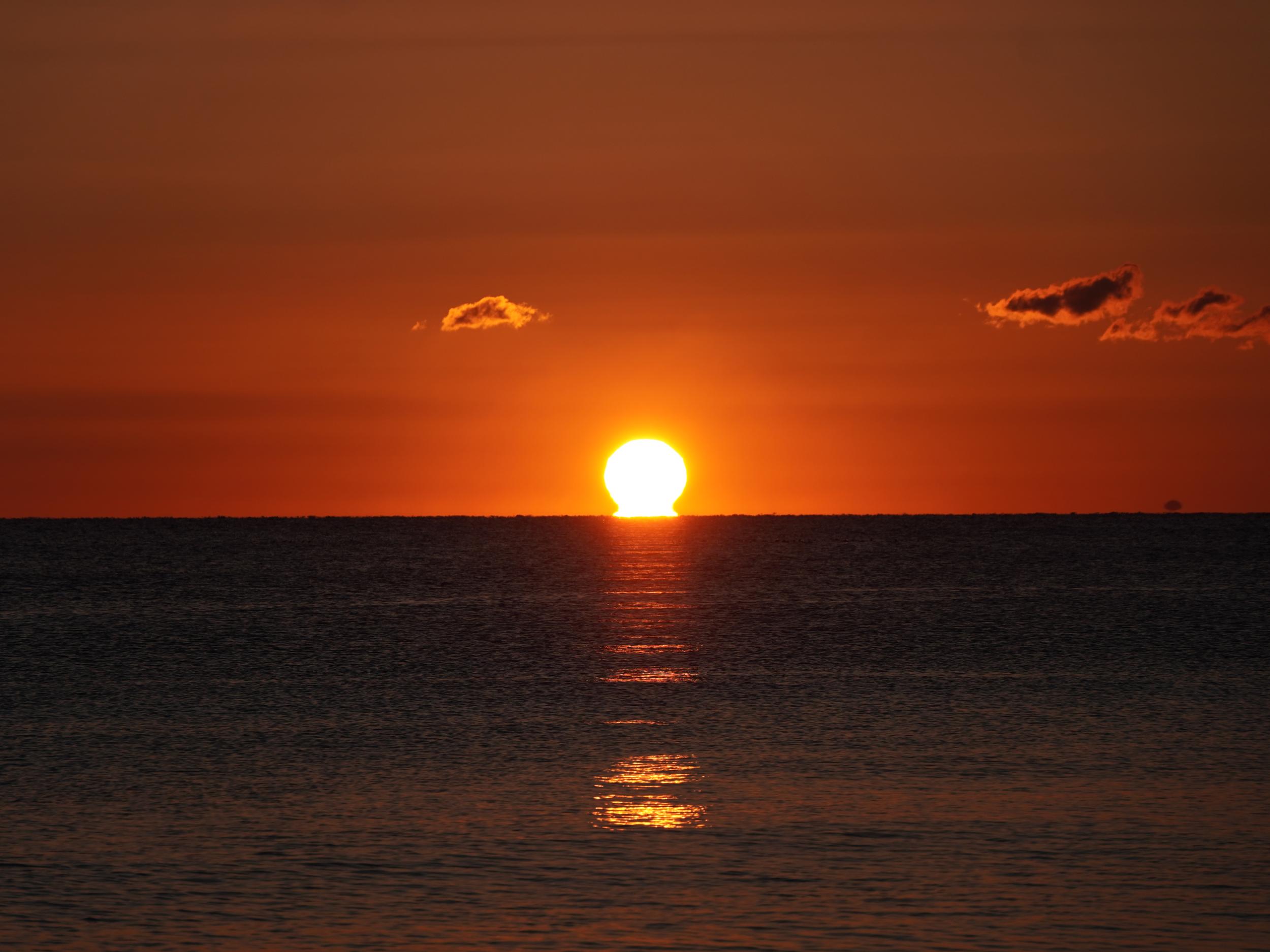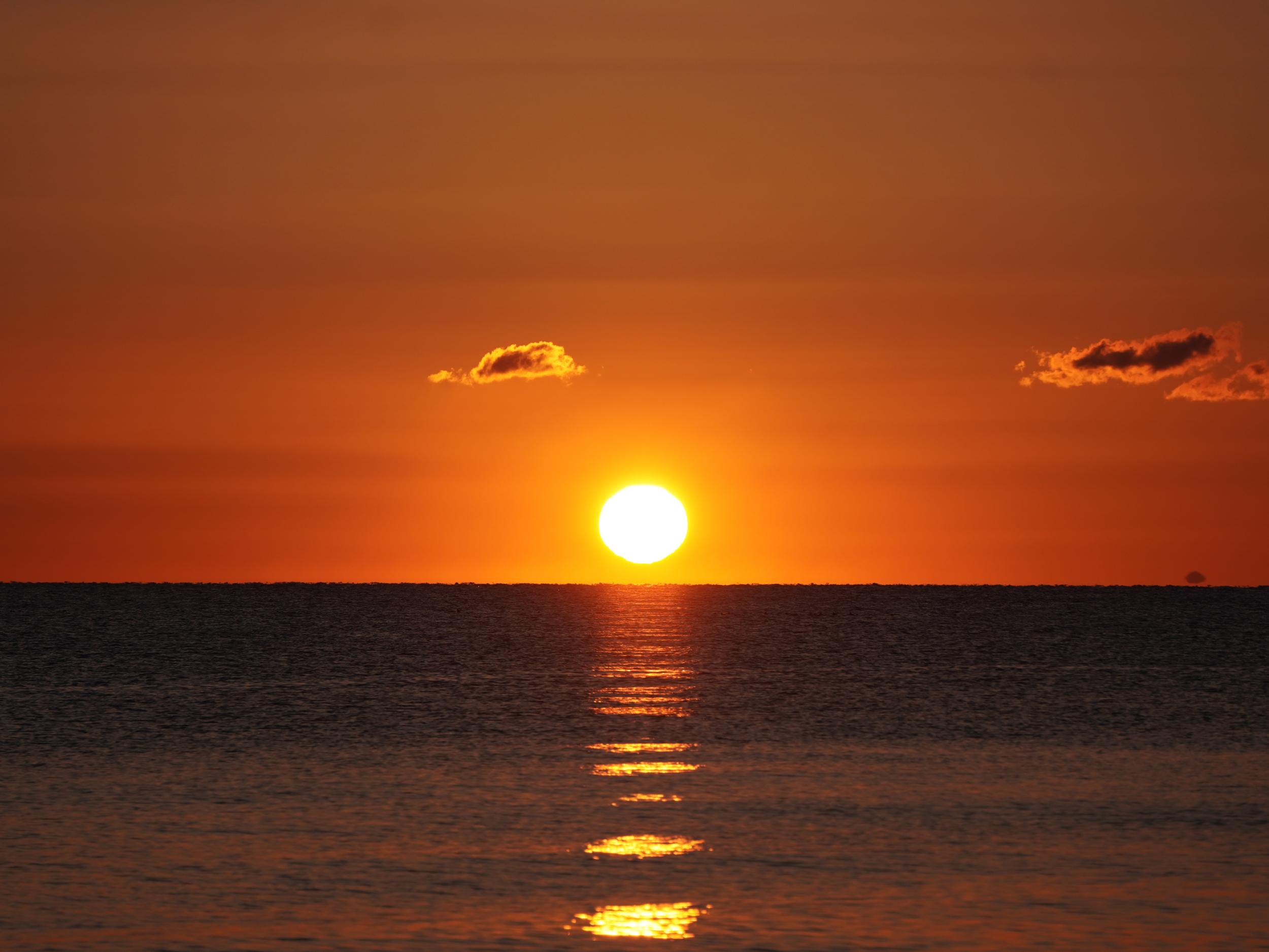 白塚海岸の南端付近にも人が増え、ど真ん中の石積み堤防付近は自分ひとり。水平線の一点が輝きを増してきました。