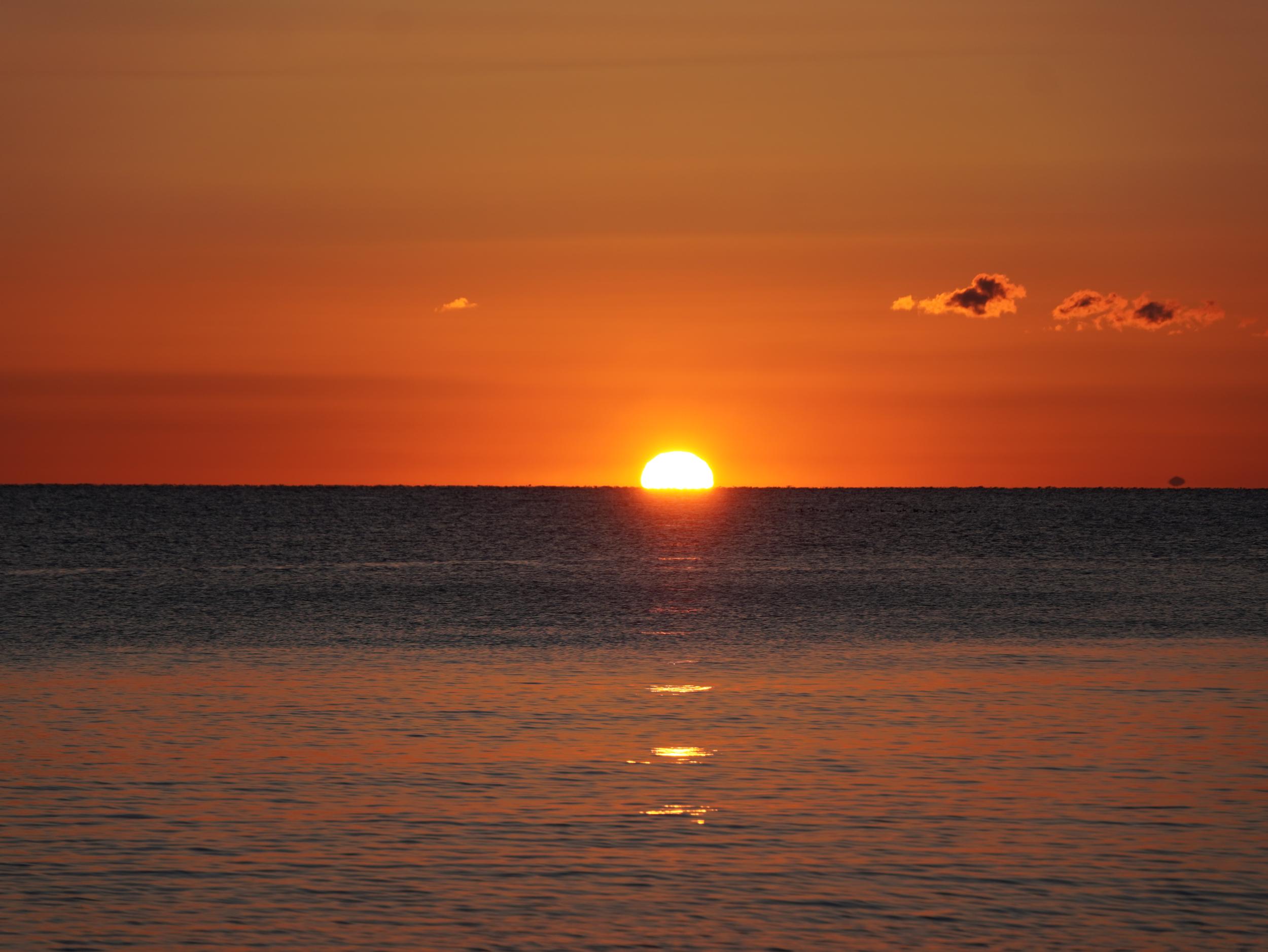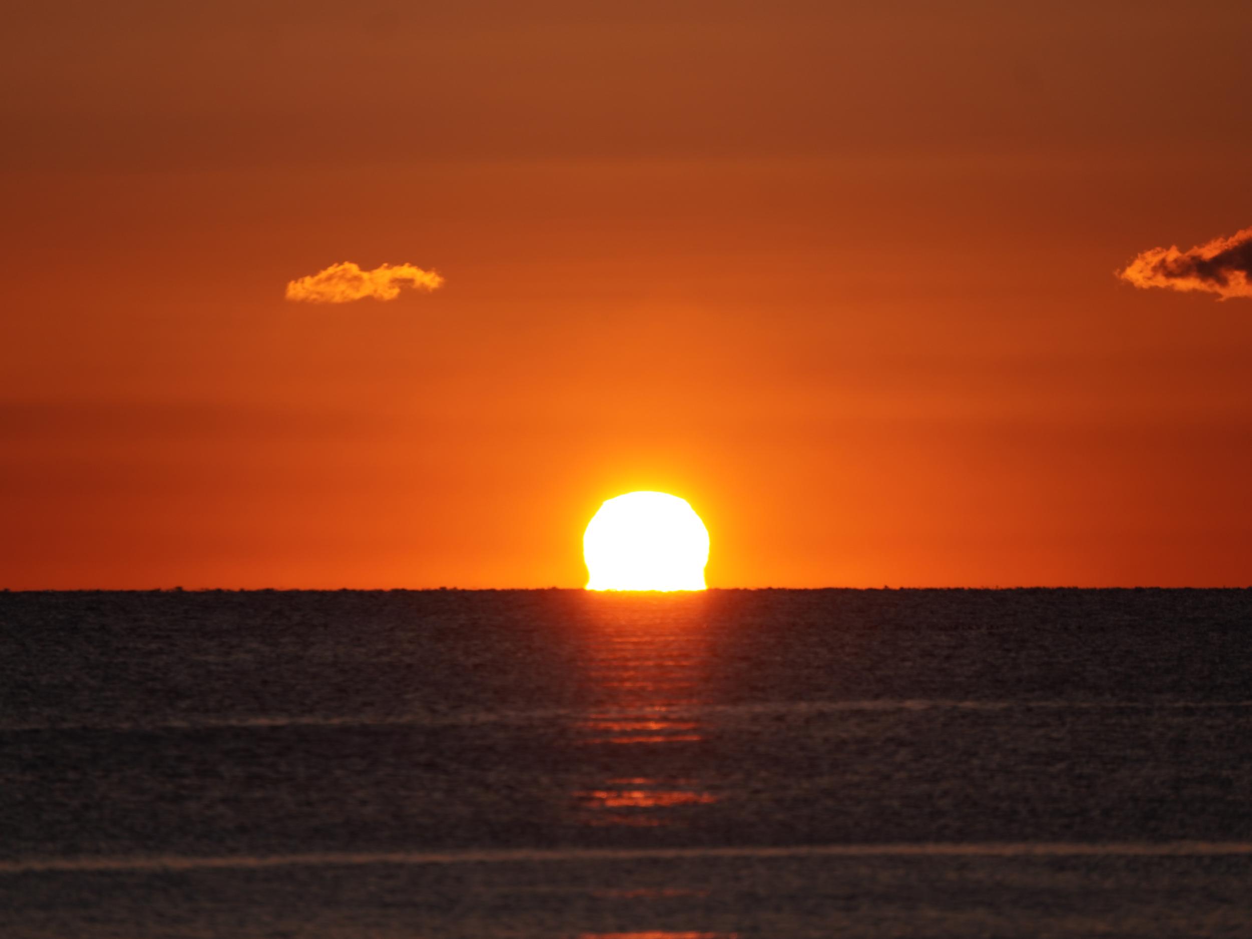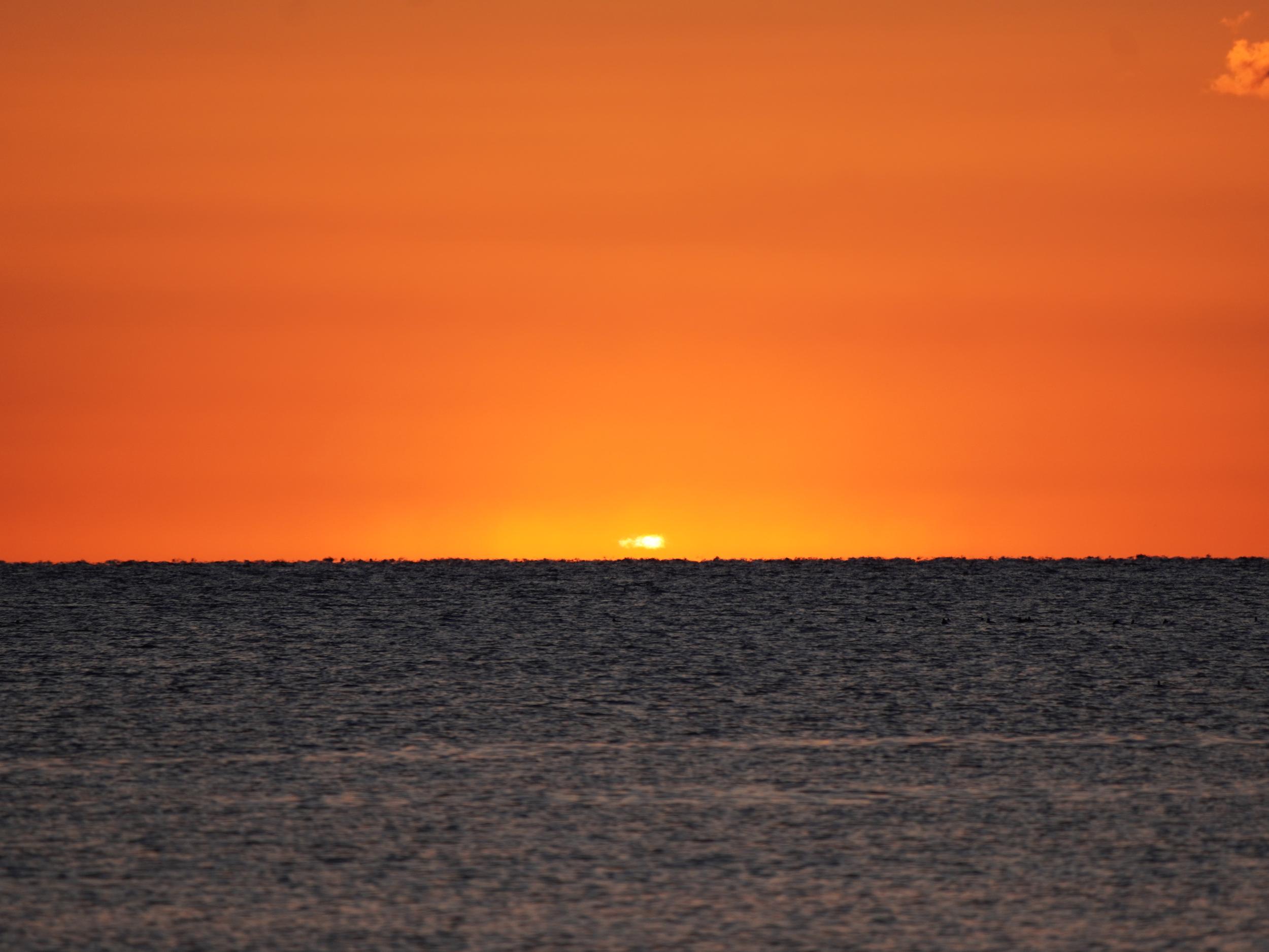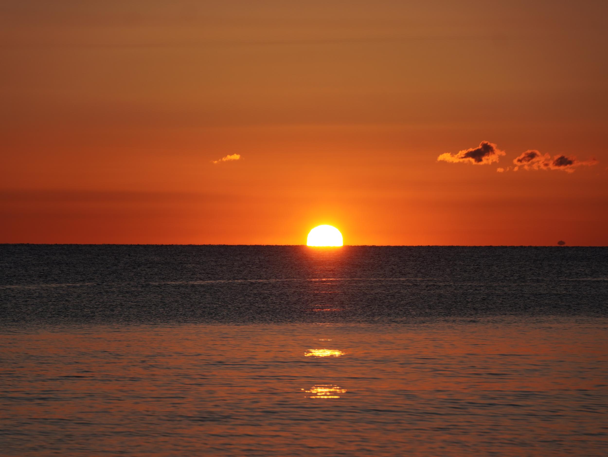 白塚海岸の南端付近にも人が増え、ど真ん中の石積み堤防付近は自分ひとり。水平線の一点が輝きを増してきました。