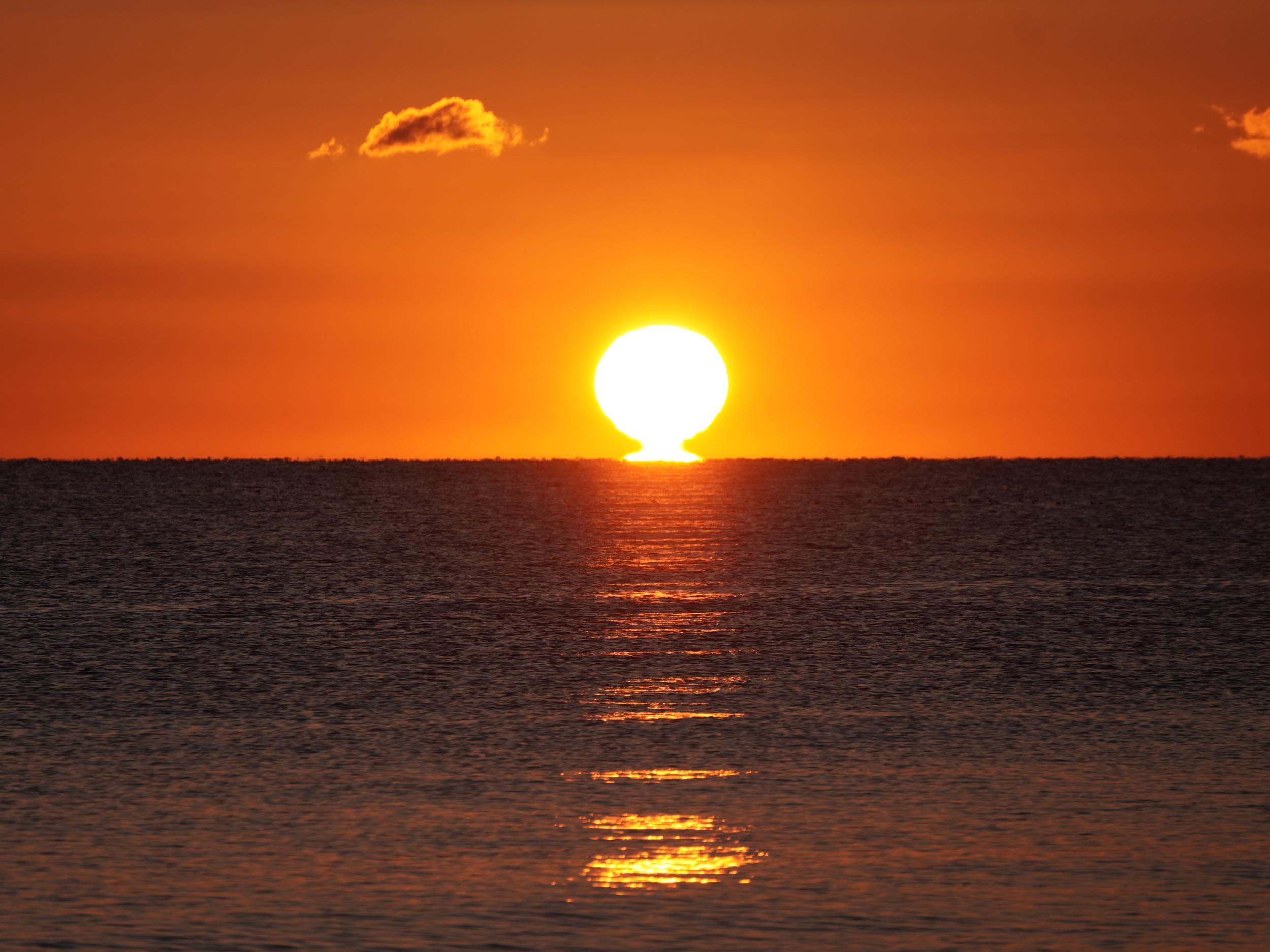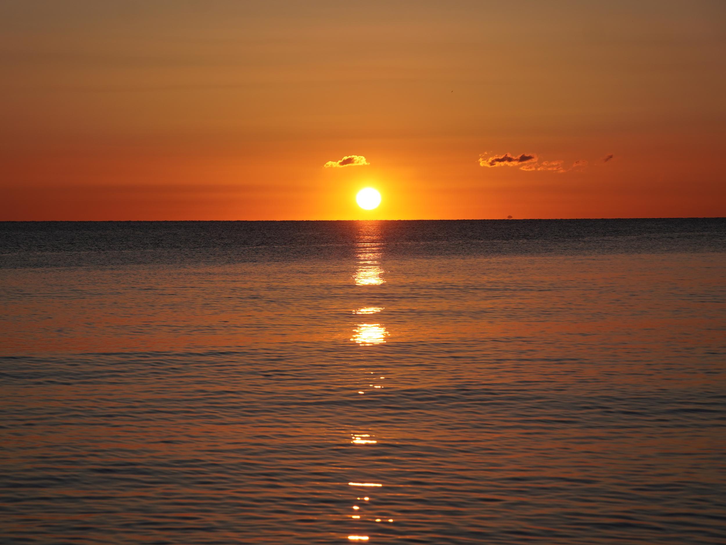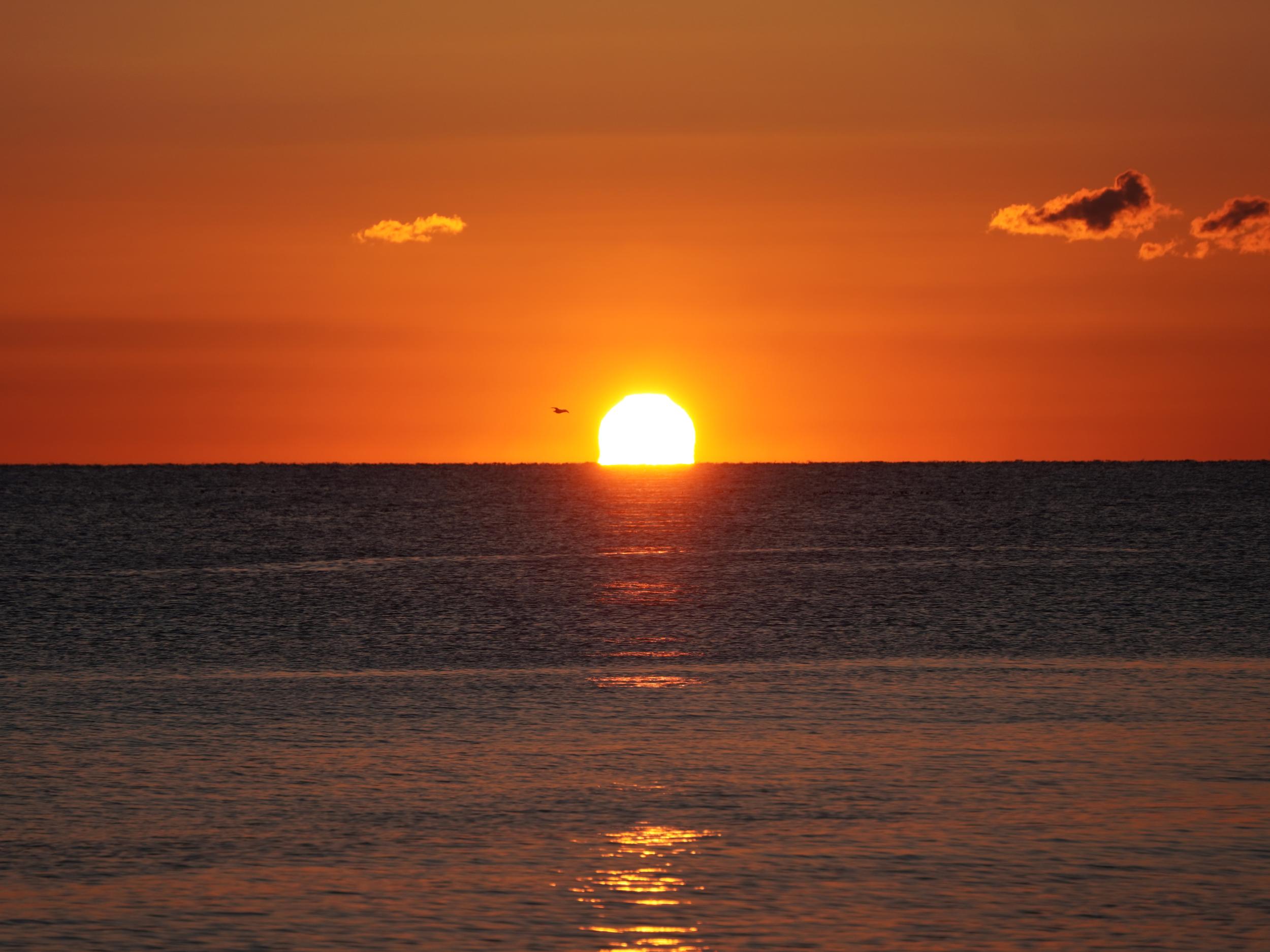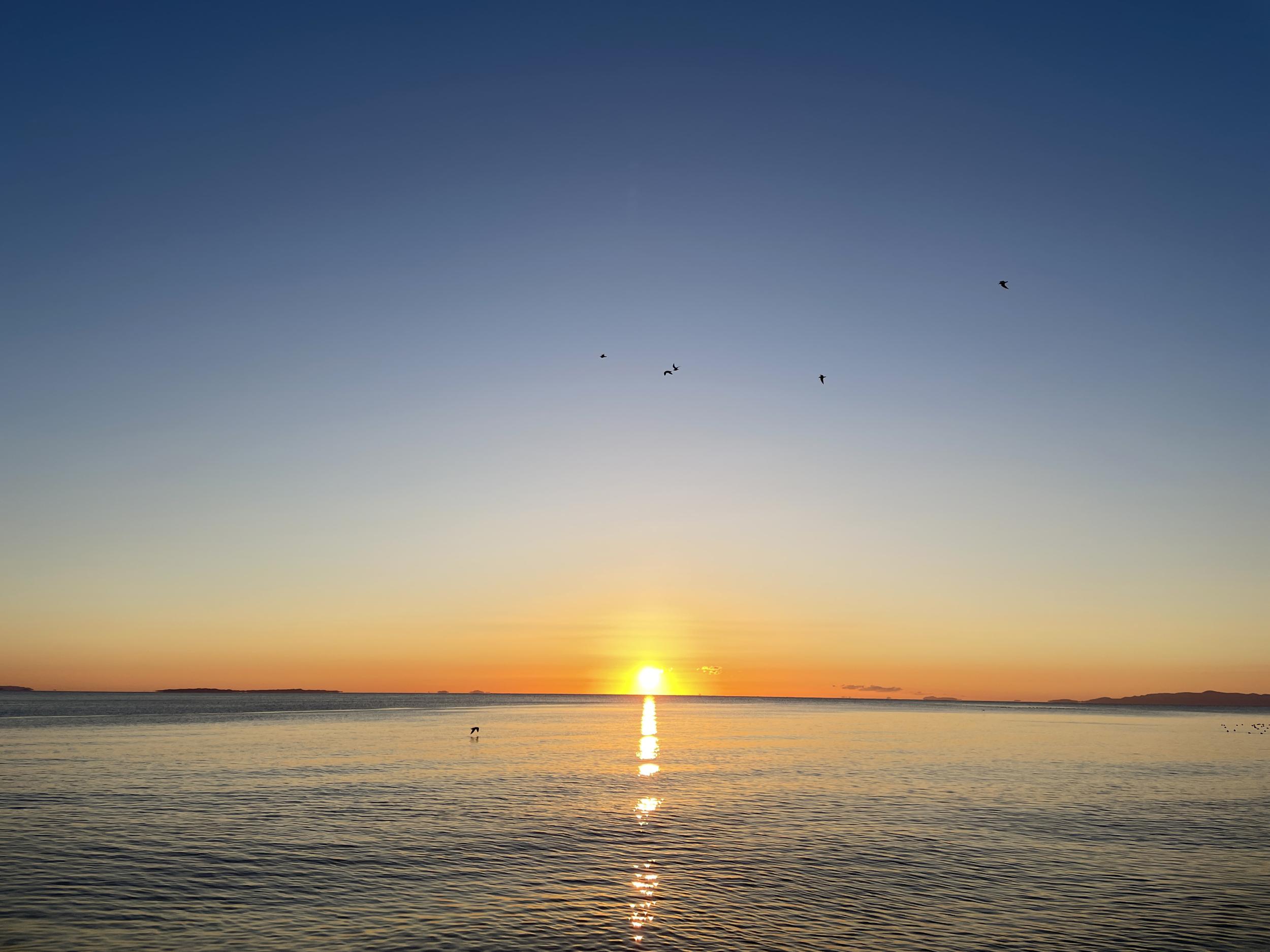 白塚海岸の南端付近にも人が増え、ど真ん中の石積み堤防付近は自分ひとり。水平線の一点が輝きを増してきました。