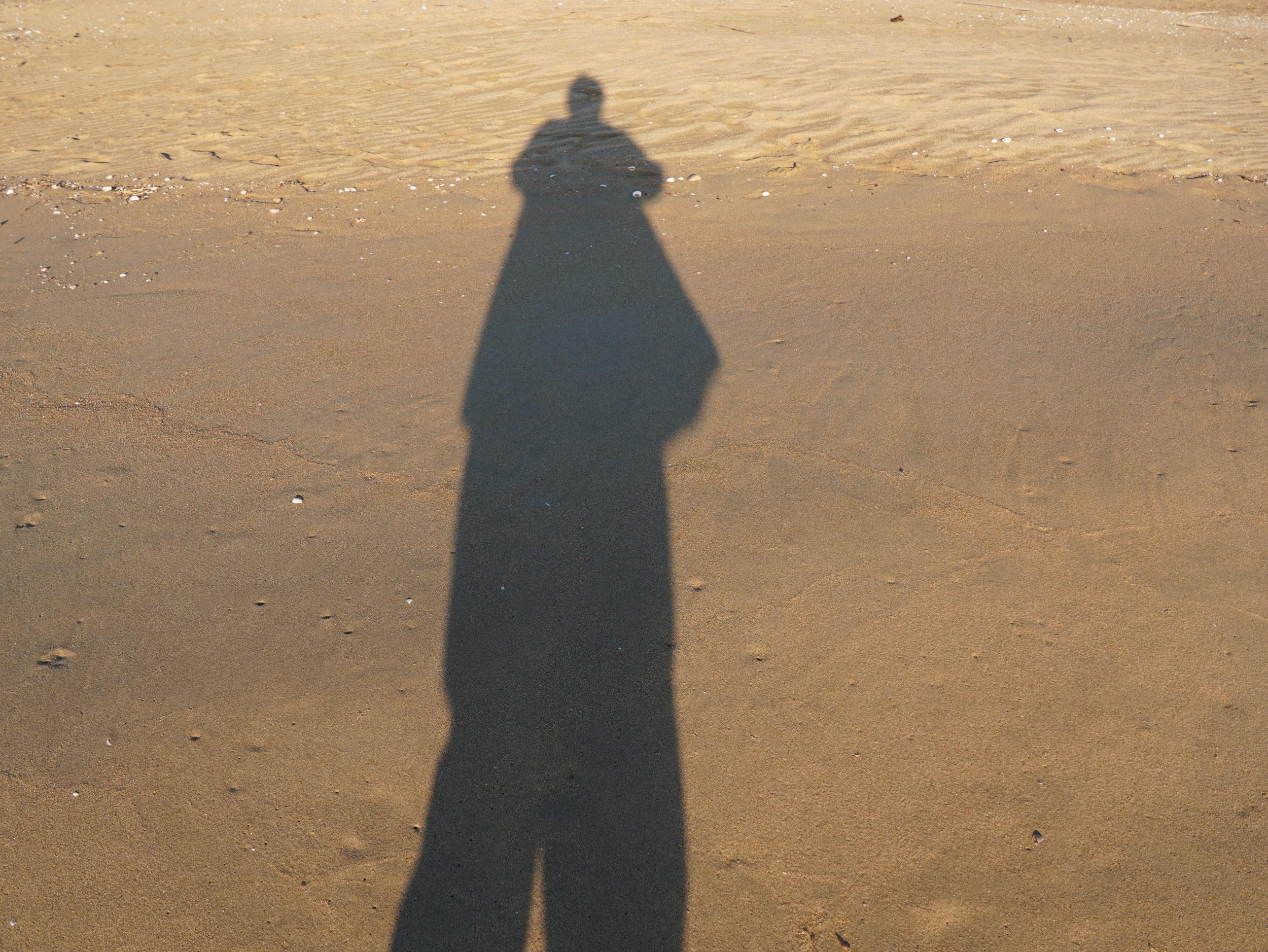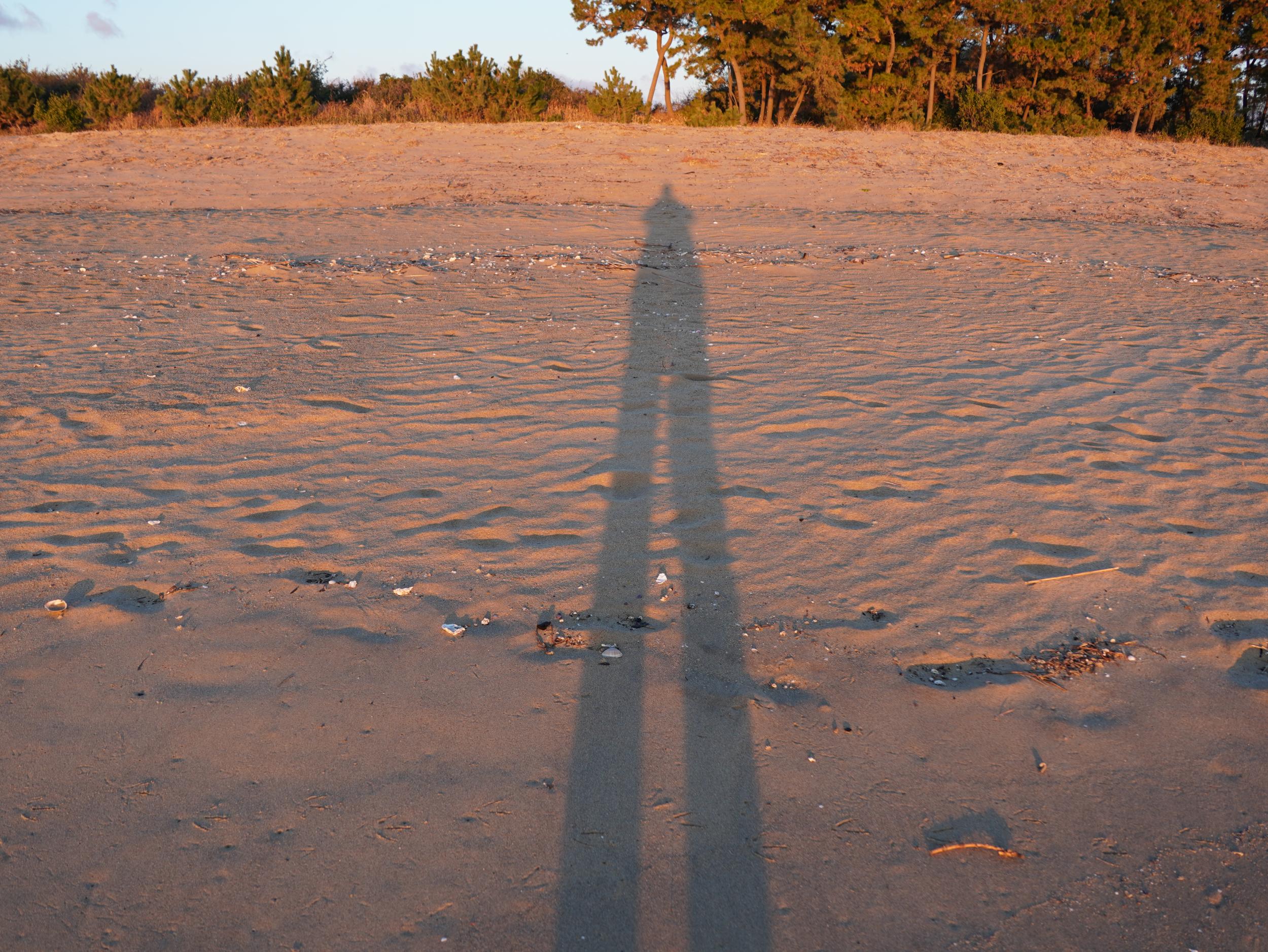 砂浜に長〜い自分の影、茜色の白塚海岸です。