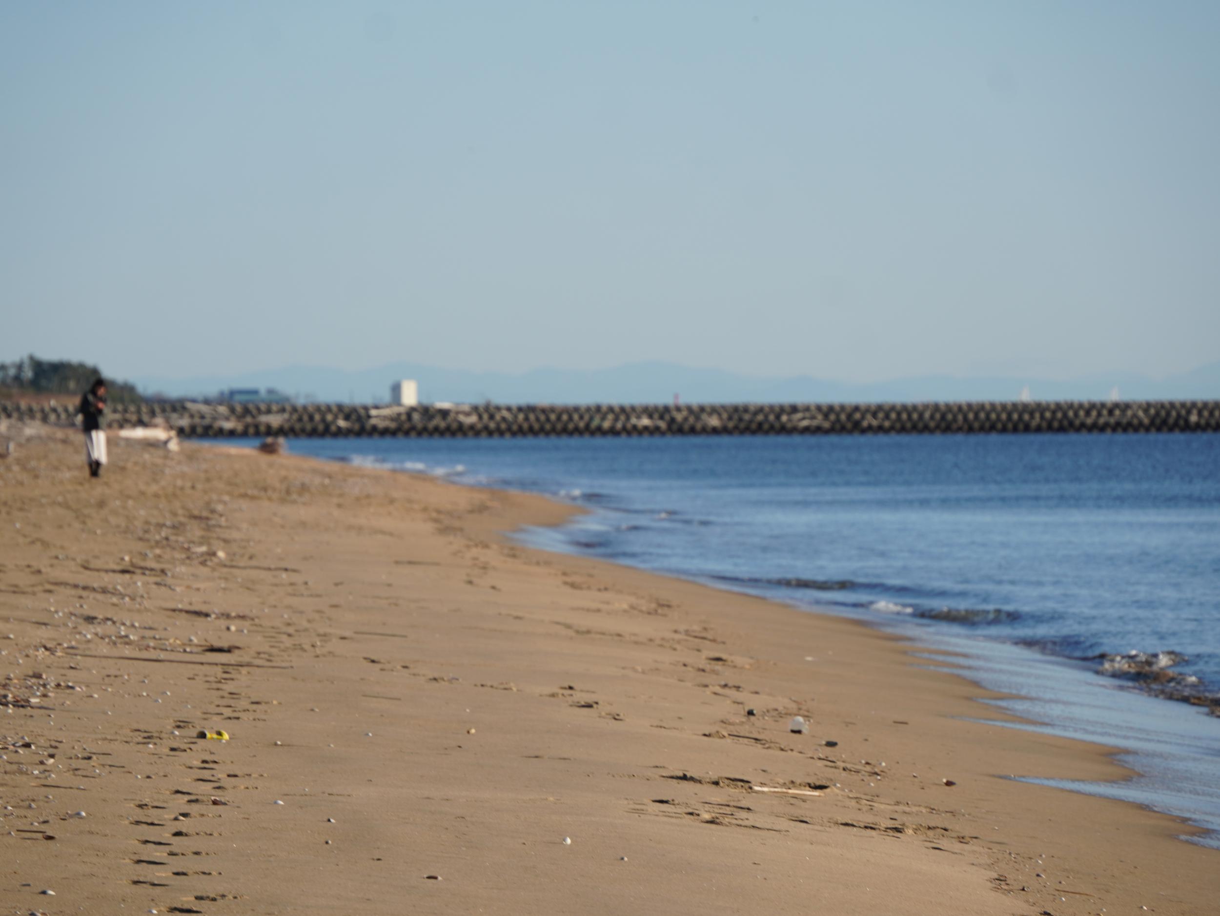 白塚駅のトイレはきれいにリニューアルされていました。去年は海とは反対側にあるセブンイレブンまで往復20分も歩いておにぎりとカイロを買いに行ったのですが、今日は事前にサンドイッチとカイロを買ってきたので、このまま海へ向かいます。