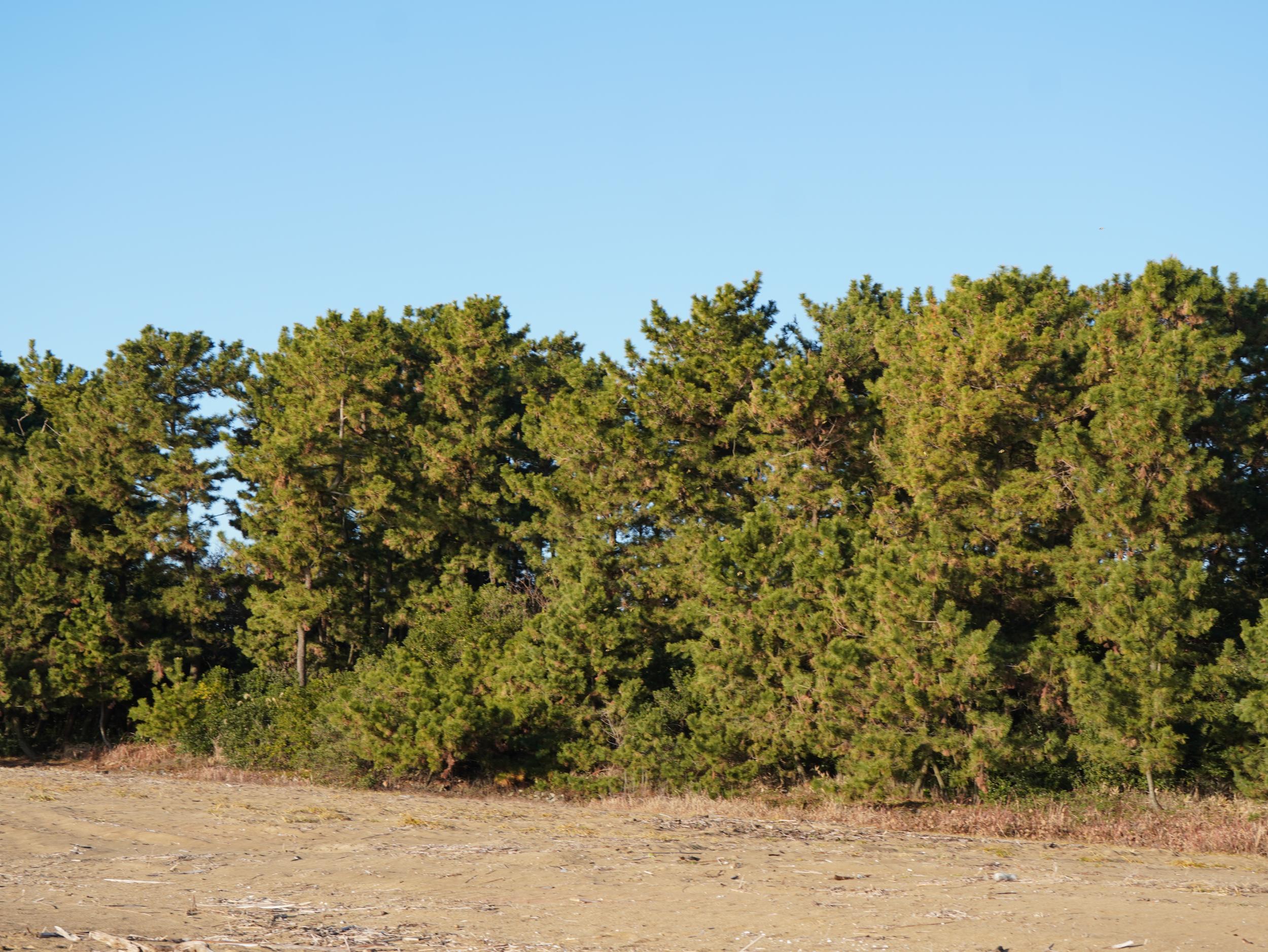 鳥はいない人もいない浜辺を10分も歩いていると人がいた、と思ったら松の木の防風林に鳥たち。