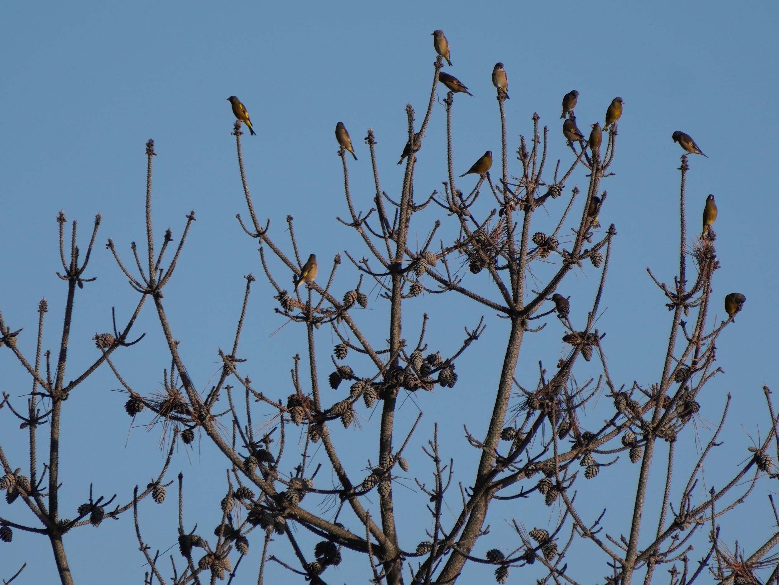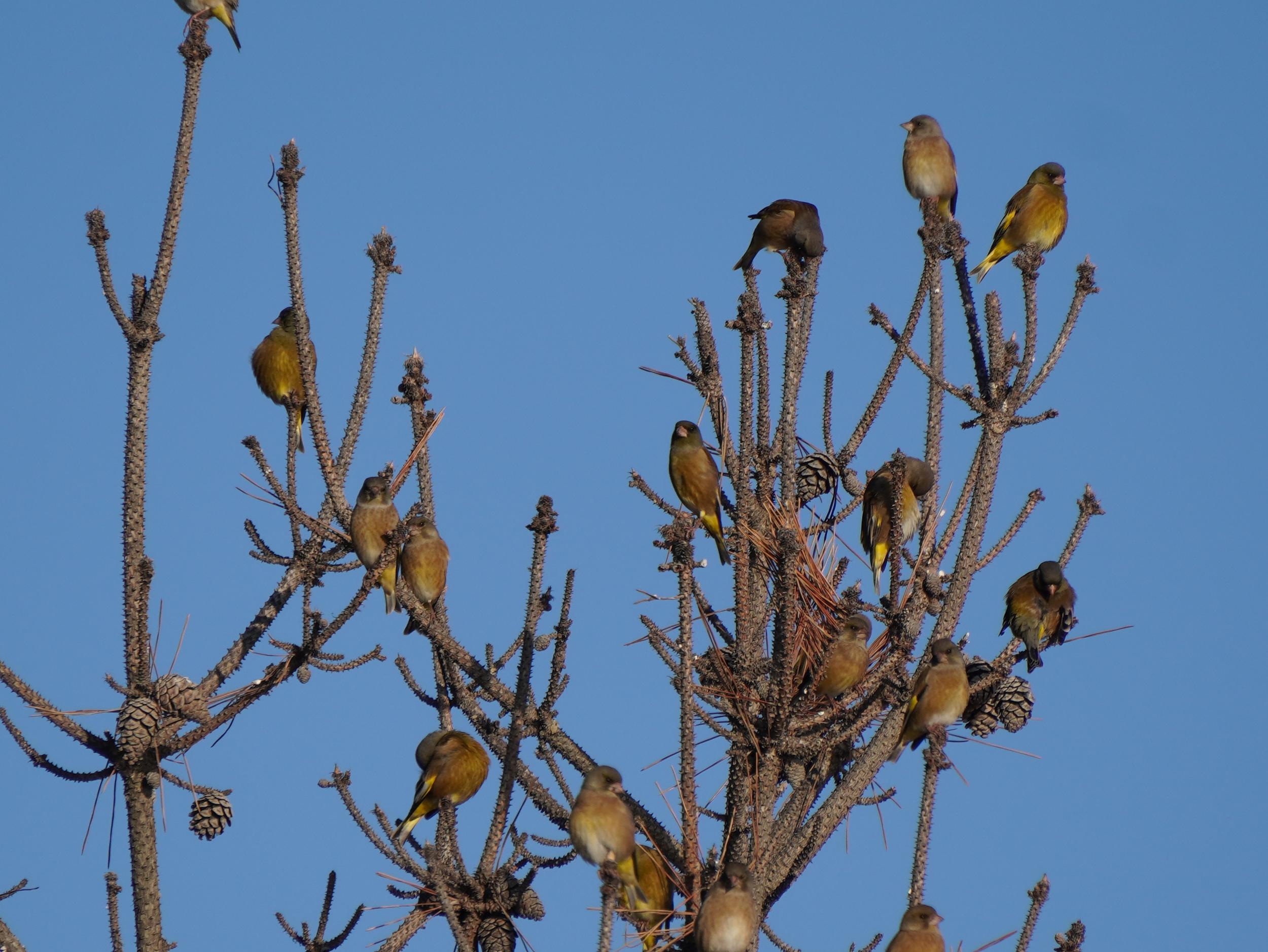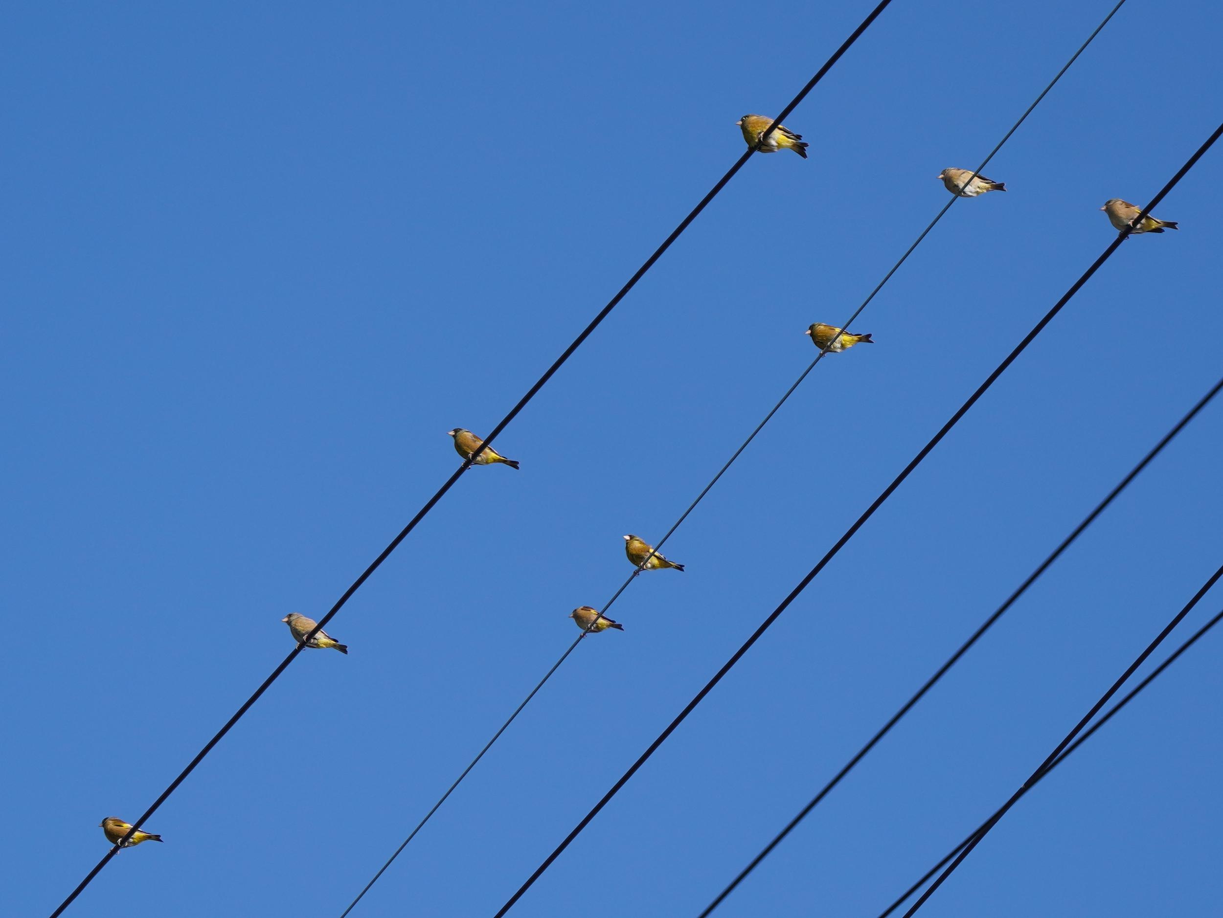 電線にカワラヒワがいっぱい。さっき松ぼっくりだけの松に止まっていたグループと思われます。
