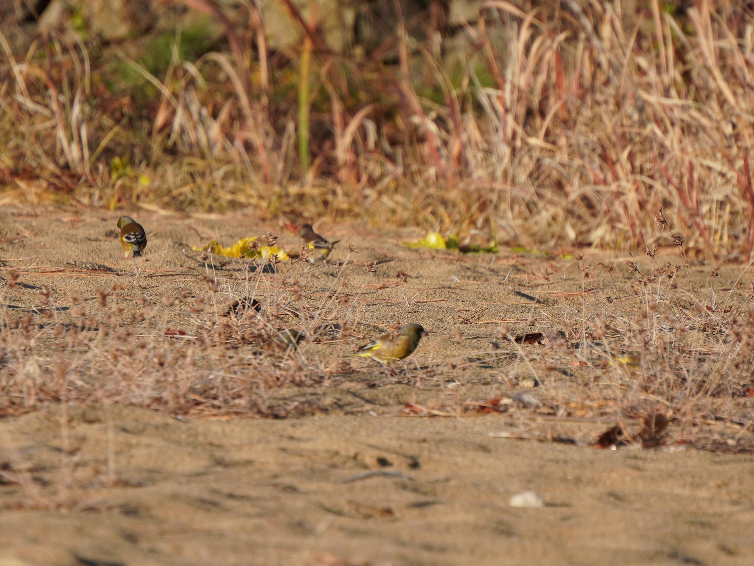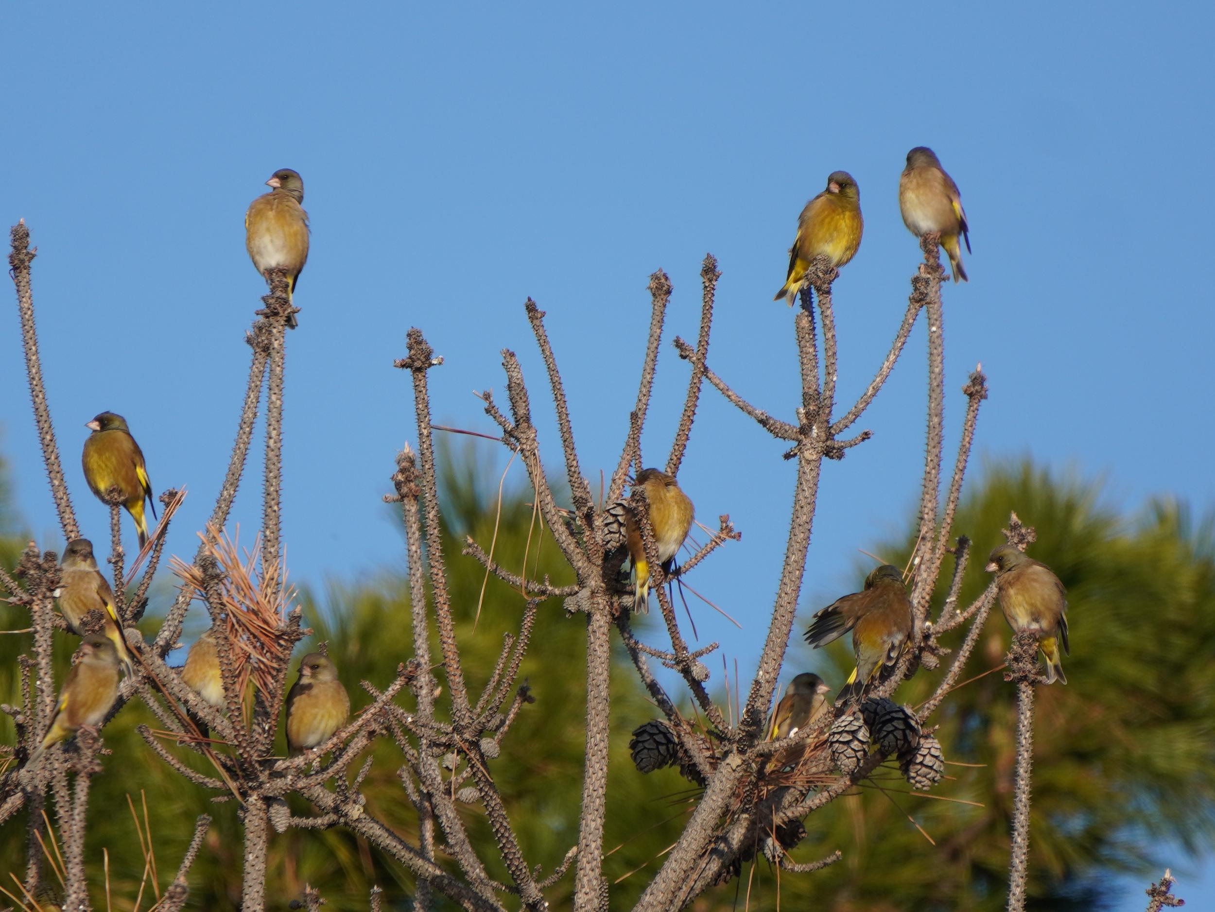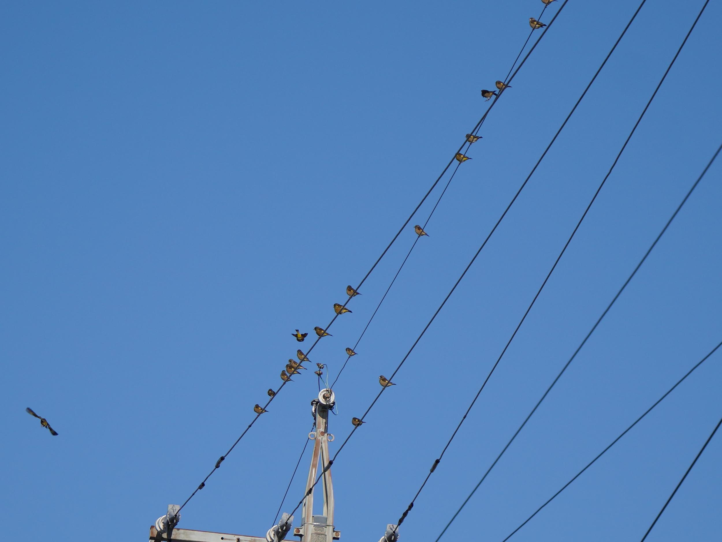 電線にカワラヒワがいっぱい。さっき松ぼっくりだけの松に止まっていたグループと思われます。