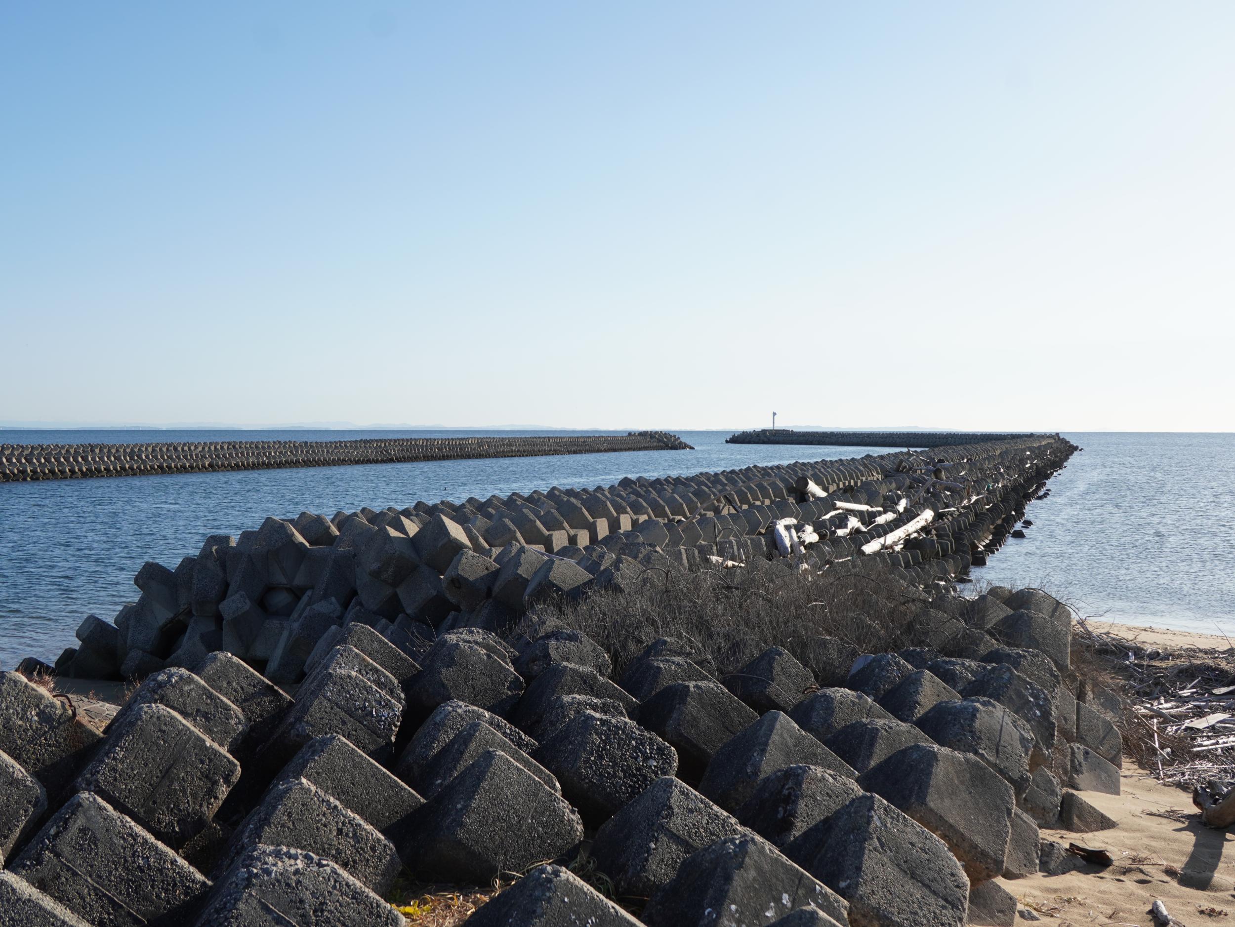 芦原海岸を踏破です。消波ブロックの内側は田中川。