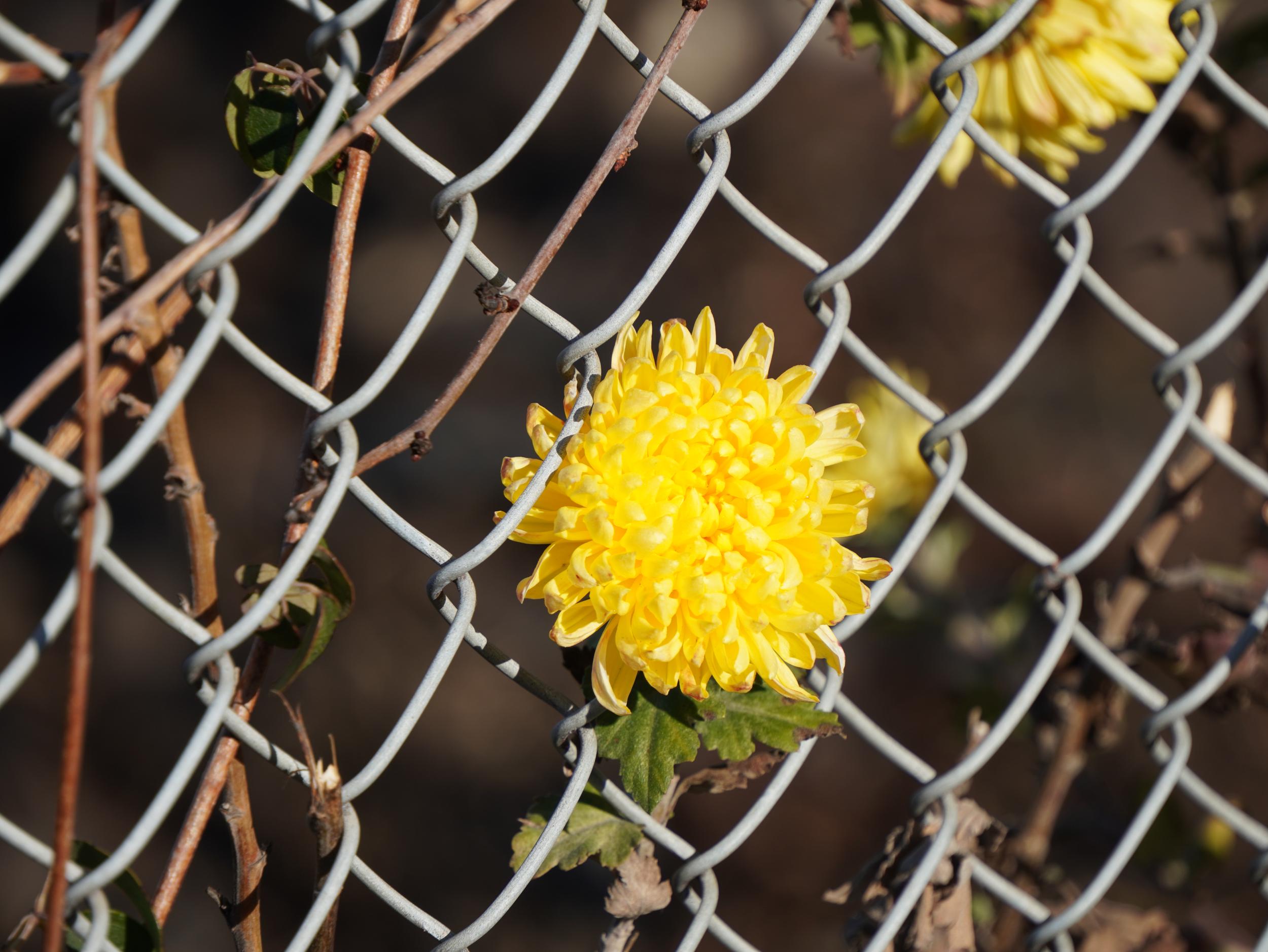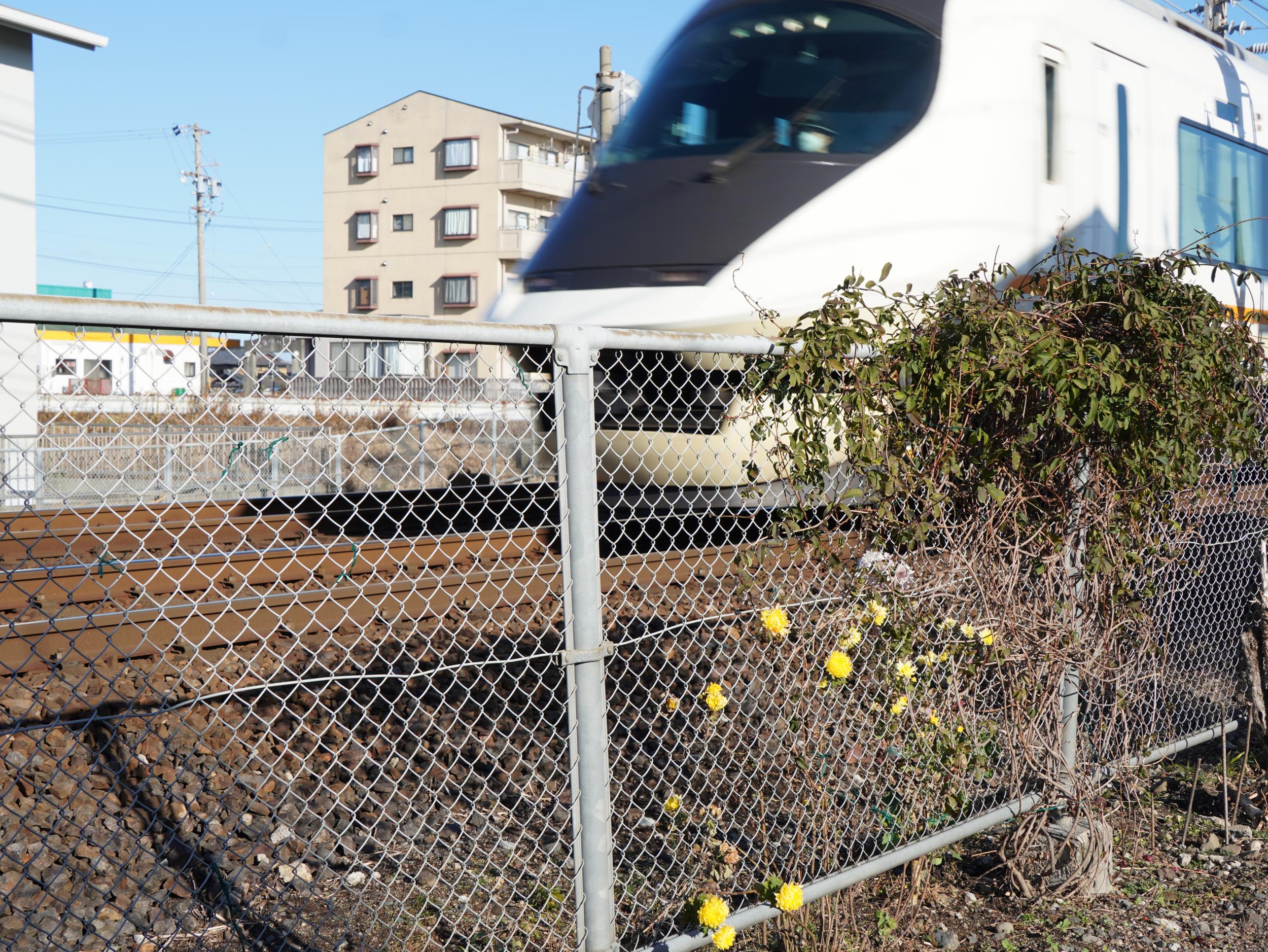 線路のフェンス内側から外へ首を伸ばしたカンギク、お正月の花だそうです。
