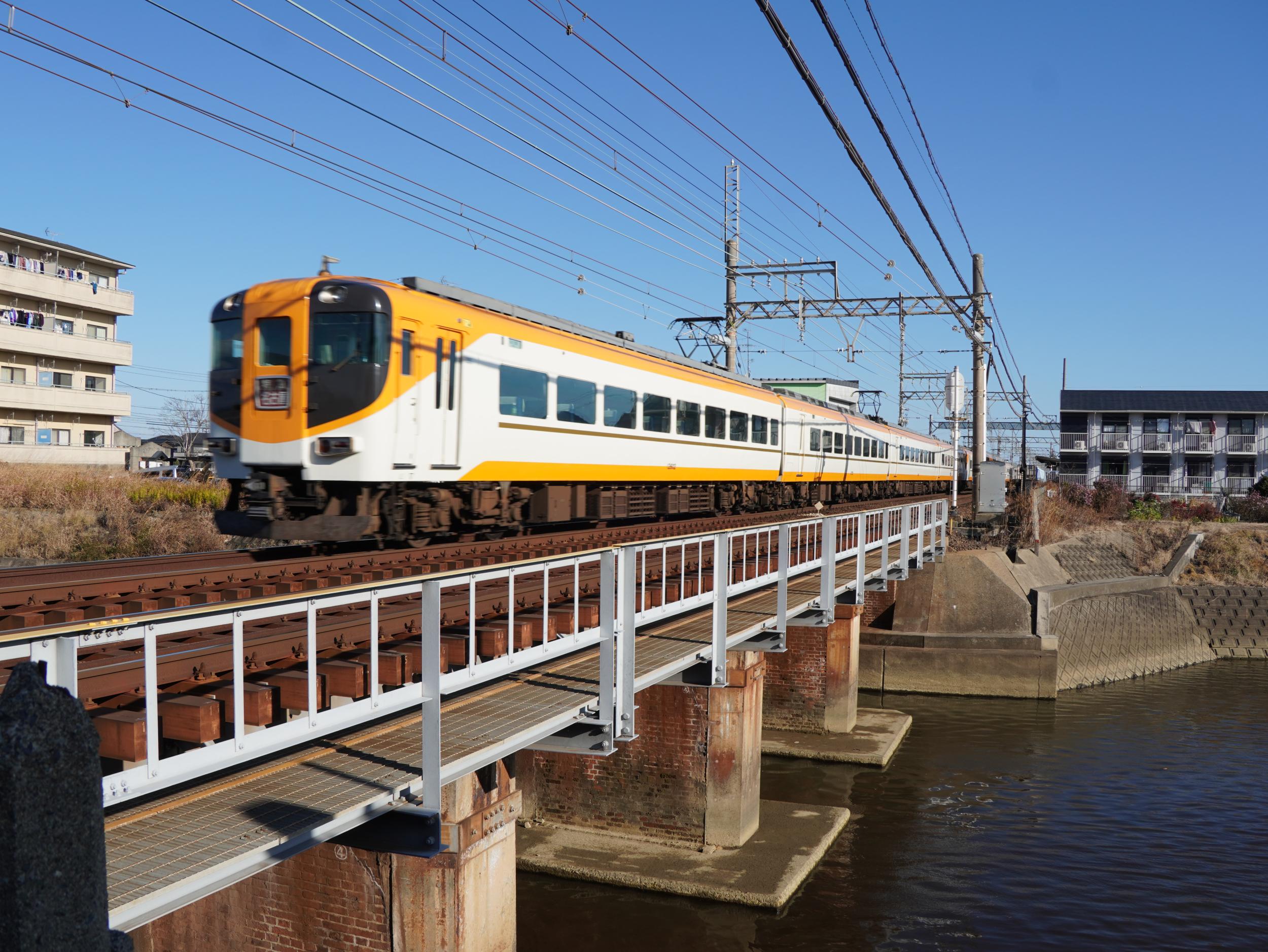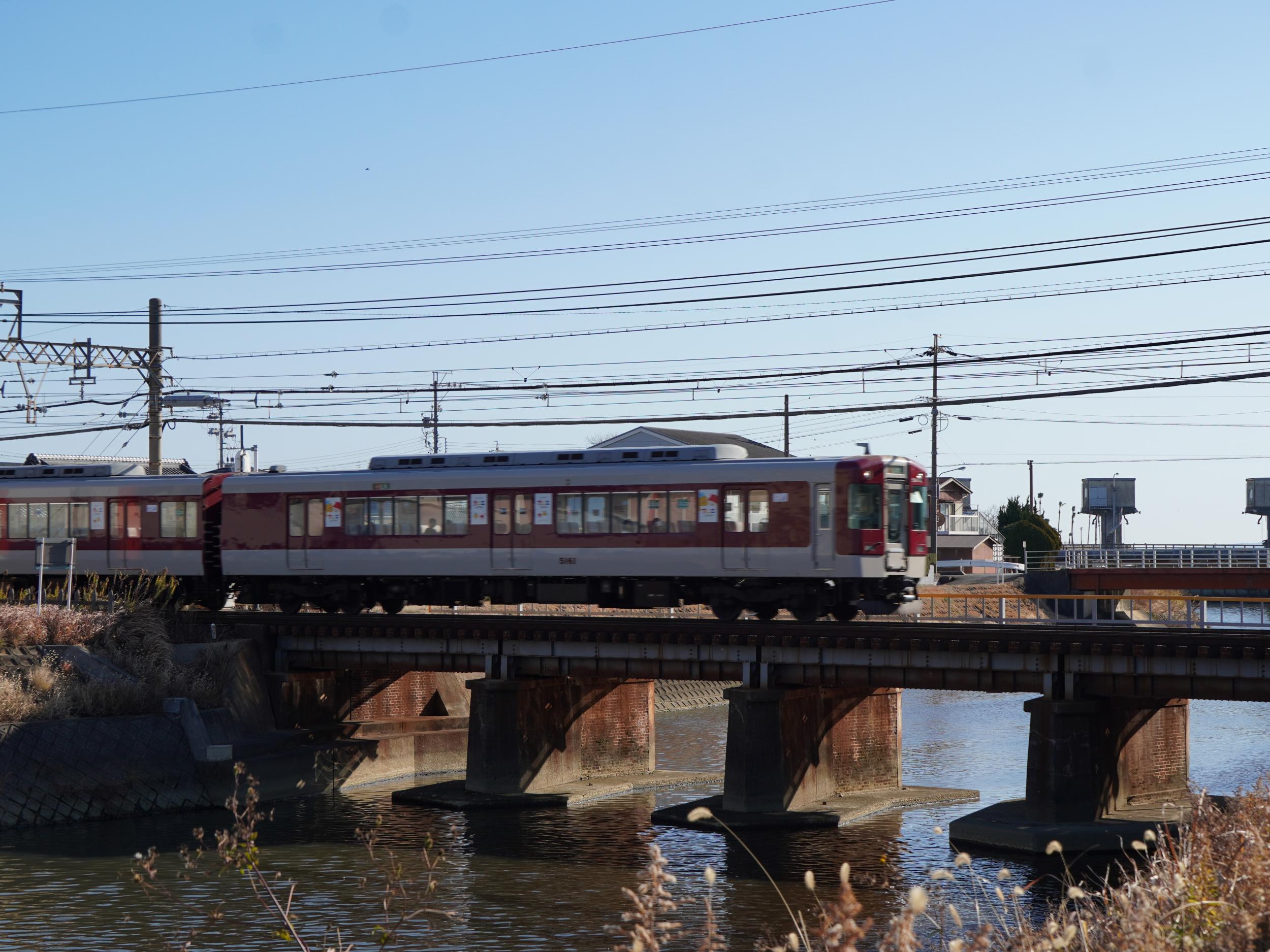 漸く田中川の鉄橋に辿り着きました。サニーカーと逆光の5200系です。