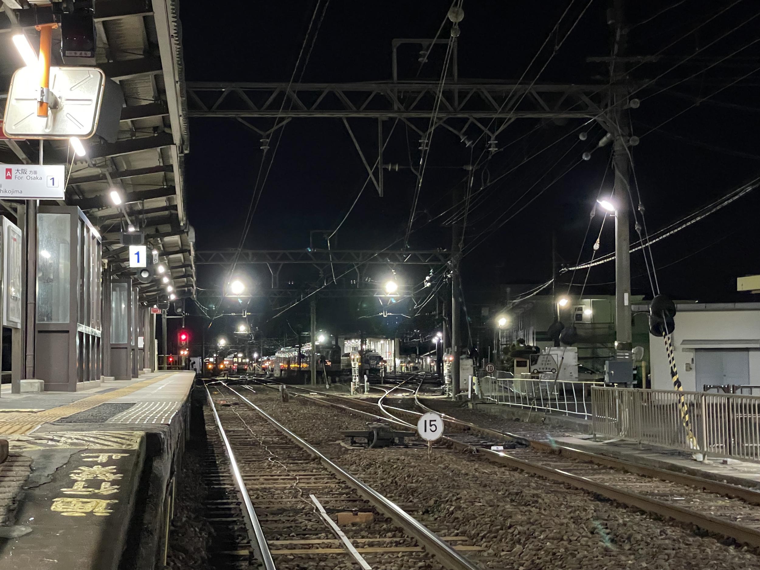 時刻表をチェックすると30分待ち、ブラックニッカのポケット瓶をちびちびやって電車を待ちます。千里駅のトイレは昭和のまんまでした。