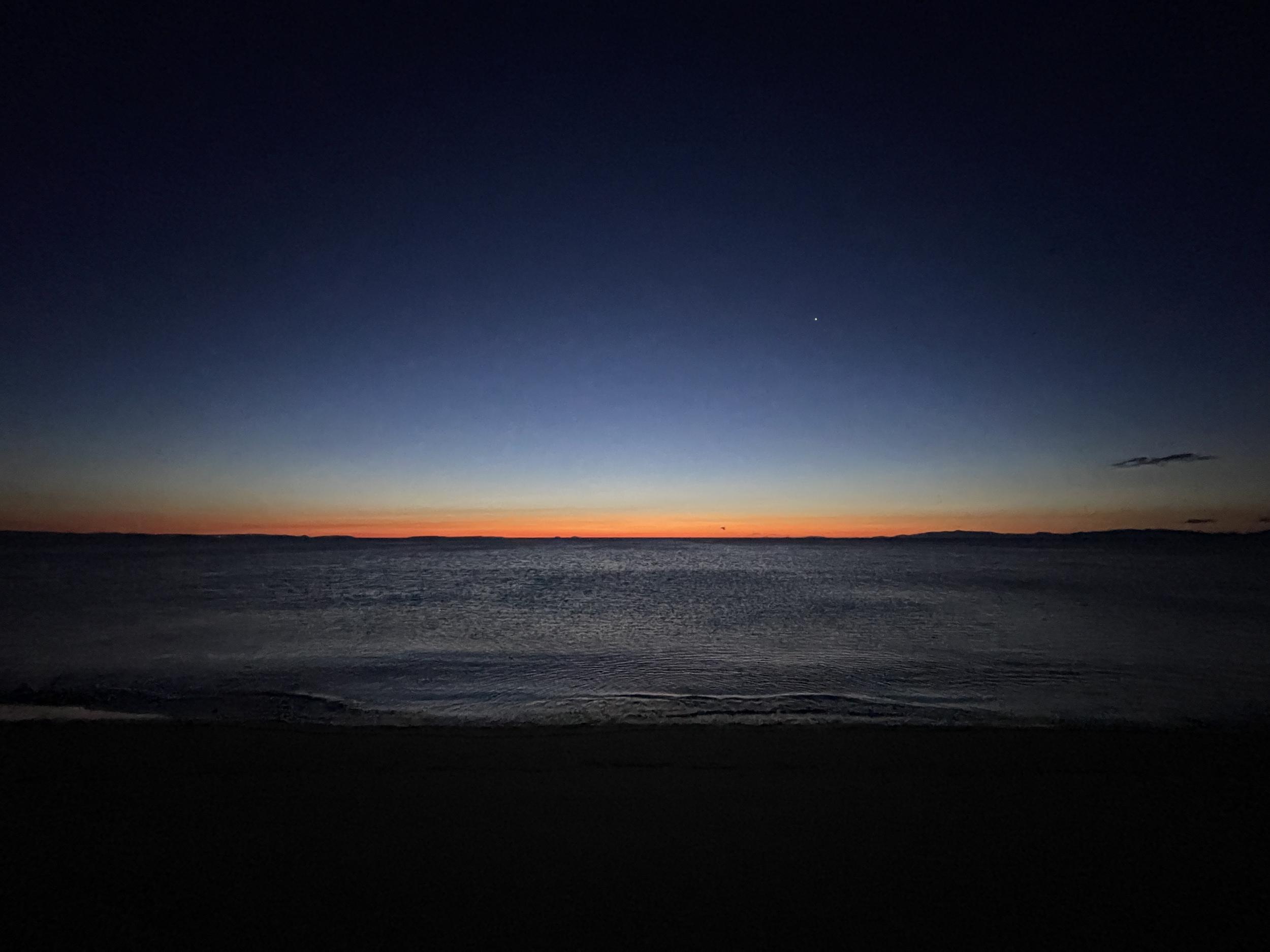 街灯のない真っ暗な道、スマホを懐中電灯にして白塚海岸に出てきました。去年と同じく漁港の北側にしました。